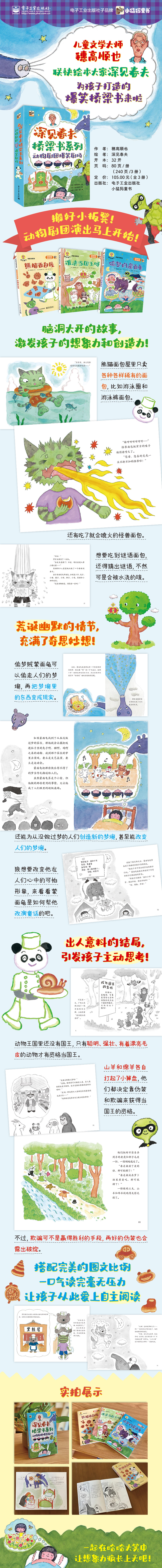 动物剧团爆笑剧场要开始演出啦!你喜欢什么样的面包呢?在《熊猫面包屋》中,你能看到各种稀有的面包,比如吃了会喷火的怪兽面包、吃了会像气球充气一样的膨胀面包……快来瞧一瞧吧!小朋友们,你们班的班长是怎么选定的?在《谁来当国王呀》中,*强壮、*聪明,有着*漂亮毛皮的动物才能成为国王。山羊和绵阳使出了浑身解数来竞争国王。*终,谁能如愿呢?大家在睡觉的时候,总是会做梦吧?但有时候明明做梦了,可一觉醒来梦就忘得一干二净了。告诉你吧,那是因为你的梦被小偷偷走了。在《偷梦的蒙面龟》中,你就能看到那只偷梦的乌龟啦!