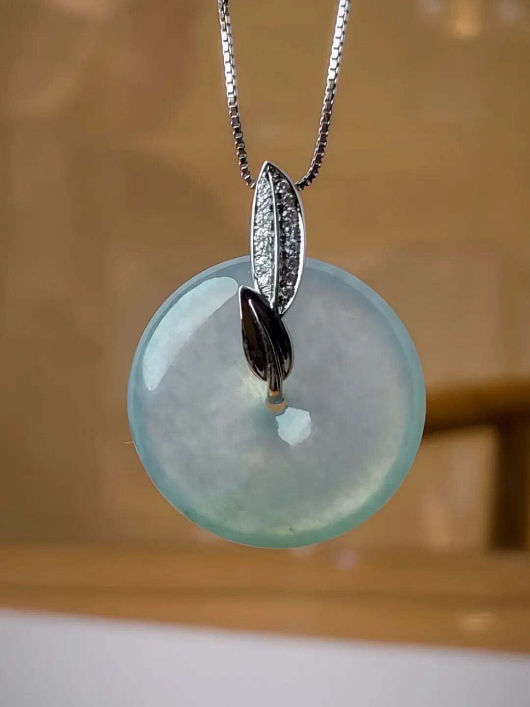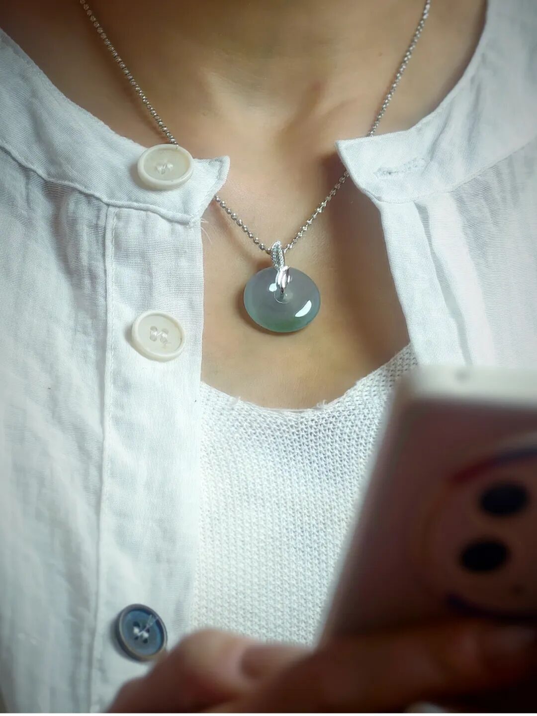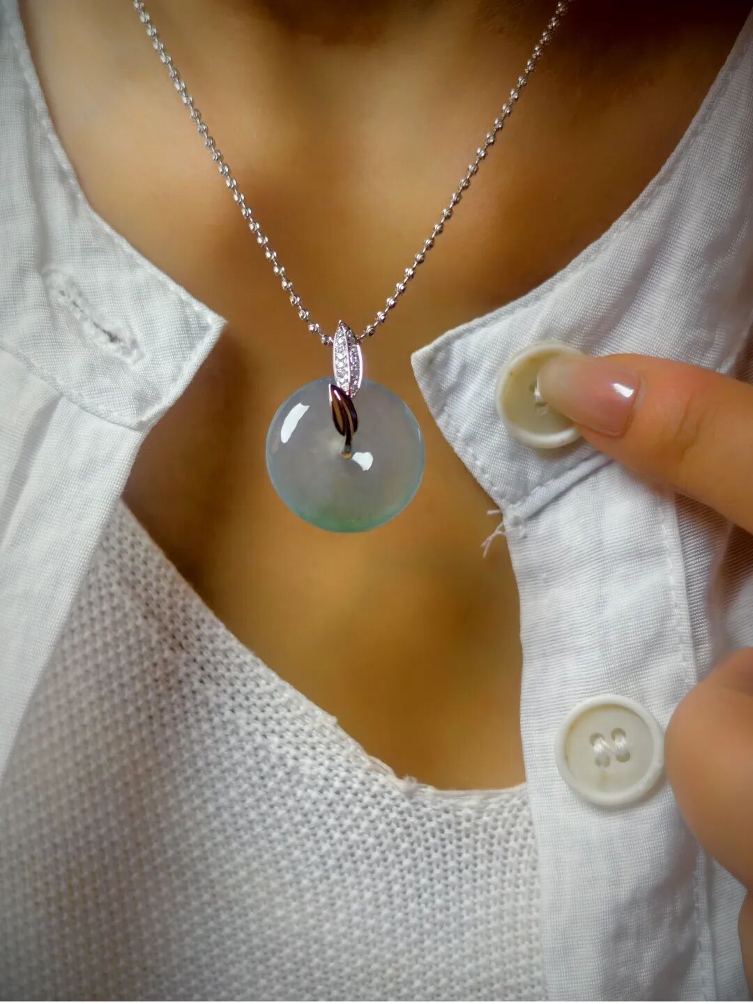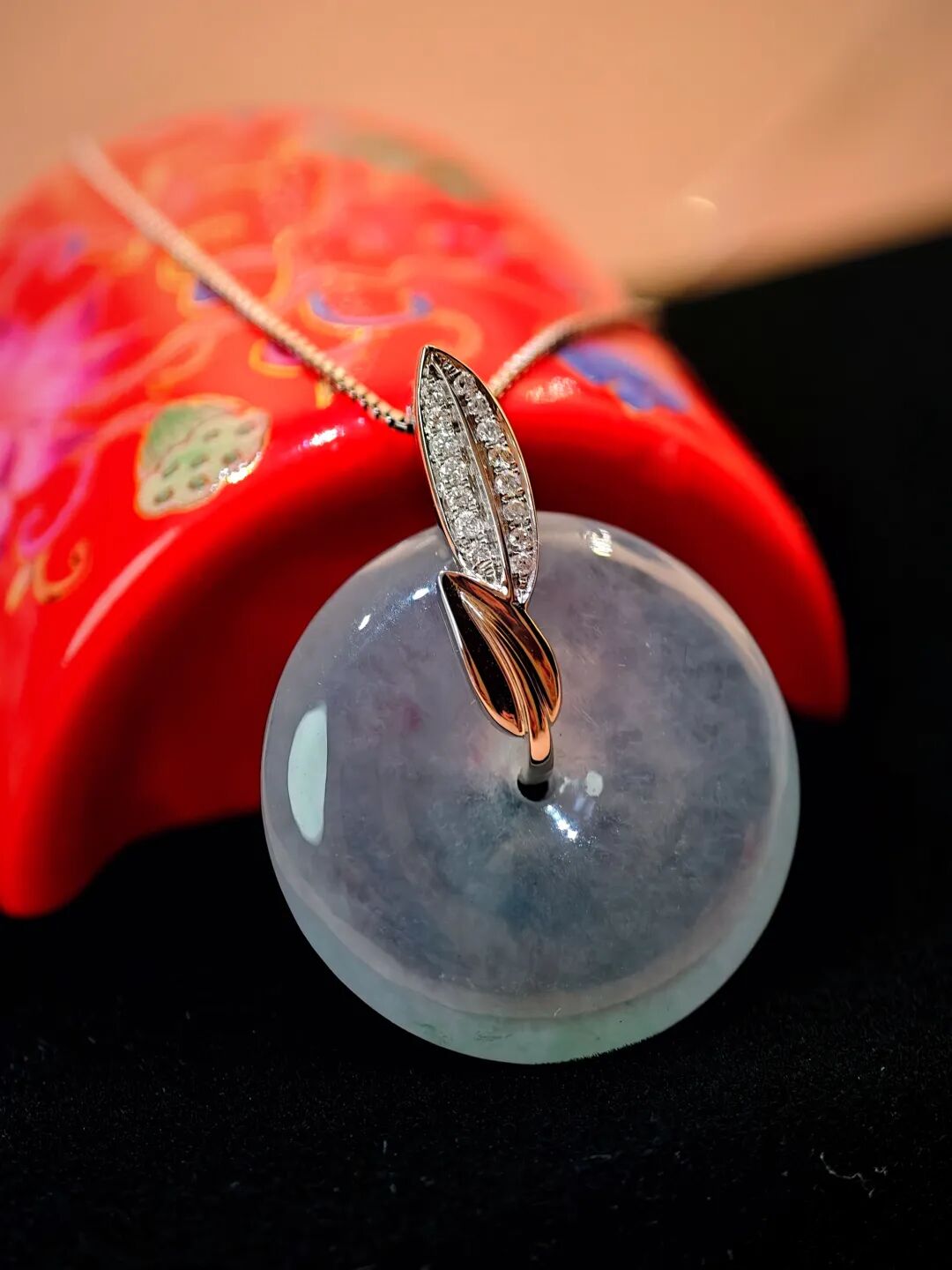 - 质感上,白色18K金的冷调光泽与这件翡翠平安扣的温润底色形成绝妙应和,既衬得翡翠愈发冰透莹润,又让钻石的光芒更显纯粹闪耀,整体色调干净统一,透着极简高级感。
