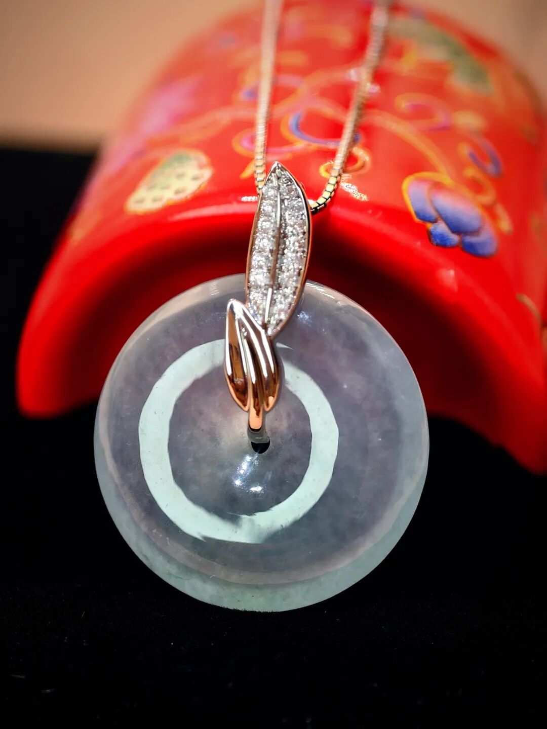 在中式珠宝的长河里,翡翠平安扣始终是绕不开的经典。它以圆润无缺的造型,承载着人们对平安团圆的朴素祈愿,是跨越时光的情感信物。而今天要与大家分享的这款翡翠平安扣,却在传统之的器型上,注入了令人眼前一亮的巧思—— 以竹叶为笔,以18K金与钻石为墨,在方寸之间勾勒出东方美学的独特韵味。