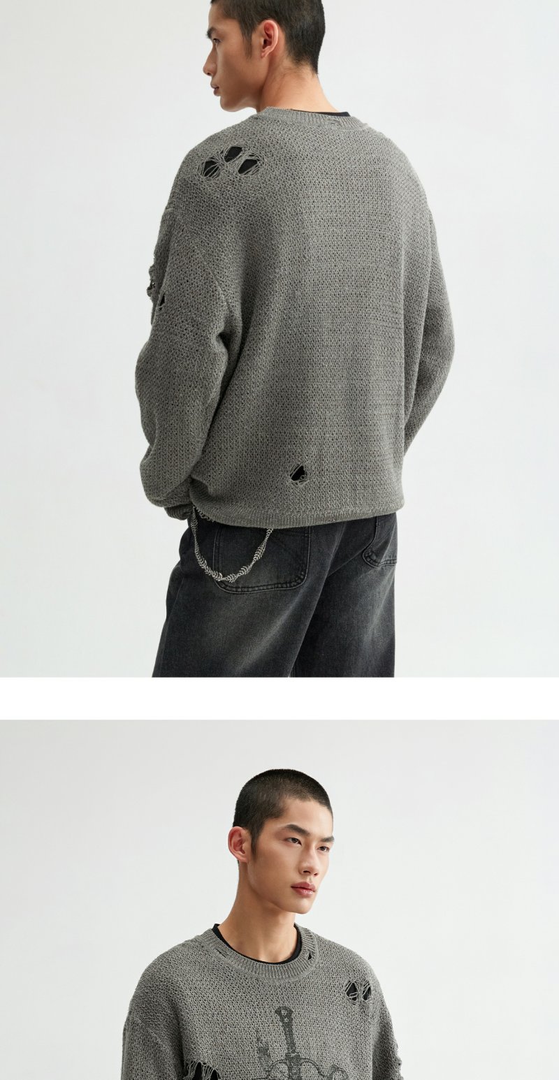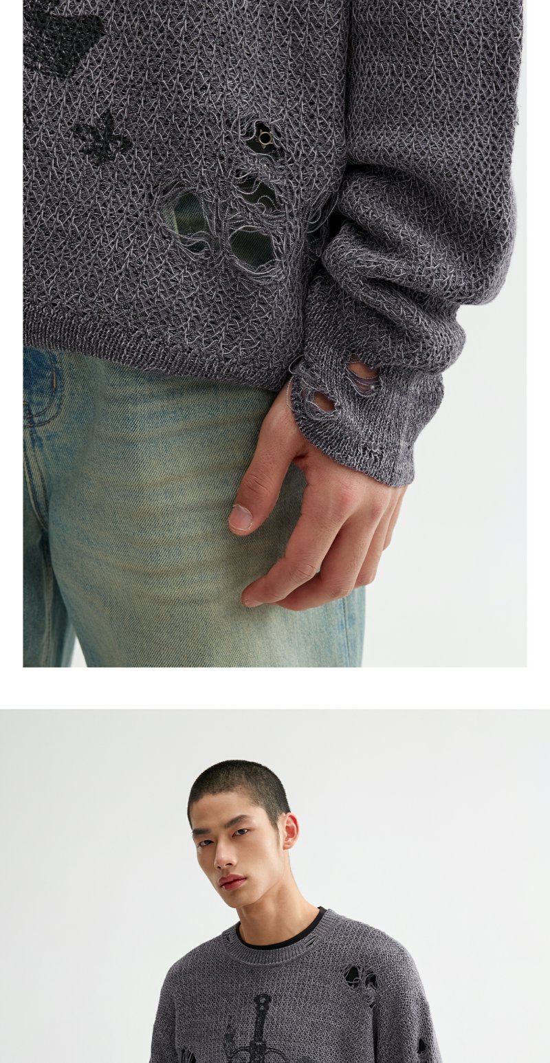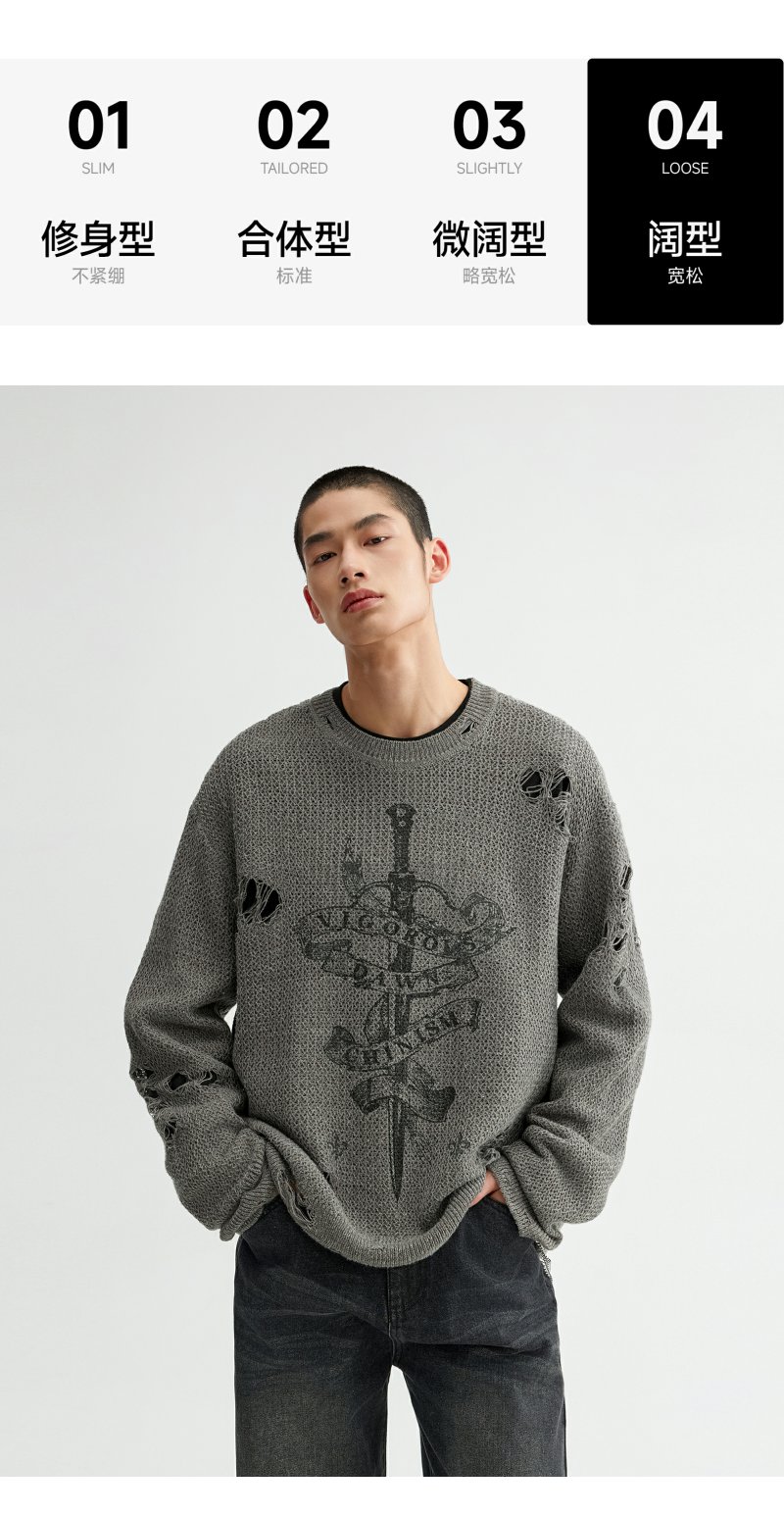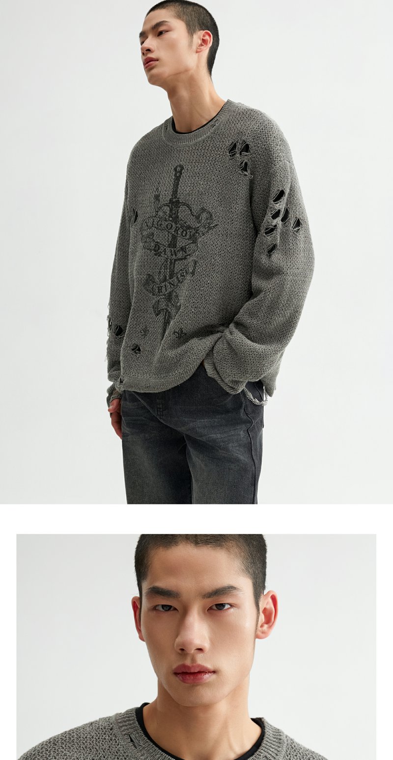 CHINISM折扣季 破洞圆领毛衣男秋季宽松套头上衣慵懒休闲针织衫