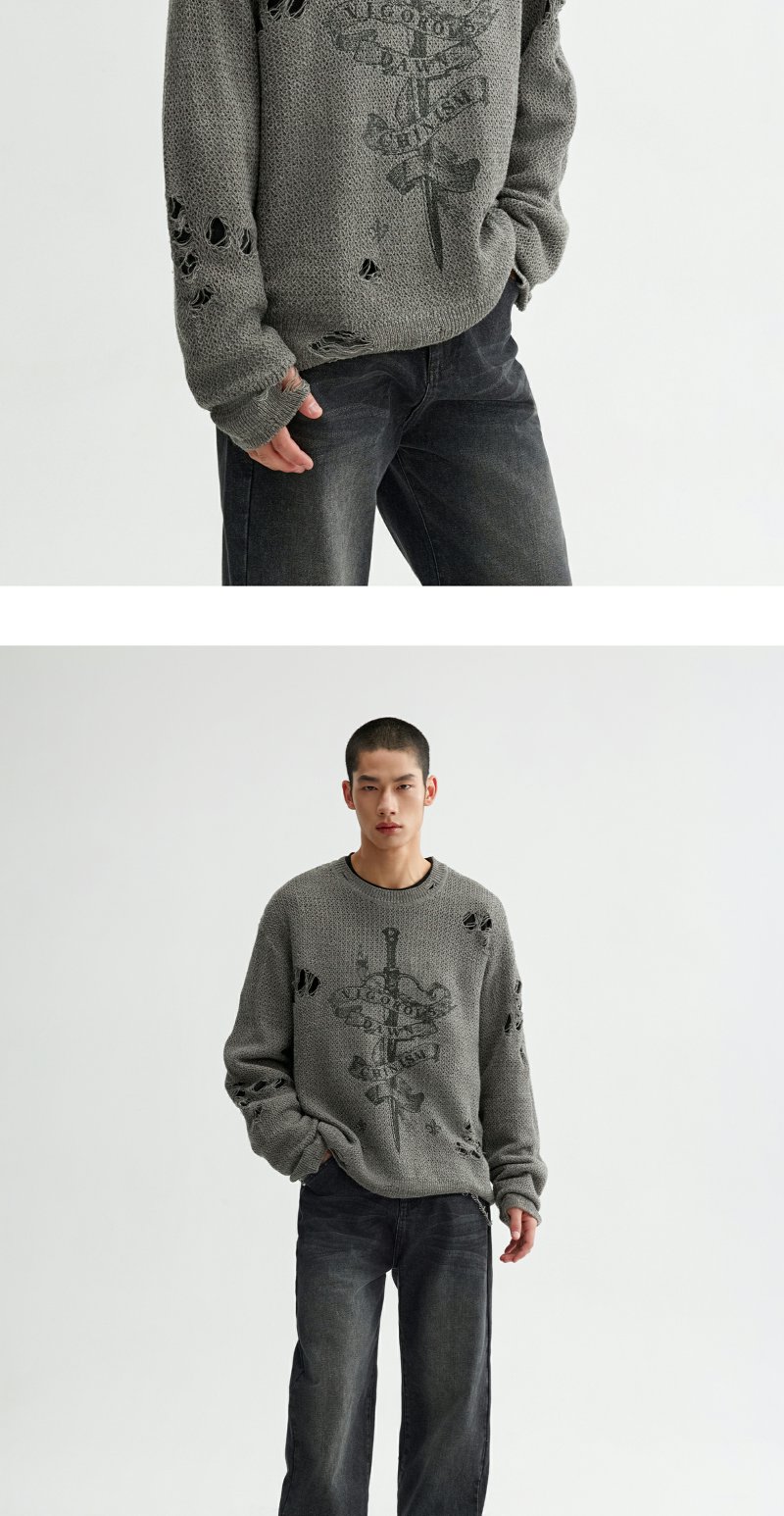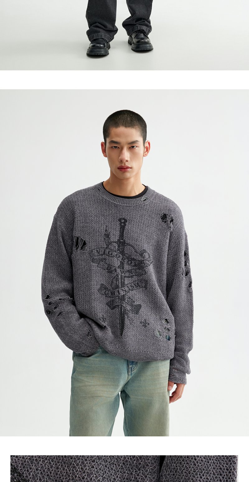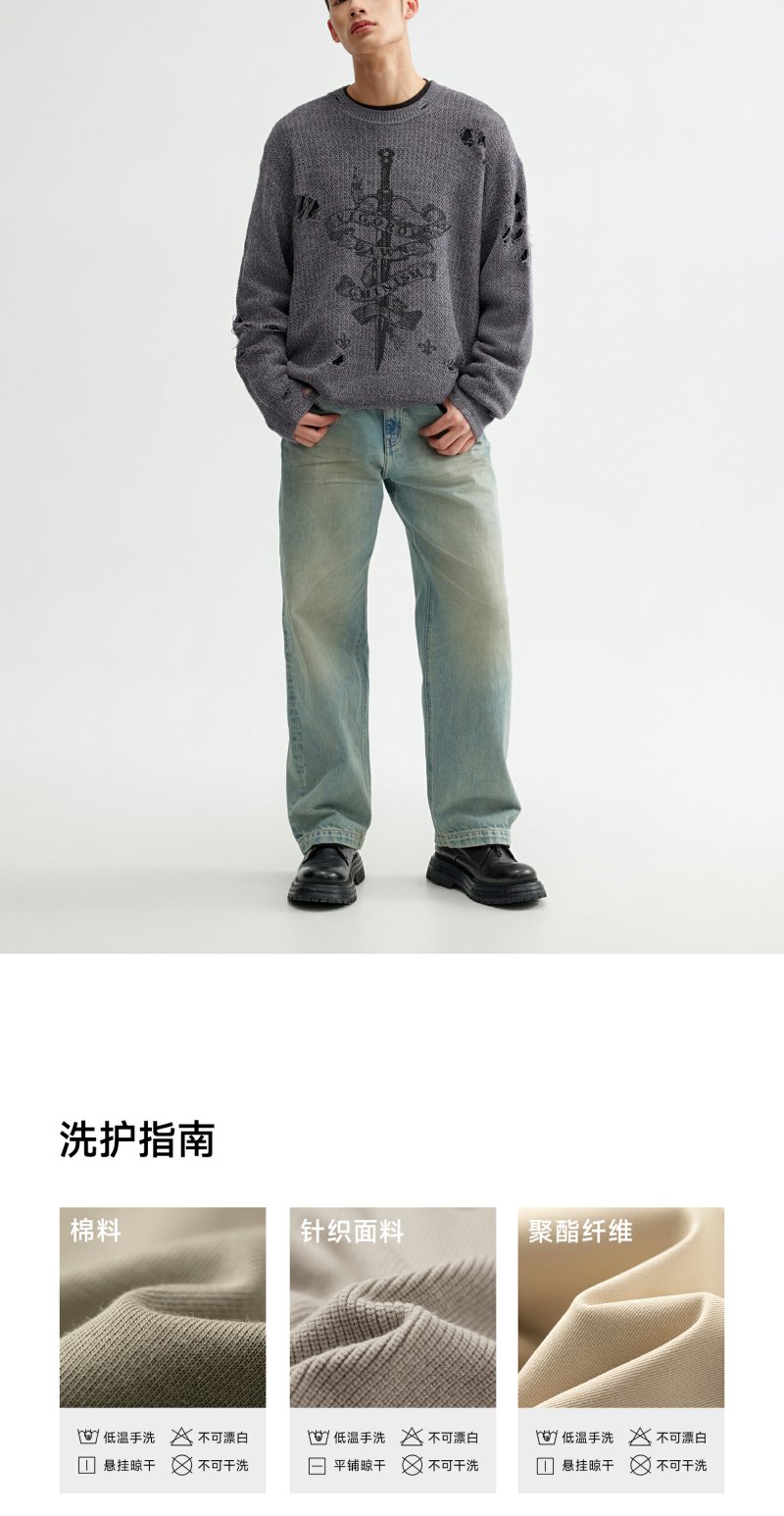 CHINISM折扣季 破洞圆领毛衣男秋季宽松套头上衣慵懒休闲针织衫
