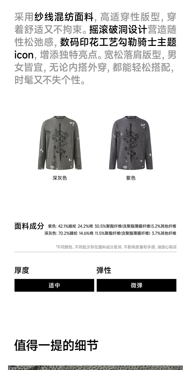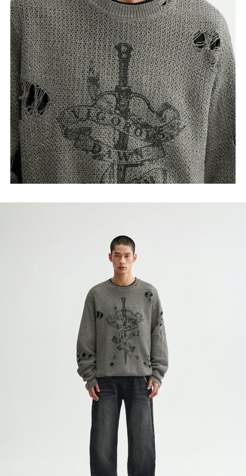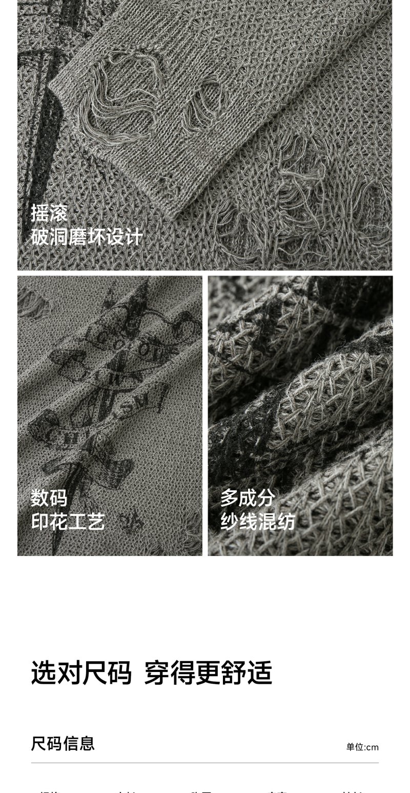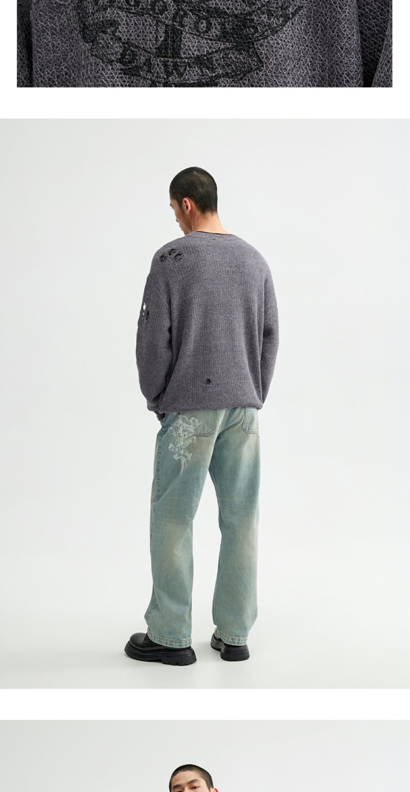 CHINISM折扣季 破洞圆领毛衣男秋季宽松套头上衣慵懒休闲针织衫