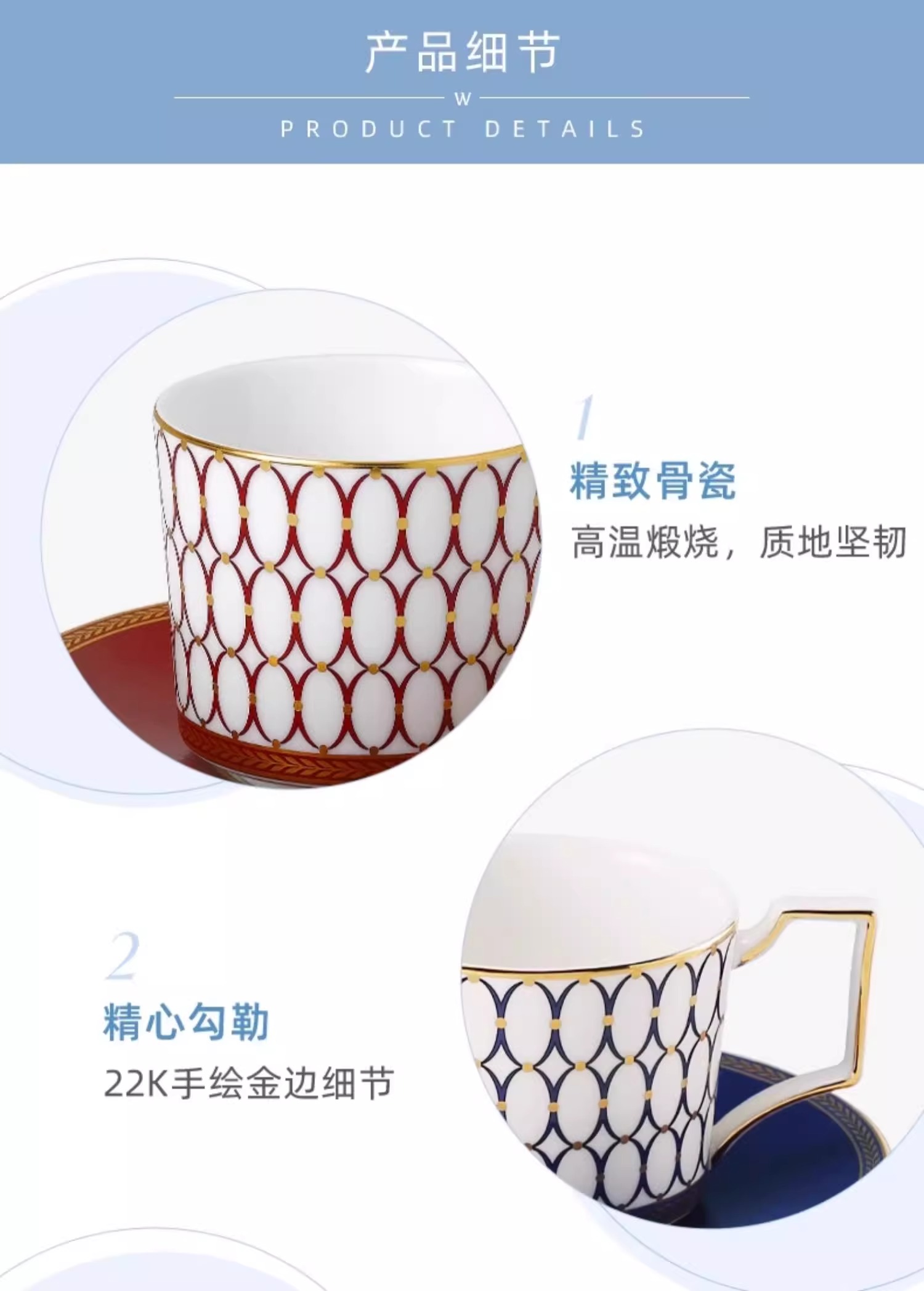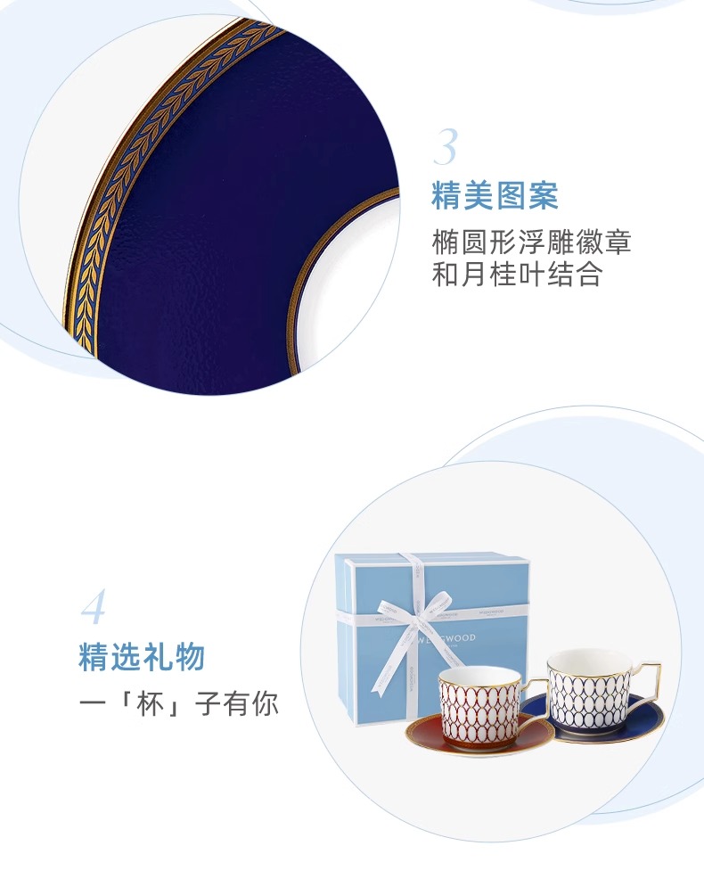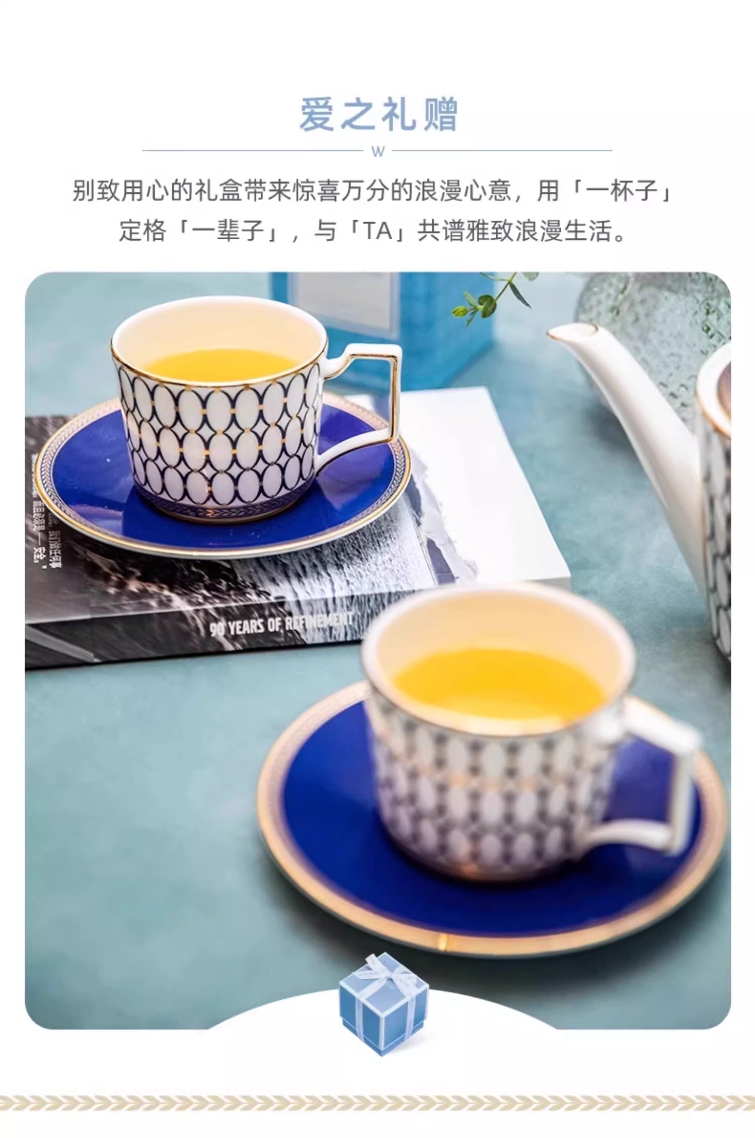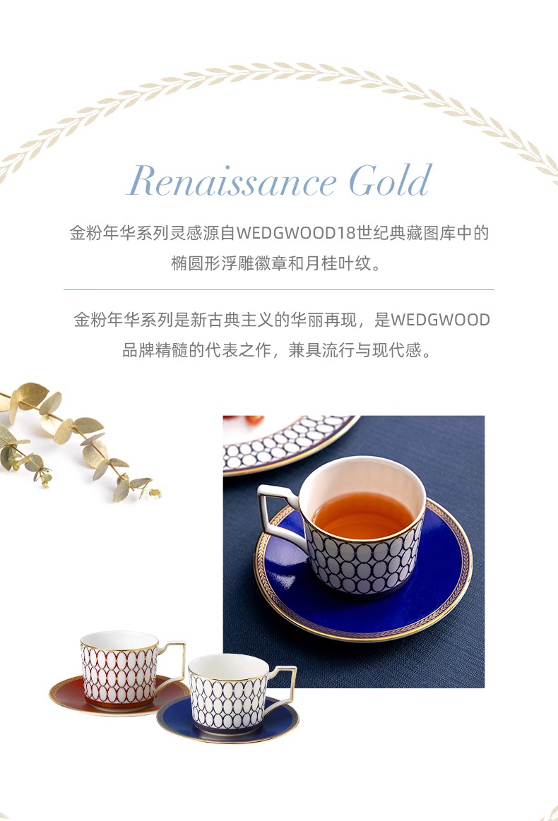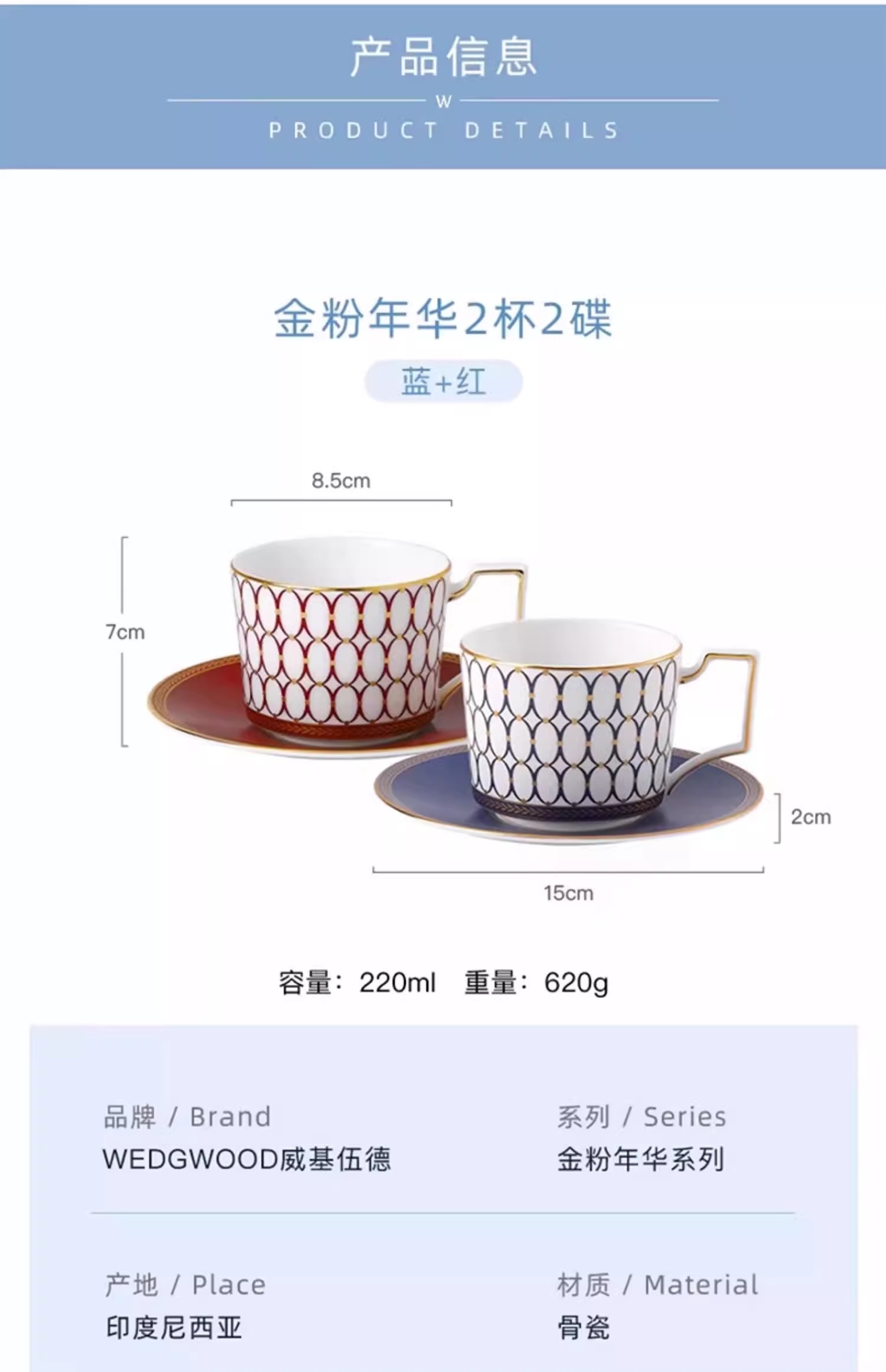 WEDGWOOD金粉年华2杯2碟骨瓷咖啡杯精致送礼威基伍德金粉年华婆金红+午夜蓝2杯2碟套装