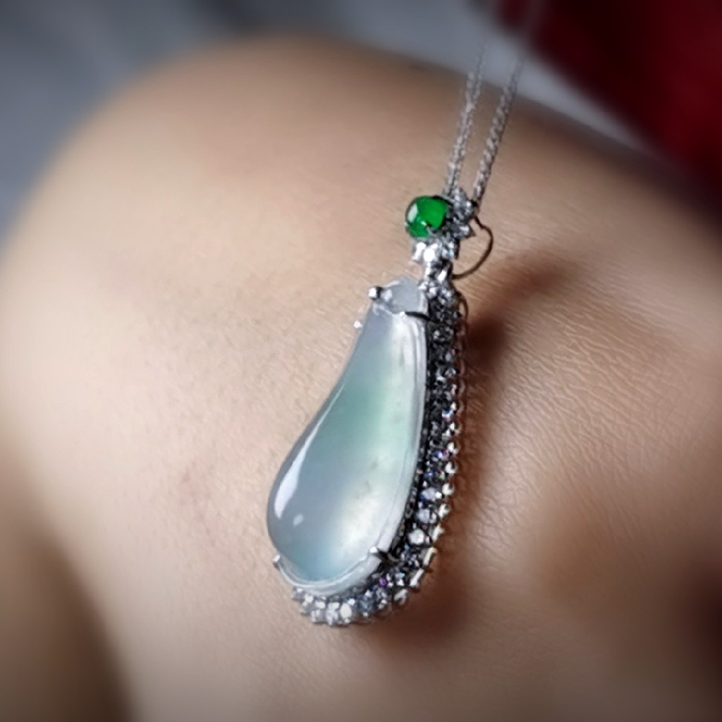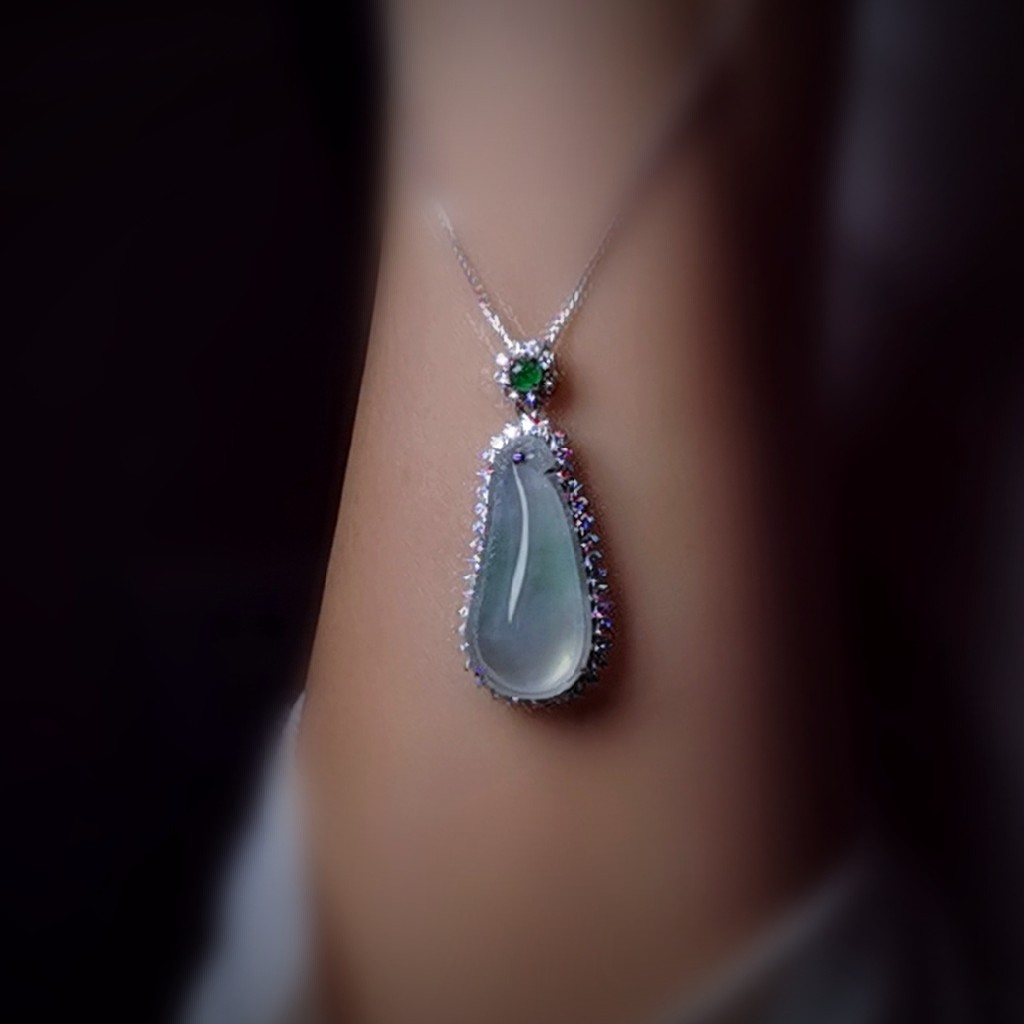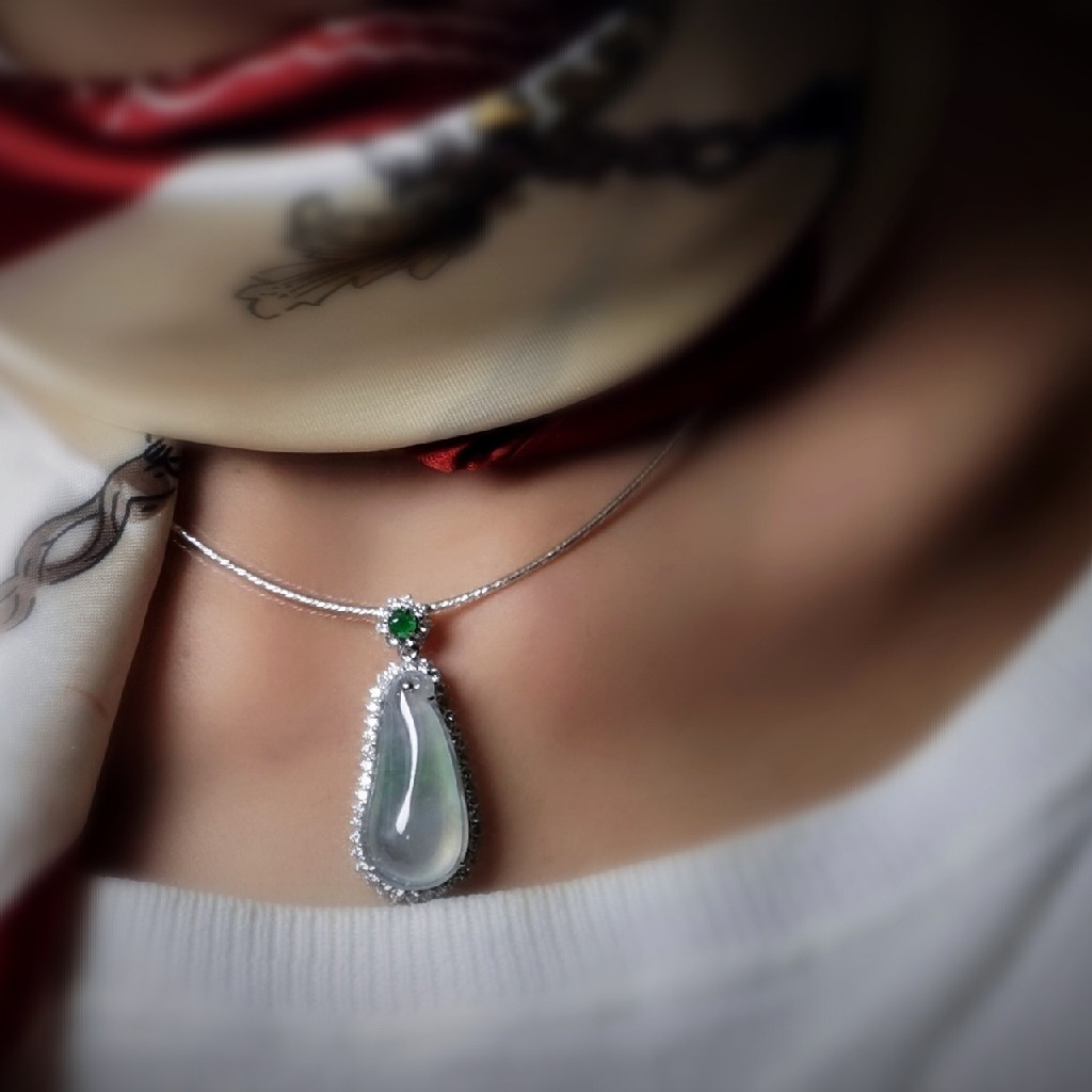 18k简单的围钻镶嵌款式,配镶的小翡翠色辣种好搭配优质反火的小钻石,相互衬托,使得整体高端大气。是件百搭的精品挂饰。