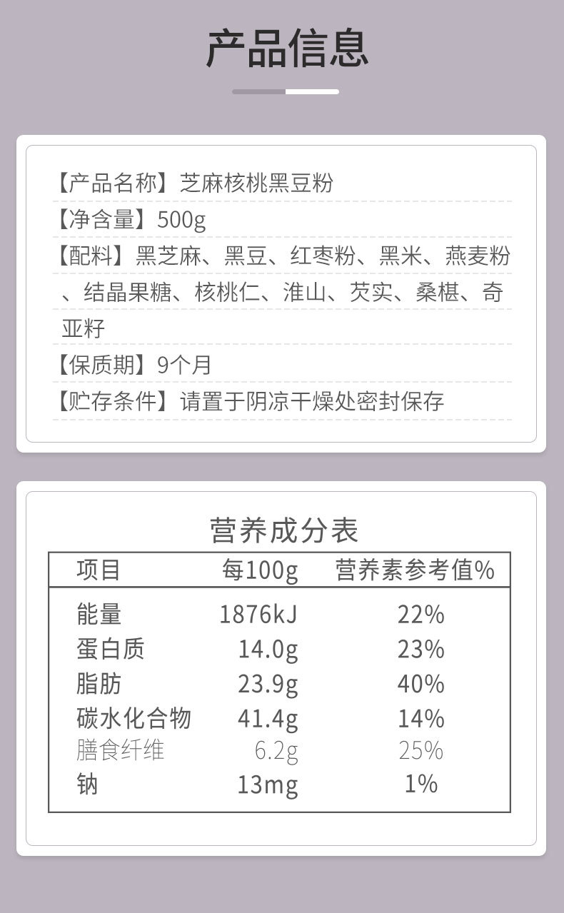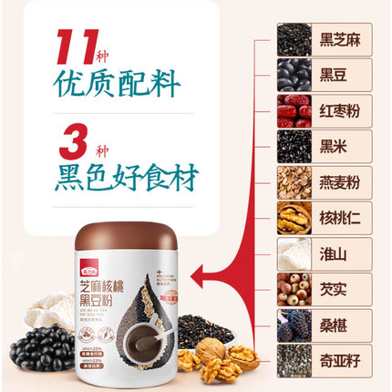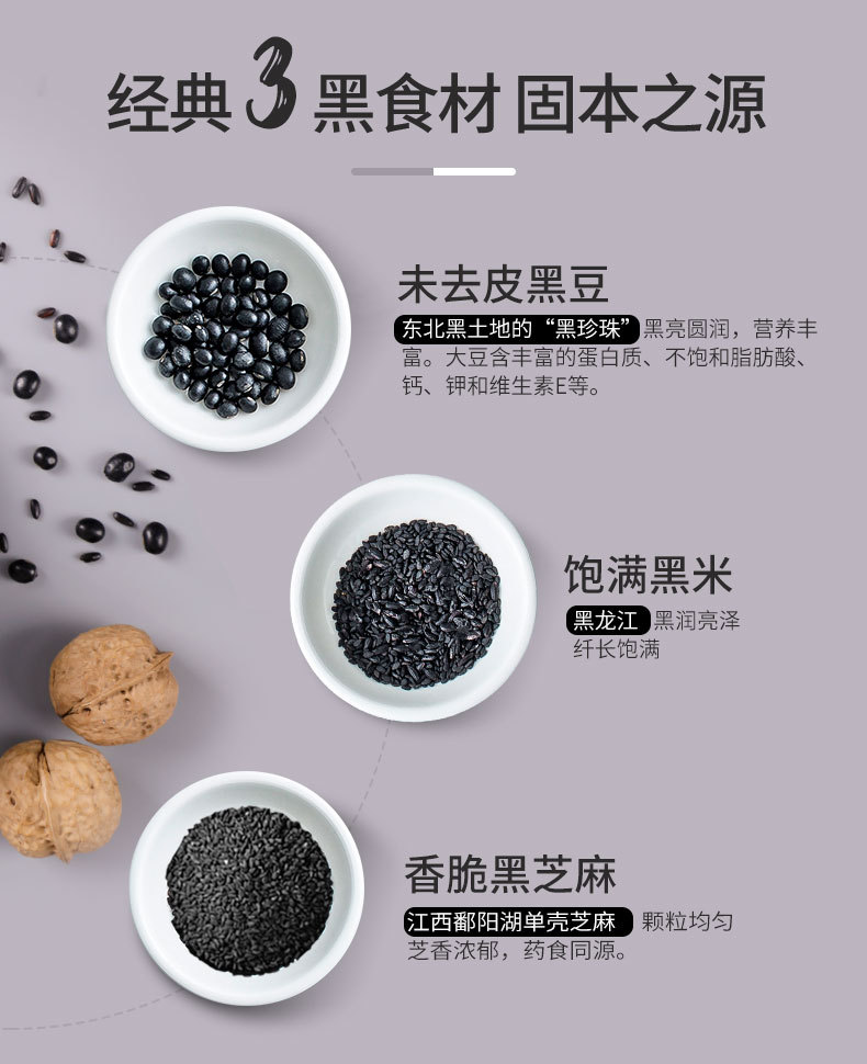 以核桃仁、黑芝麻、黑豆为主的组合,构成黑营养铁三角,再搭配6种天然谷物,一罐满满营养