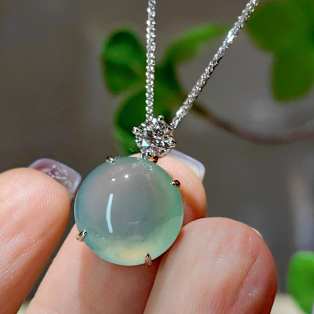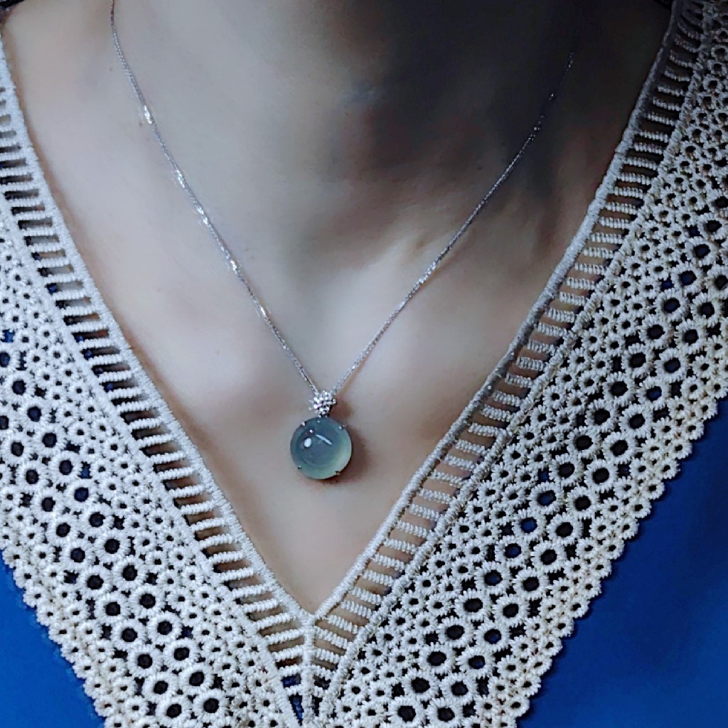 这是一颗直径14mm的圆形翡翠戒面,细腻的种质,晶莹且饱满厚实,它有着晨露沁、午阳晒、暮霭润的湖水蓝色,微光下内部的星星点点棉纹,恰似春来江水绿如蓝湖中,小舟悠悠,船桨起落间带起的成串的水珠坠落,泛起的涟漪......
