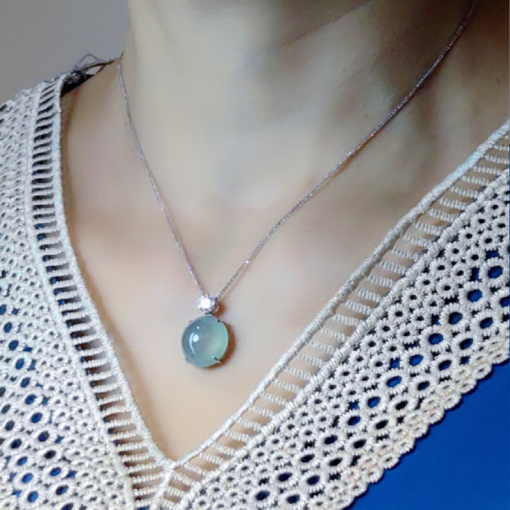 这件“湖光星辰”应常佩戴于锁骨下方,让体温唤醒翡翠“水头”,“玉得人养,色愈润泽”!