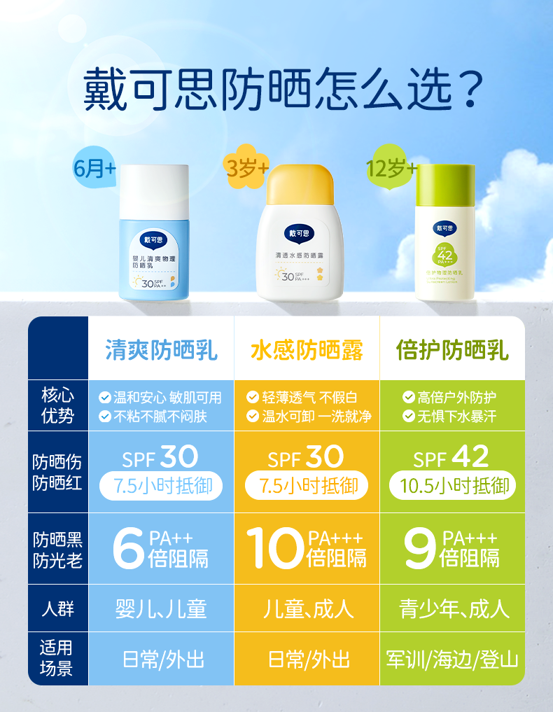 秋冬护肤!【儿童防晒丨 戴可思儿童青少年分龄物理防晒系列】清透水感防晒霜 /备护物理防晒乳 /轻巧便携,清爽不闷肤,轻薄物理防紫外线,随身出行很方便,洁面可清洗无需卸妆,全年龄段均有