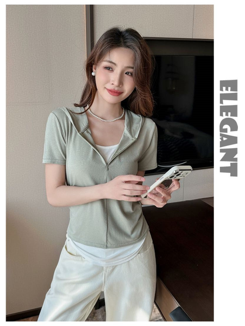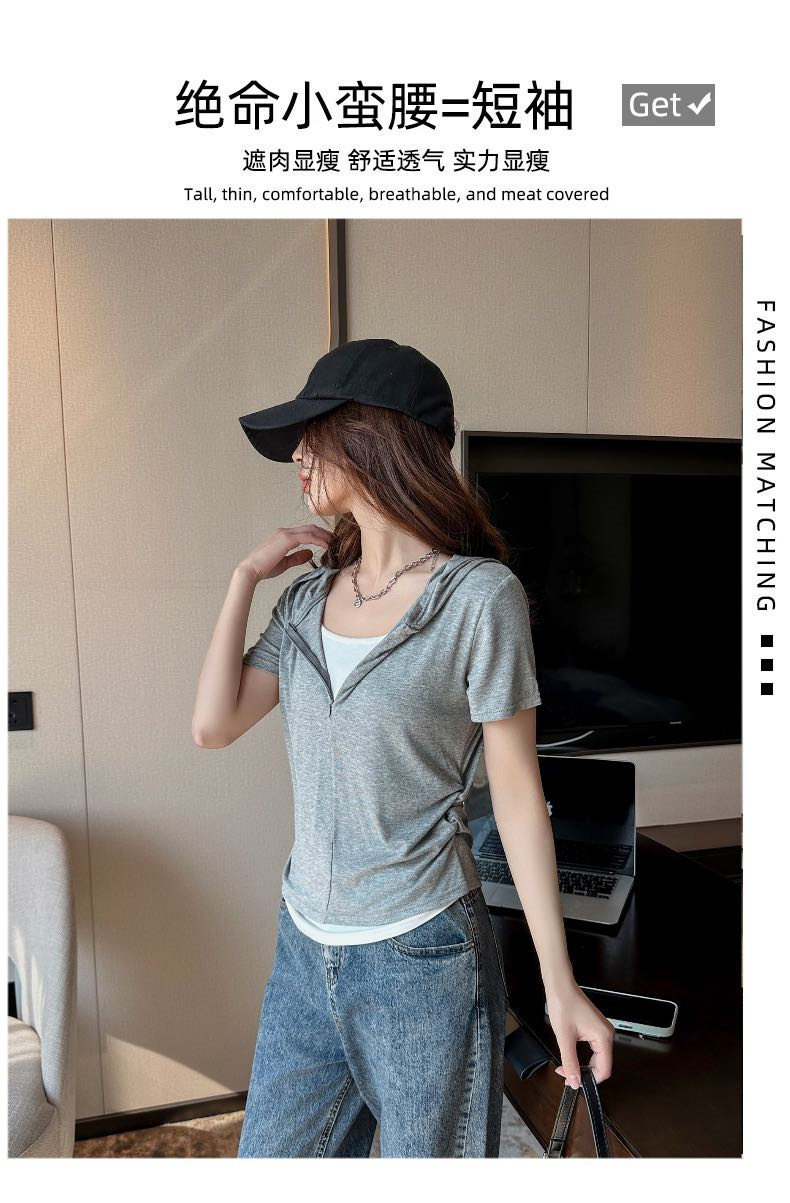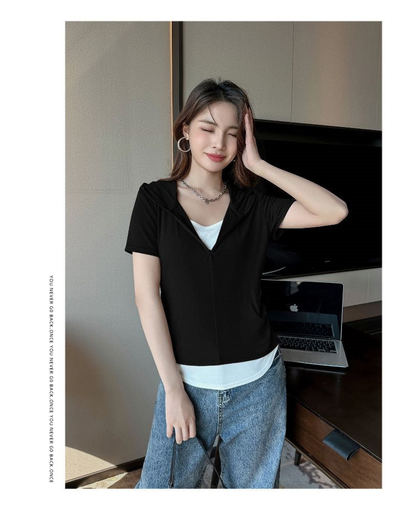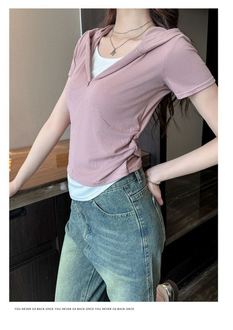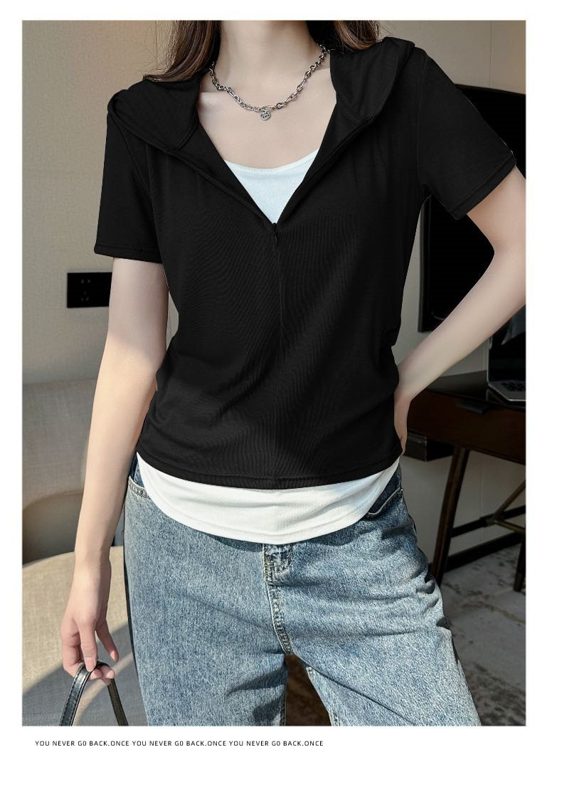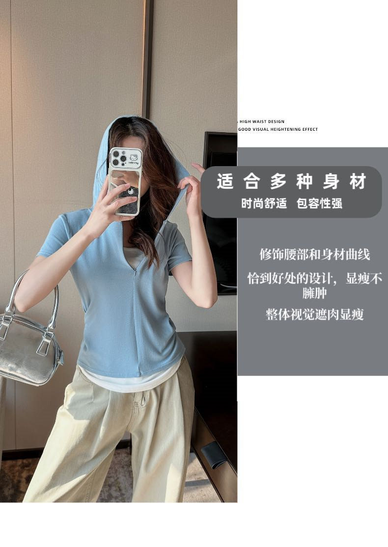 【连帽假两件半拉链短袖t】2025春秋新款修身收腰燕尾时尚百搭短t