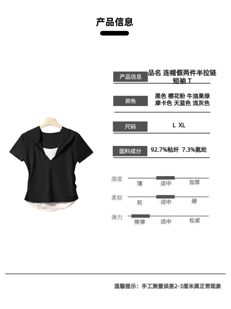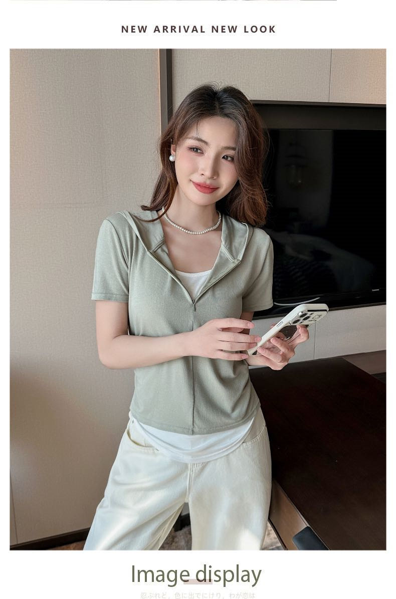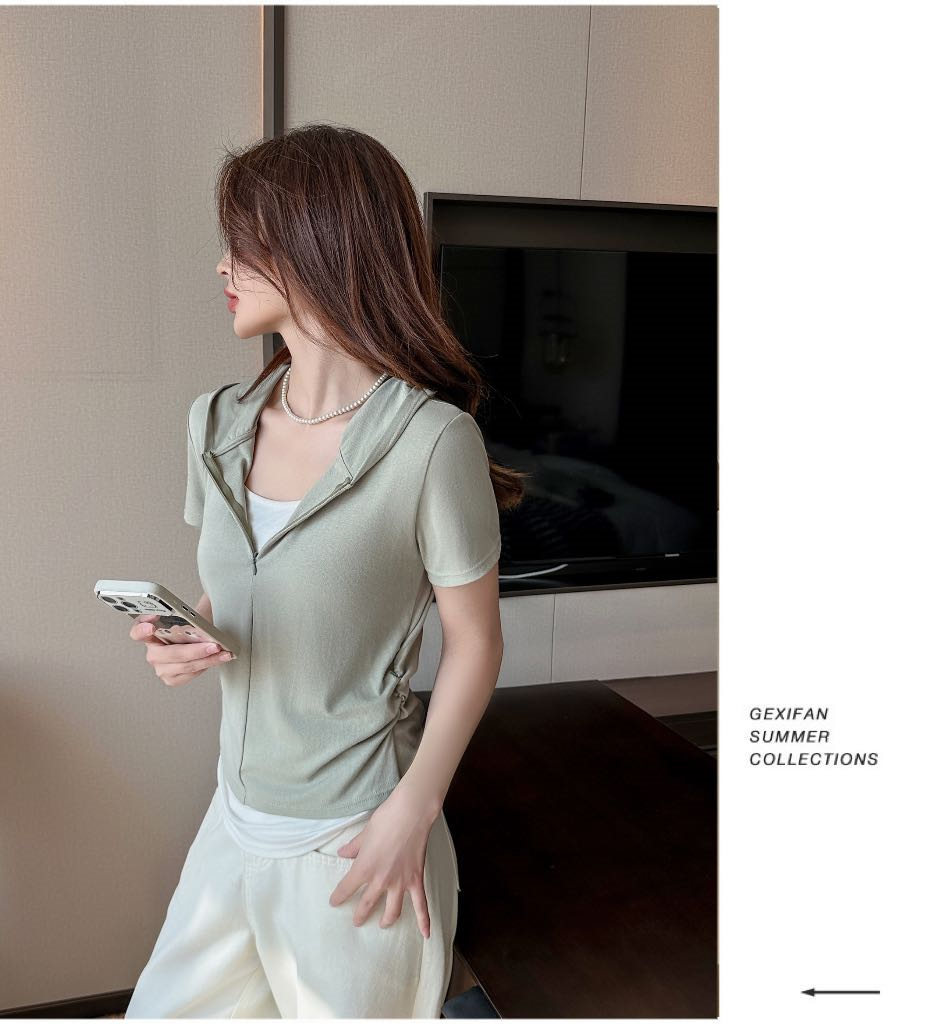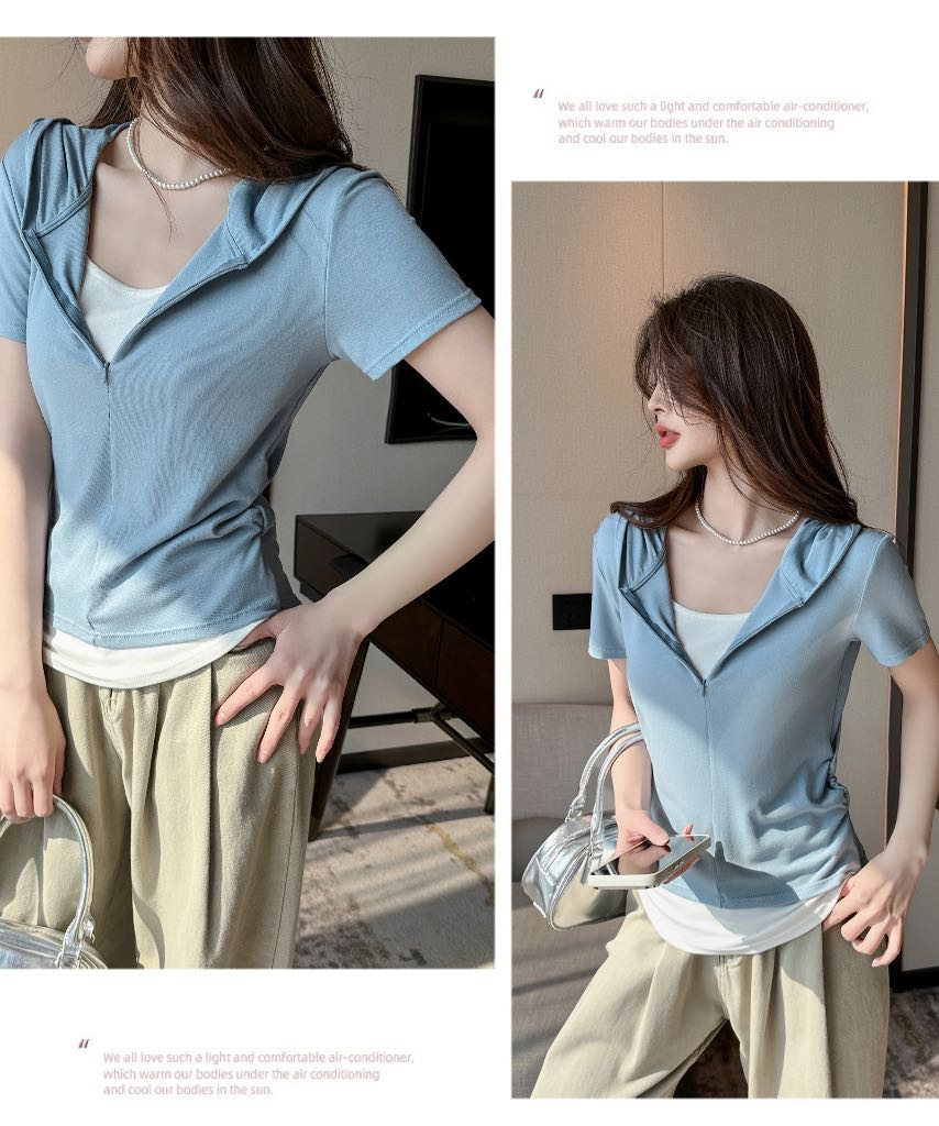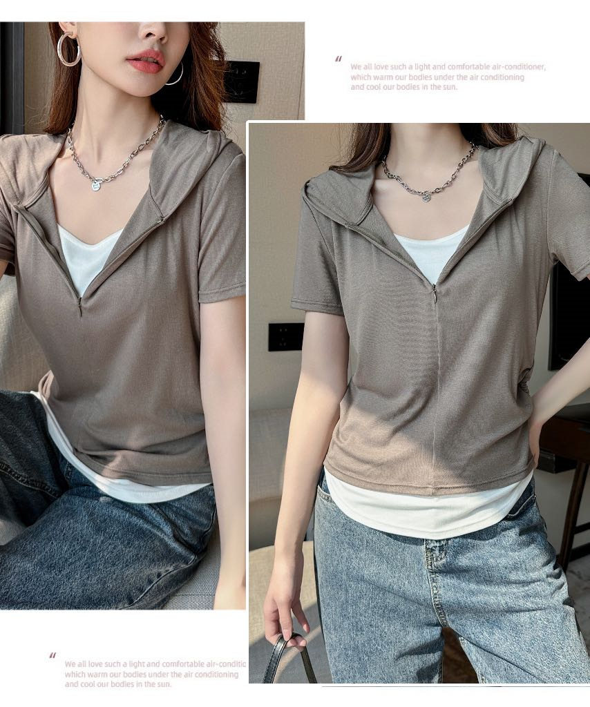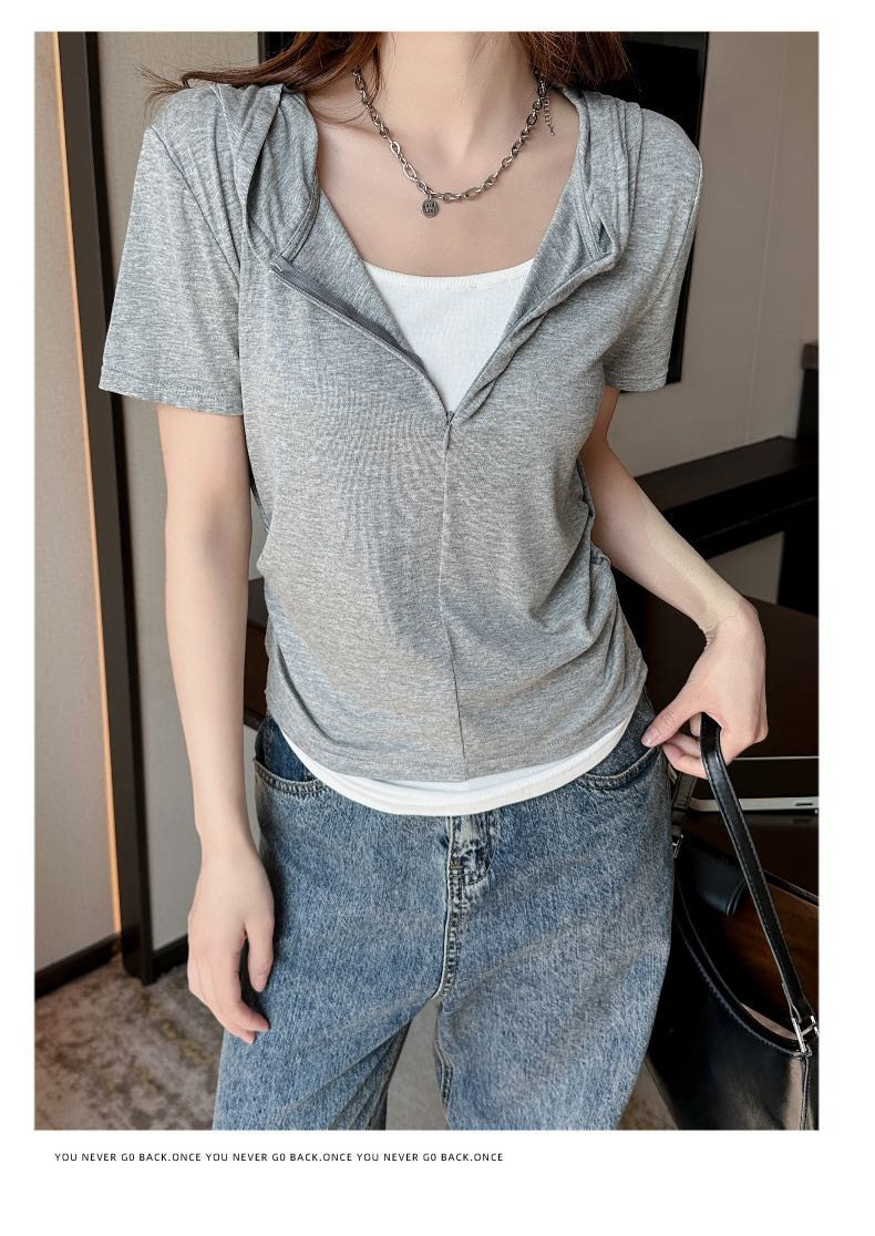 【连帽假两件半拉链短袖t】2025春秋新款修身收腰燕尾时尚百搭短t