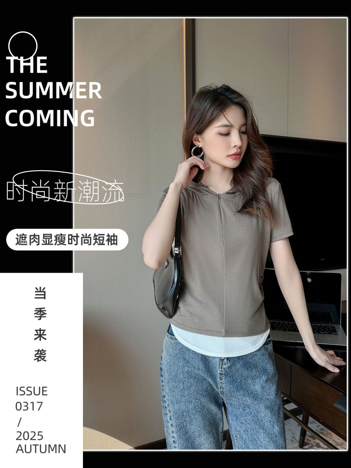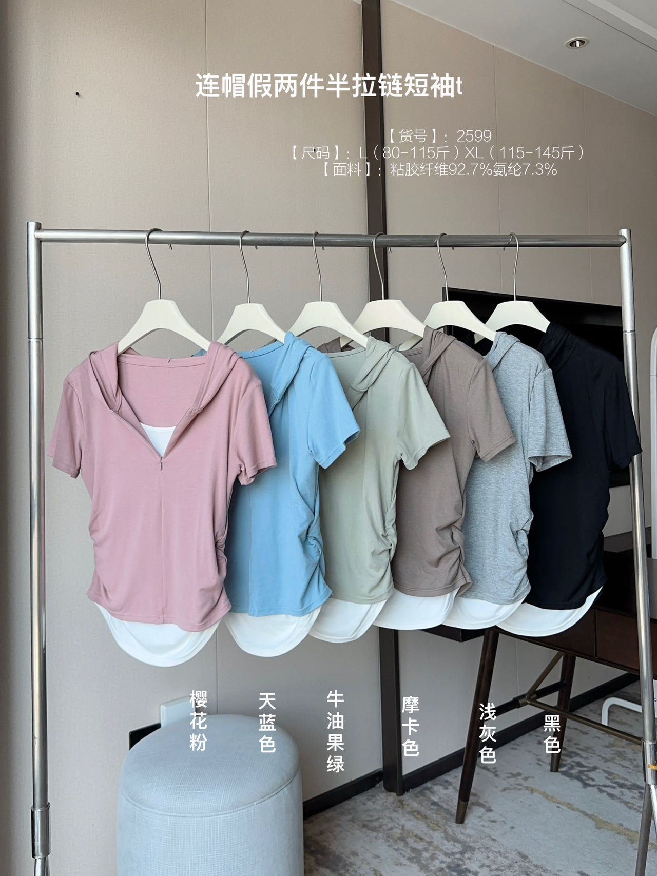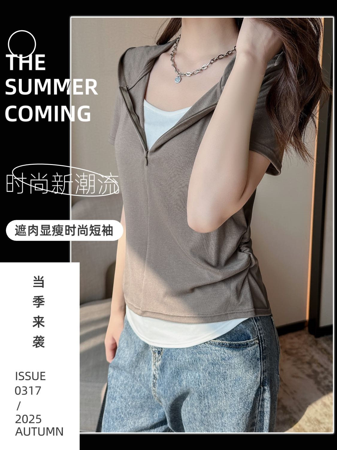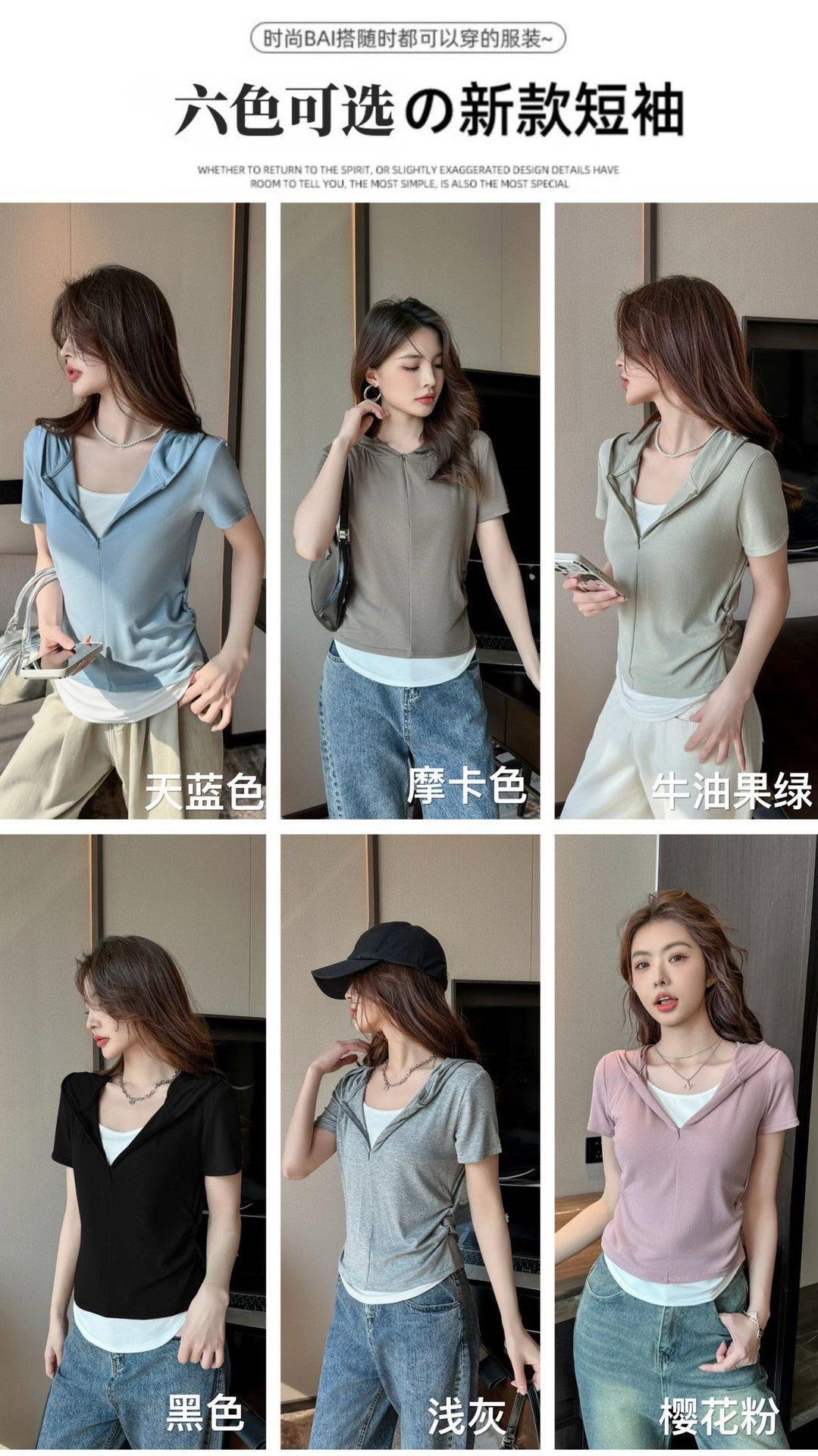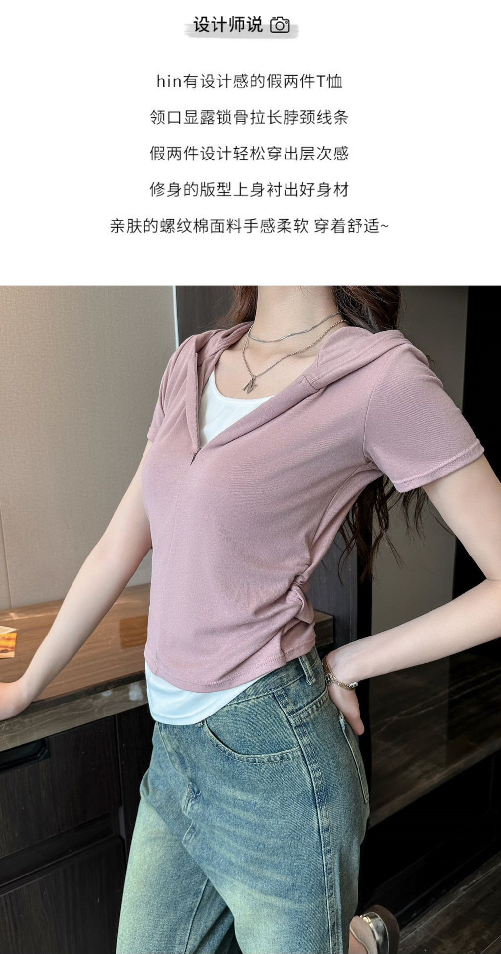【连帽假两件半拉链短袖t】2025春秋新款修身收腰燕尾时尚百搭短t