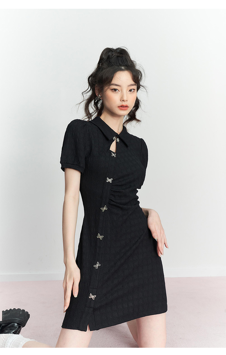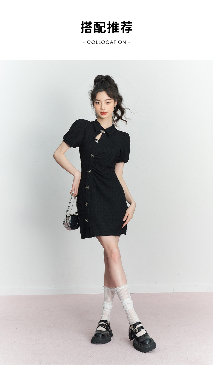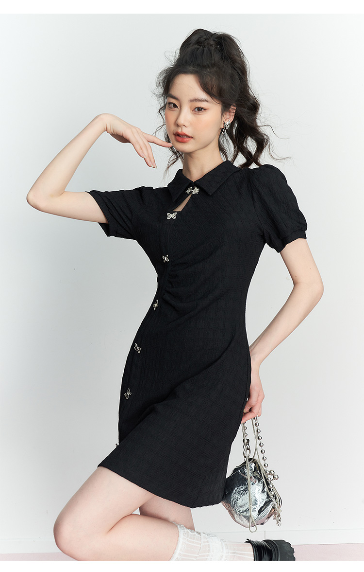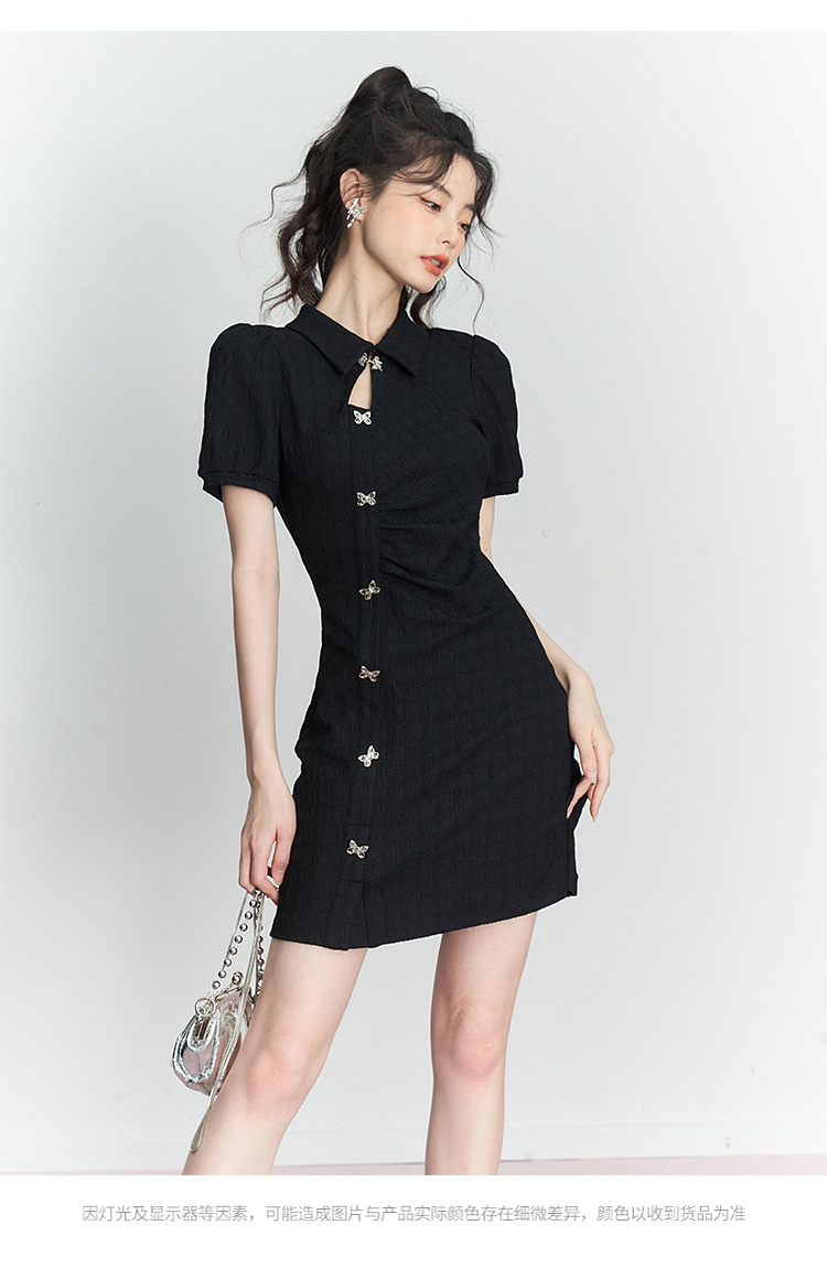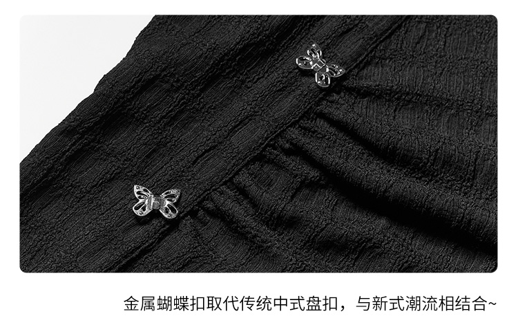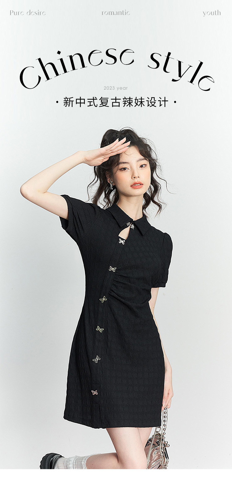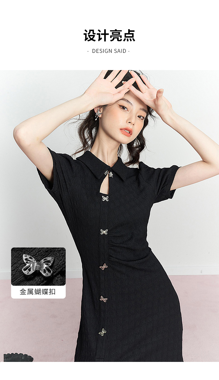 西遇新中式连衣裙女新款POLO领蝴蝶扣禅意黑色旗袍裙V0050552