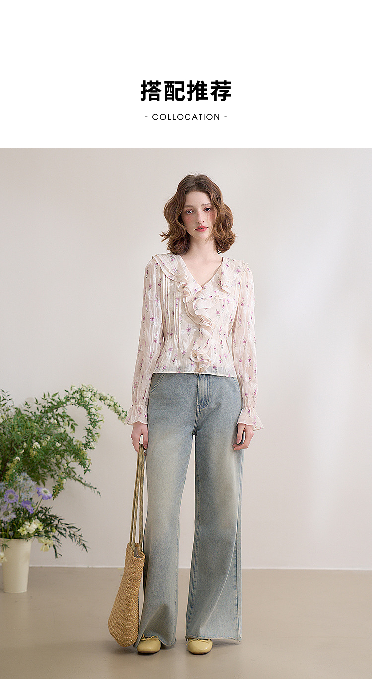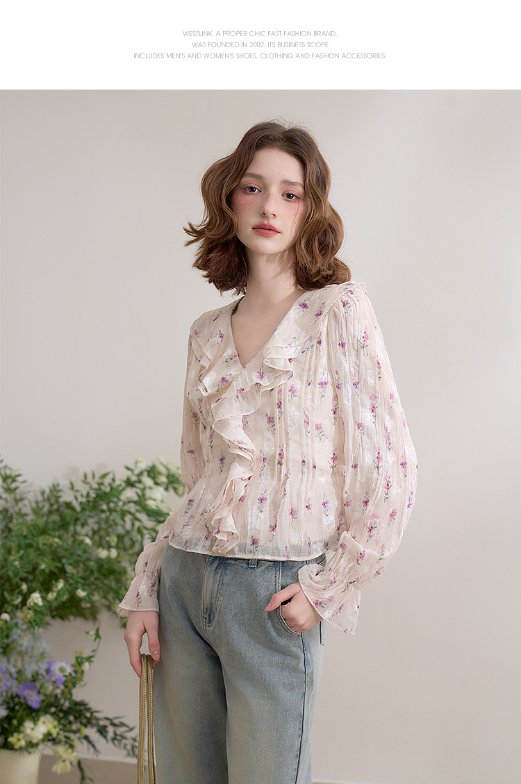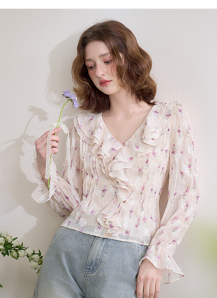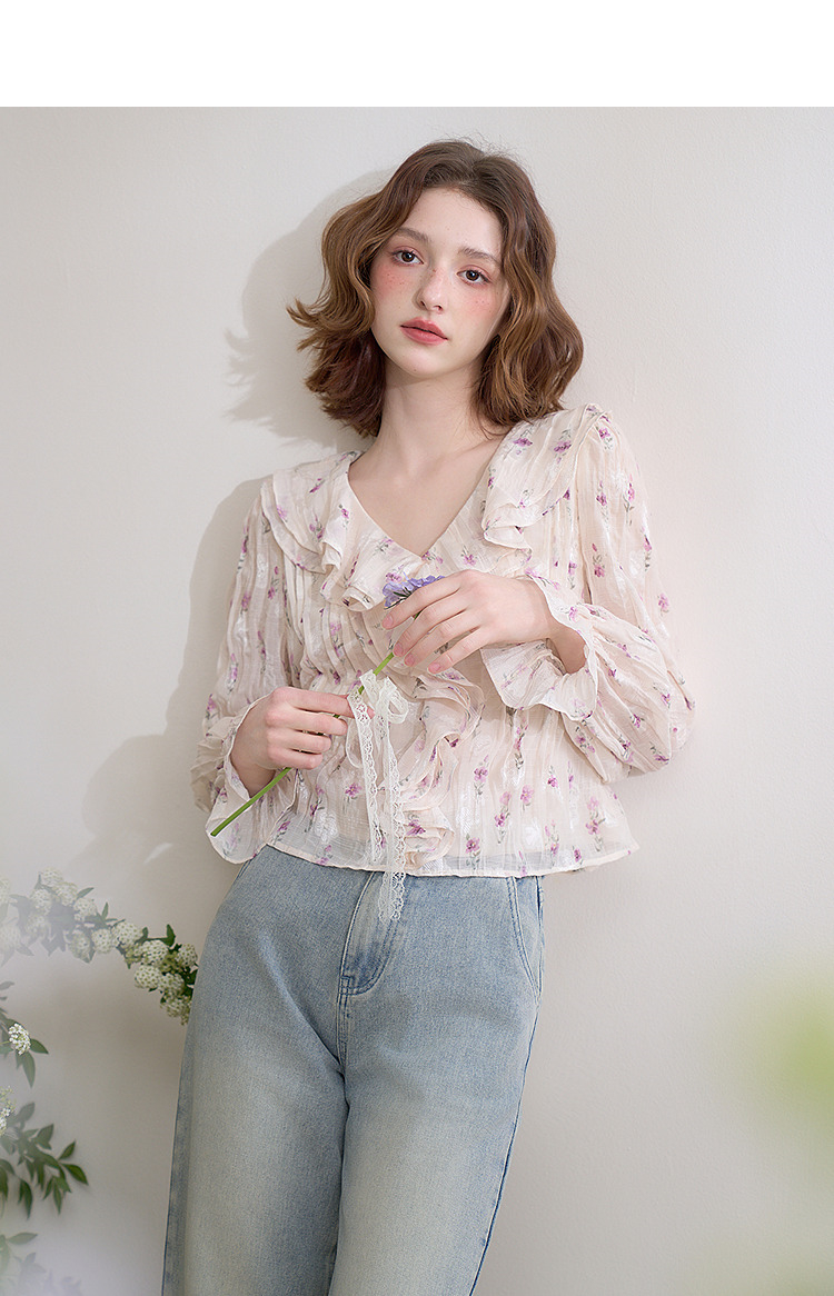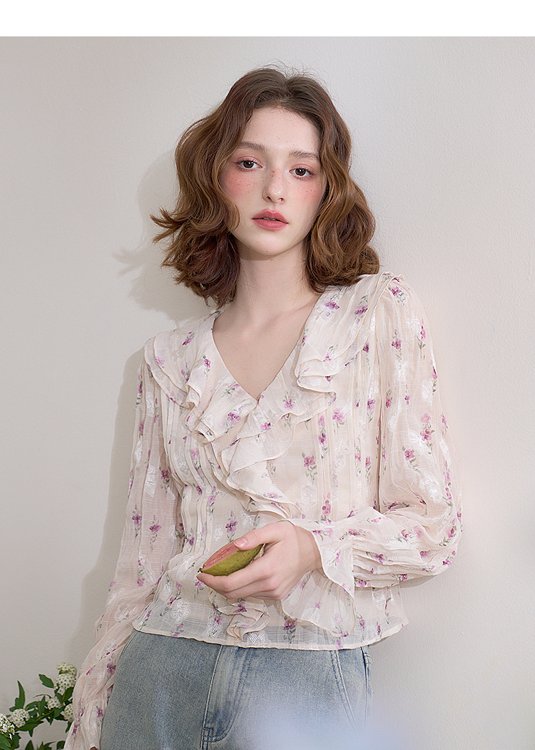 【邂逅春日】法式浪漫碎花长袖衬衫女春季V领荷叶袖衬衣LXD50273