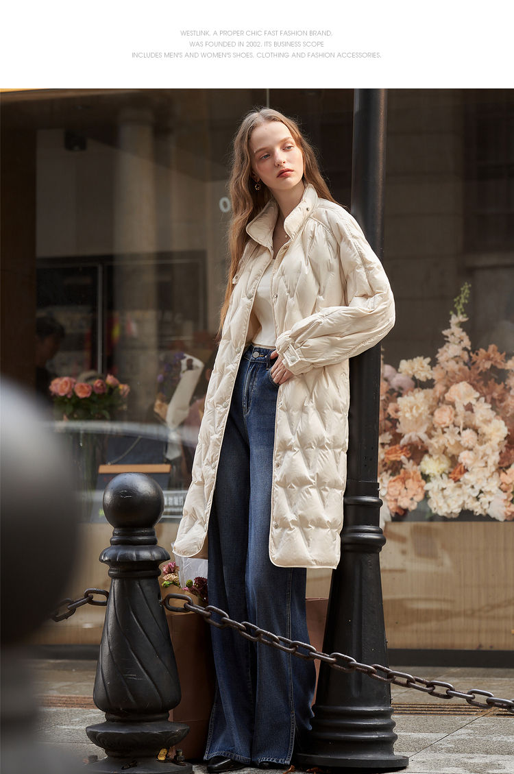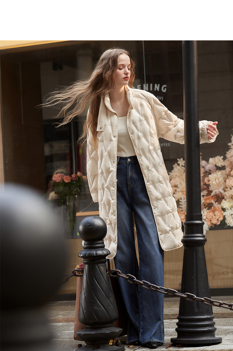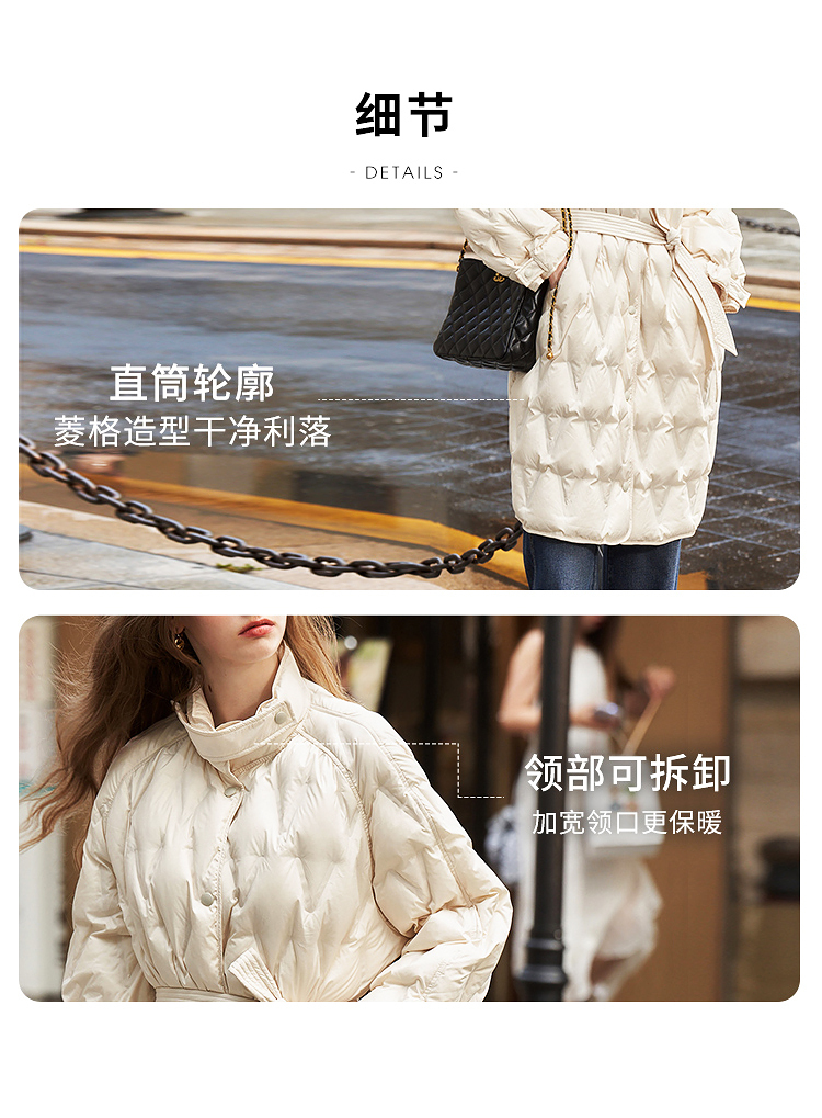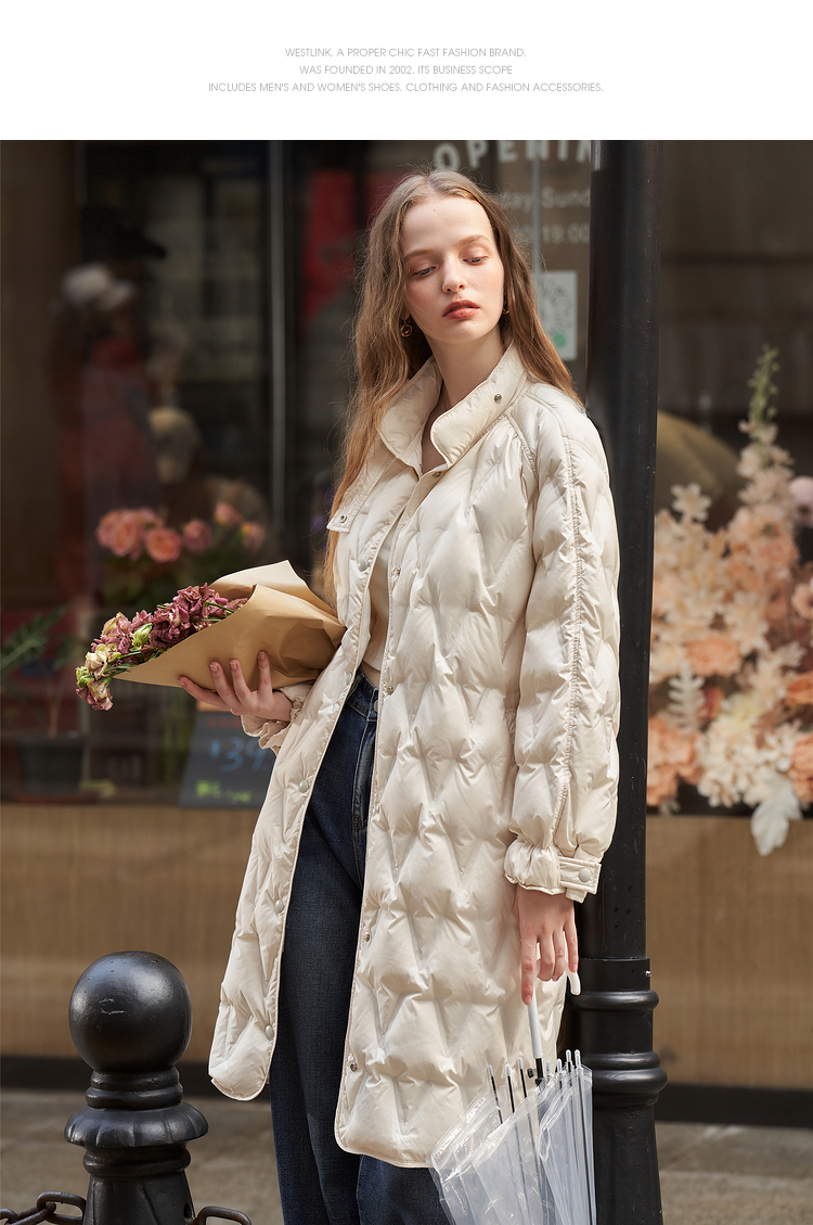 西遇轻薄菱形格羽绒服女秋冬新款极简气质中长款保暖外套V2231642