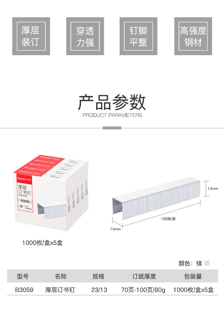 齐心 B3059 厚层订书钉(23/13)100页 1000枚/盒