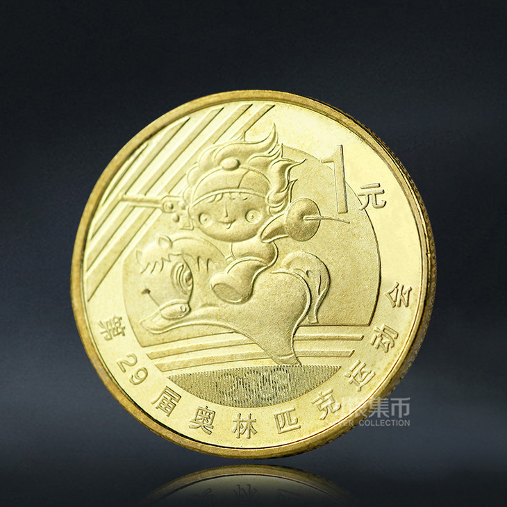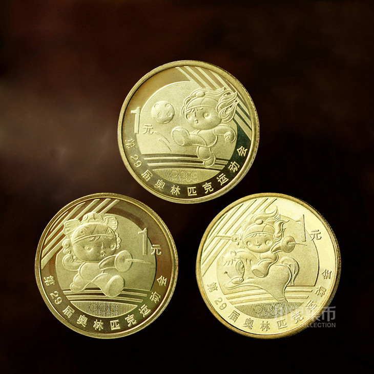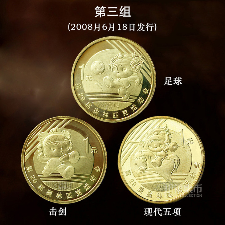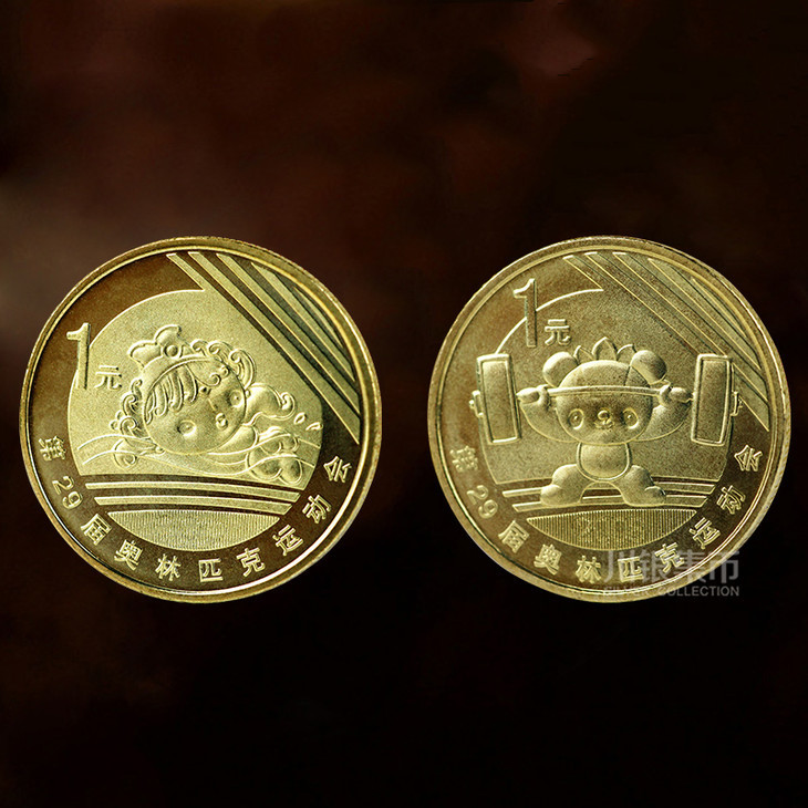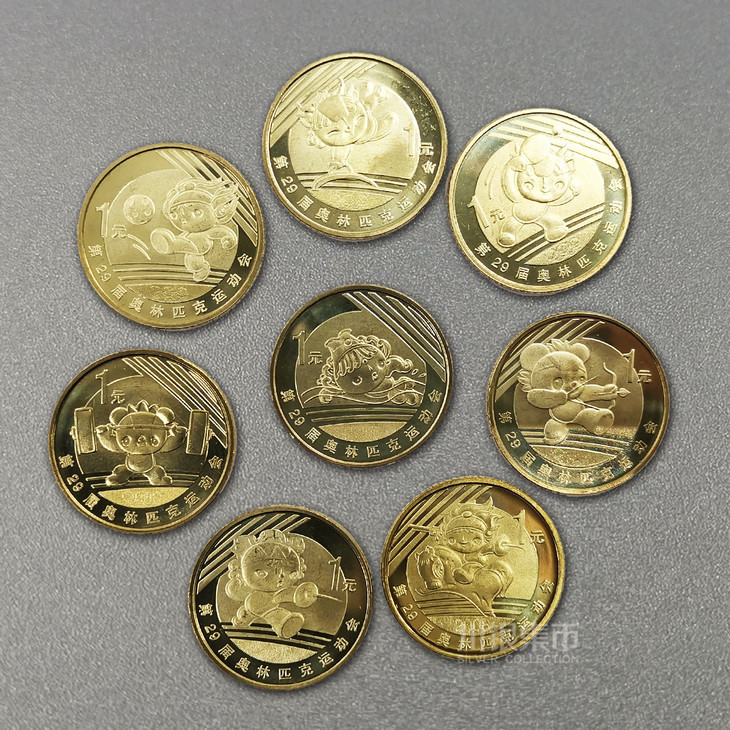 背面图案:为北京2008年奥林匹克运动会吉祥物福娃,举重、游泳、体操、射箭、乒乓球、足球、击剑、现代五项运动造型,左侧刊面值“1元”字样,下方刊“第29届奥林匹克奥运会”字样。