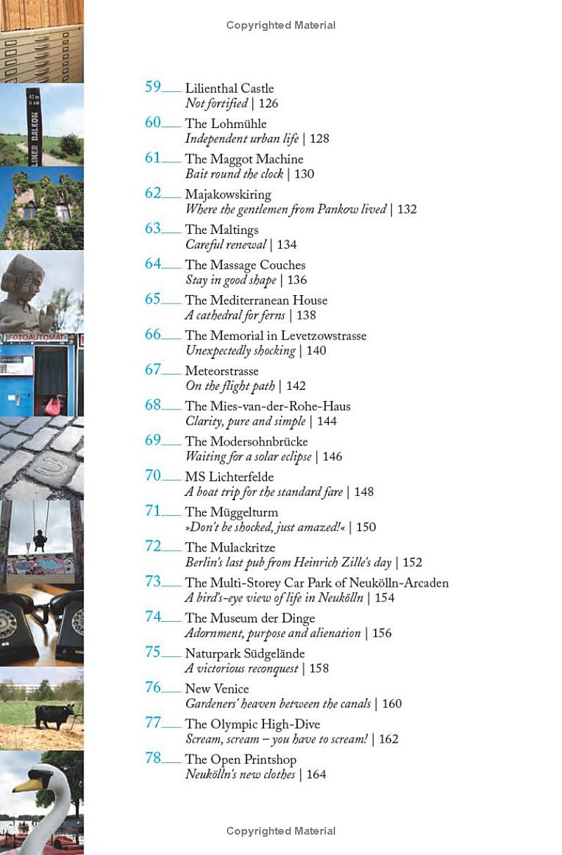 In Berlin, the city divided after World War II, everybody knows about the Brandenburg Gate, Hitler's bunker, Kennedy's speech, red and green beer, splendidly broad boulevards, and numerous lakes. But this metropolis, once again the capital of Germany, encompasses many clandestine niches characteristic of a heterogeneous city without a beginning and without an end between its famous backyards, nature parks, and bridges. It is often these miniscule witnesses that tell authentic history. Besides the larger attractions, this unusual guide presents Berlin's other side - such as a tower so ugly that no-one wants to open a restaurant in it; a library offering its books in the trunks of living trees; the monument for the inventor of the currywurst; a residential settlement in a former East German prison; the place where the Nazis concealed the so-called ""degenerate art"" which they had confiscated; the house where David Bowie lived; an automat out of which maggots can be pulled; a museum for things used for purposes for which they were not created; the reception camp for refugees from East Germany - and, in a completely unexpected spot, the most romantic place in Berlin."