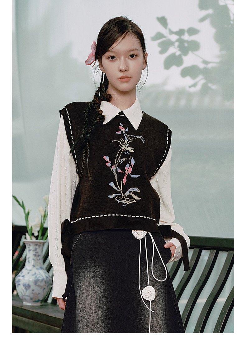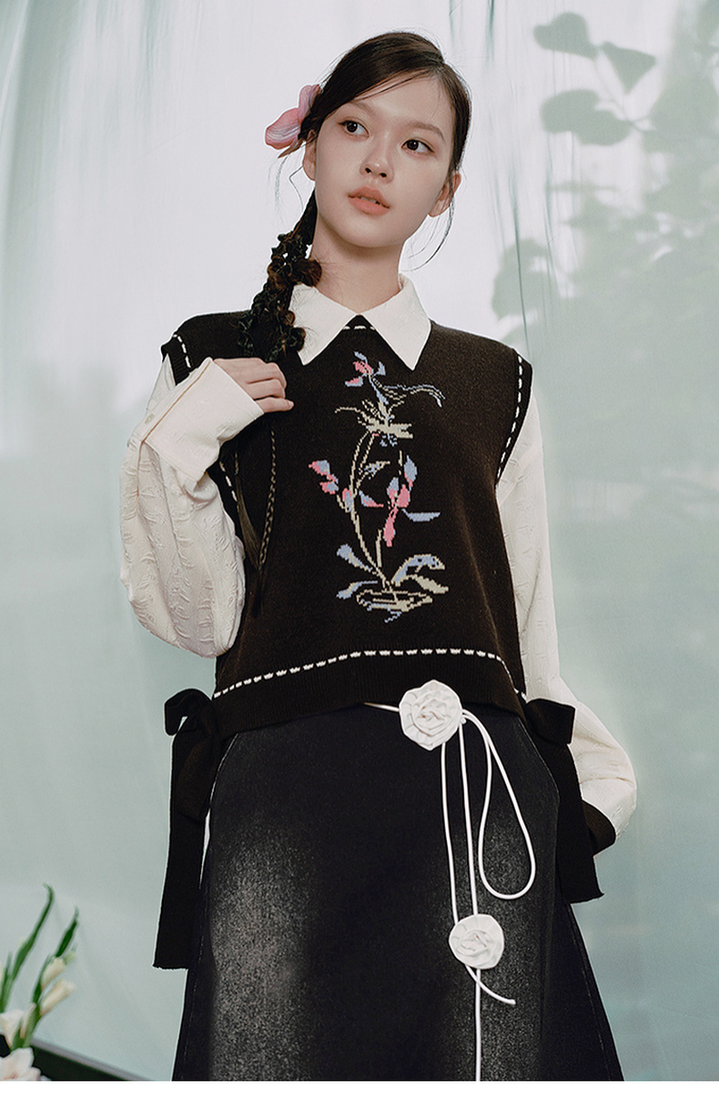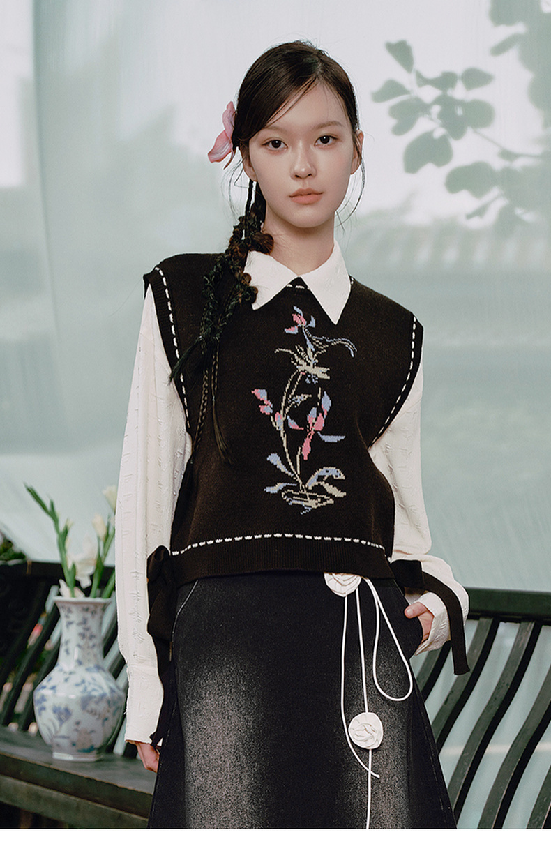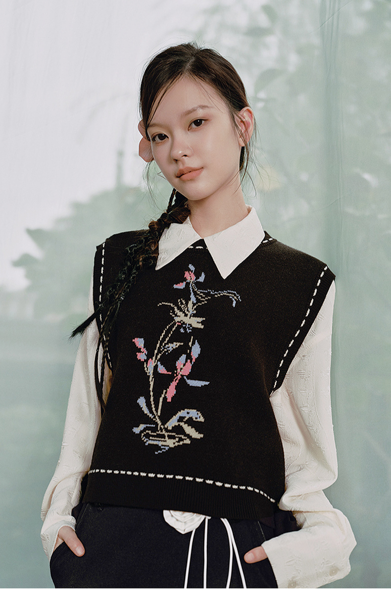 两三事 日暮溪亭 2025春季新款复古花卉图案绑带无袖针织衫女宽松