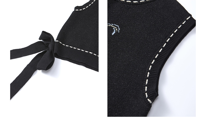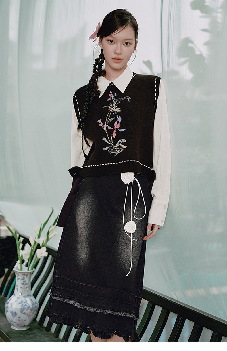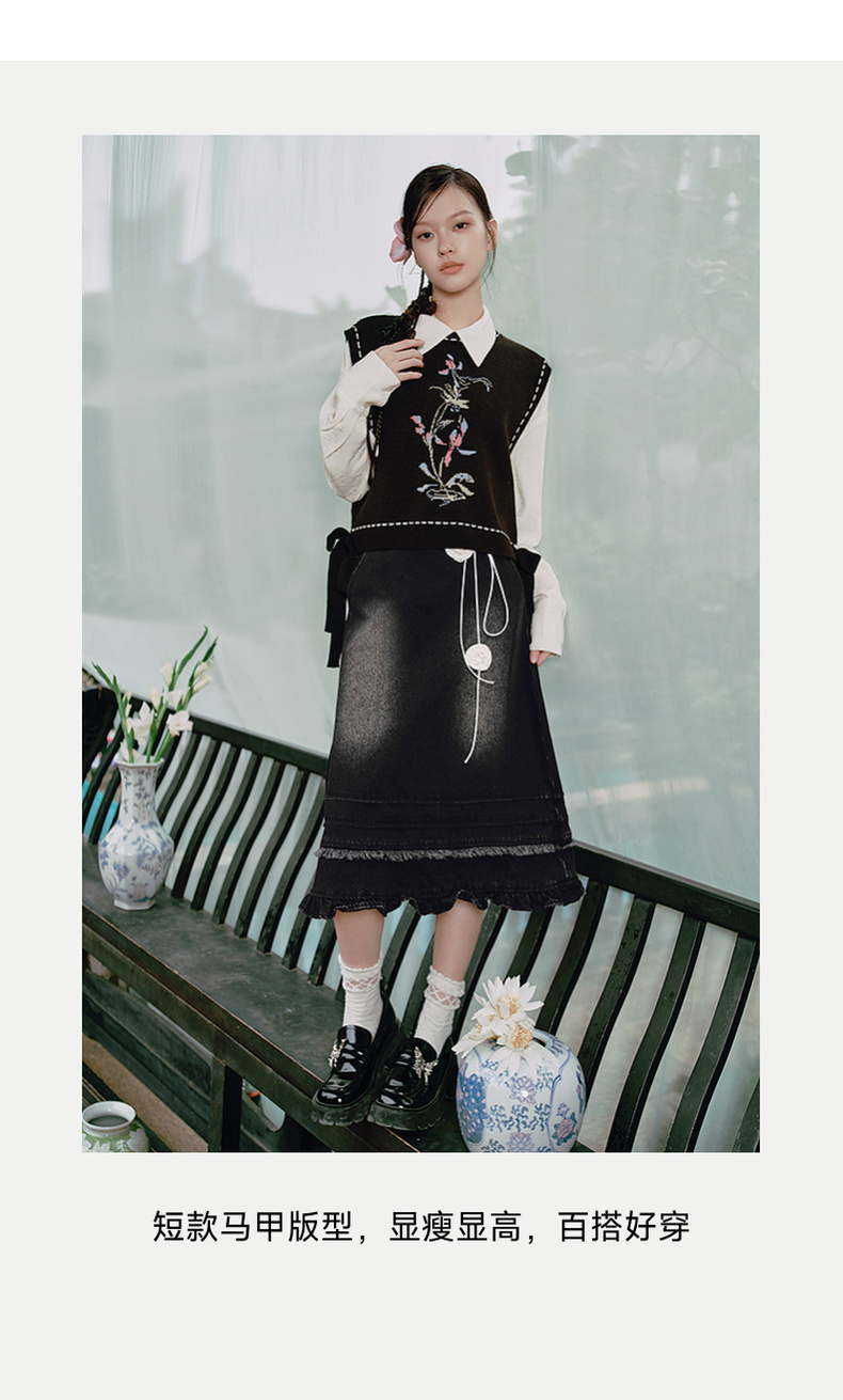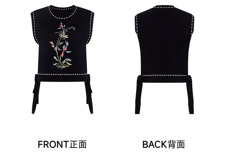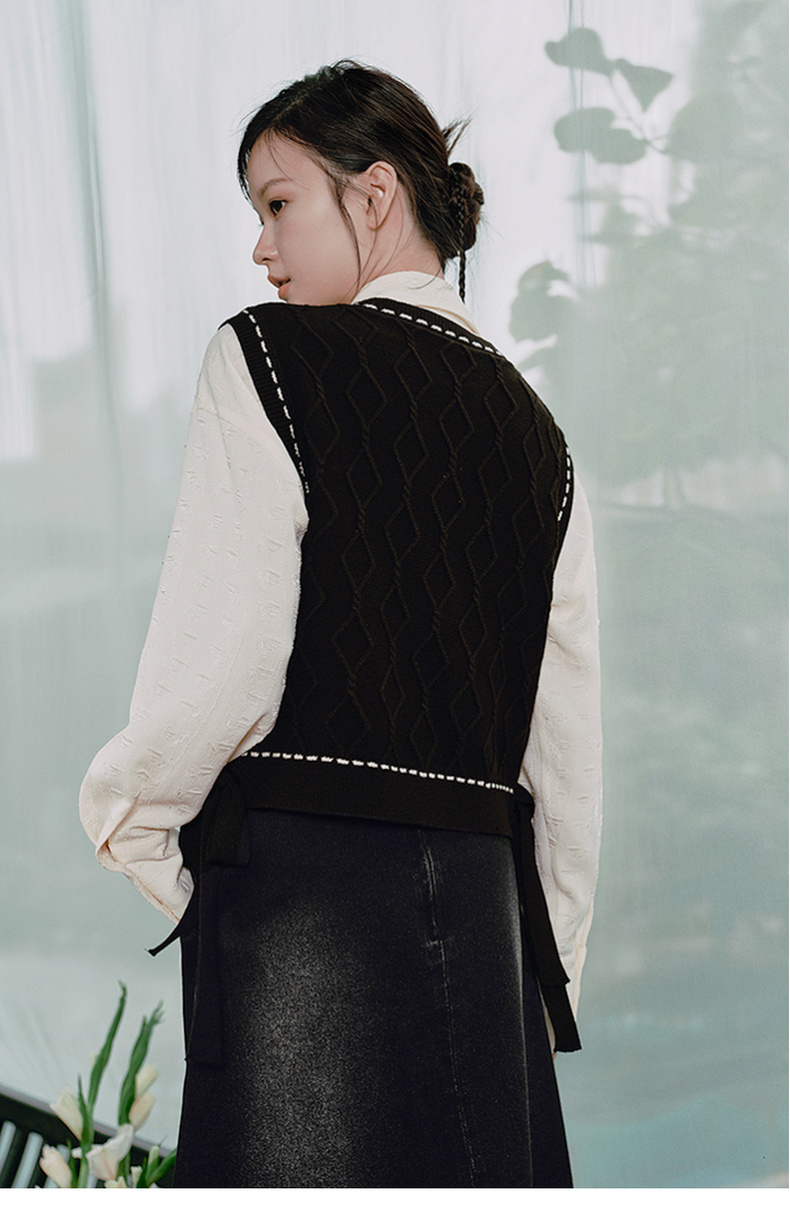 两三事 日暮溪亭 2025春季新款复古花卉图案绑带无袖针织衫女宽松
