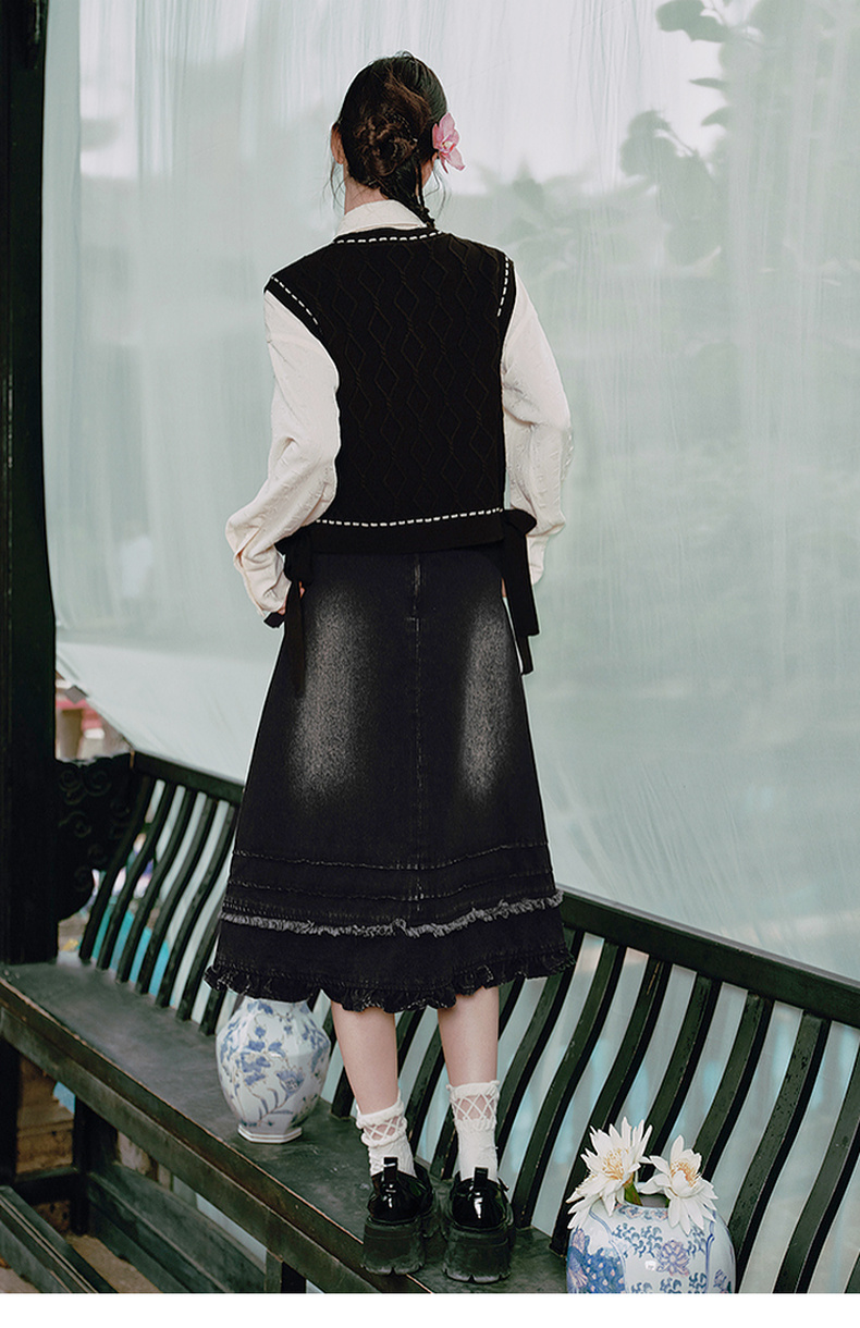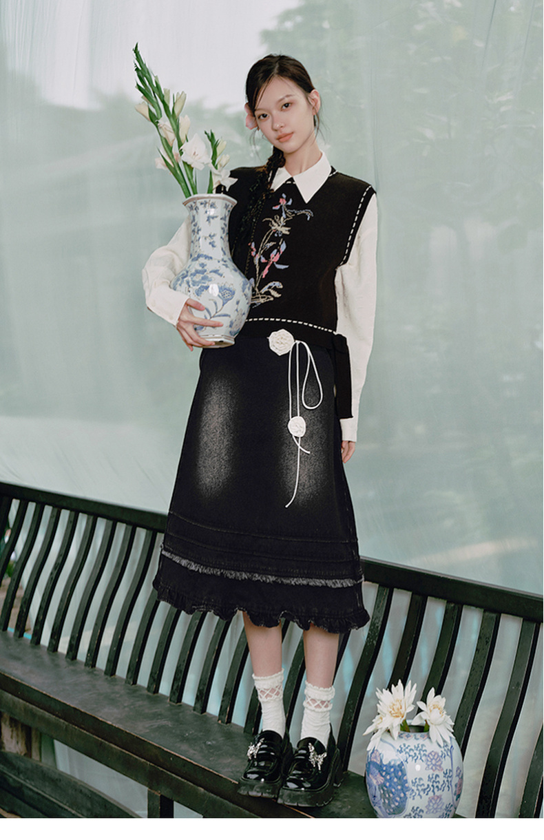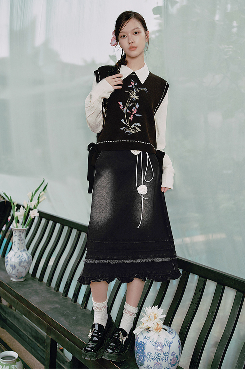 两三事一人相伴 春夏新款时尚单边背带裙系扣高腰牛仔半身裙S23CKB050