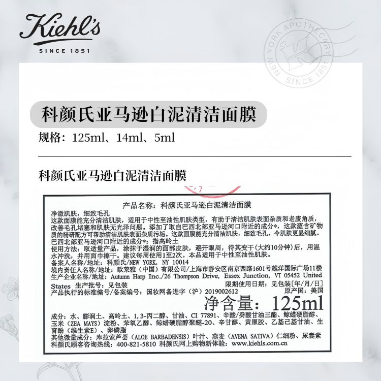 科颜氏(Kiehl's)白泥清洁面膜125ml祛痘控油去角质护肤品