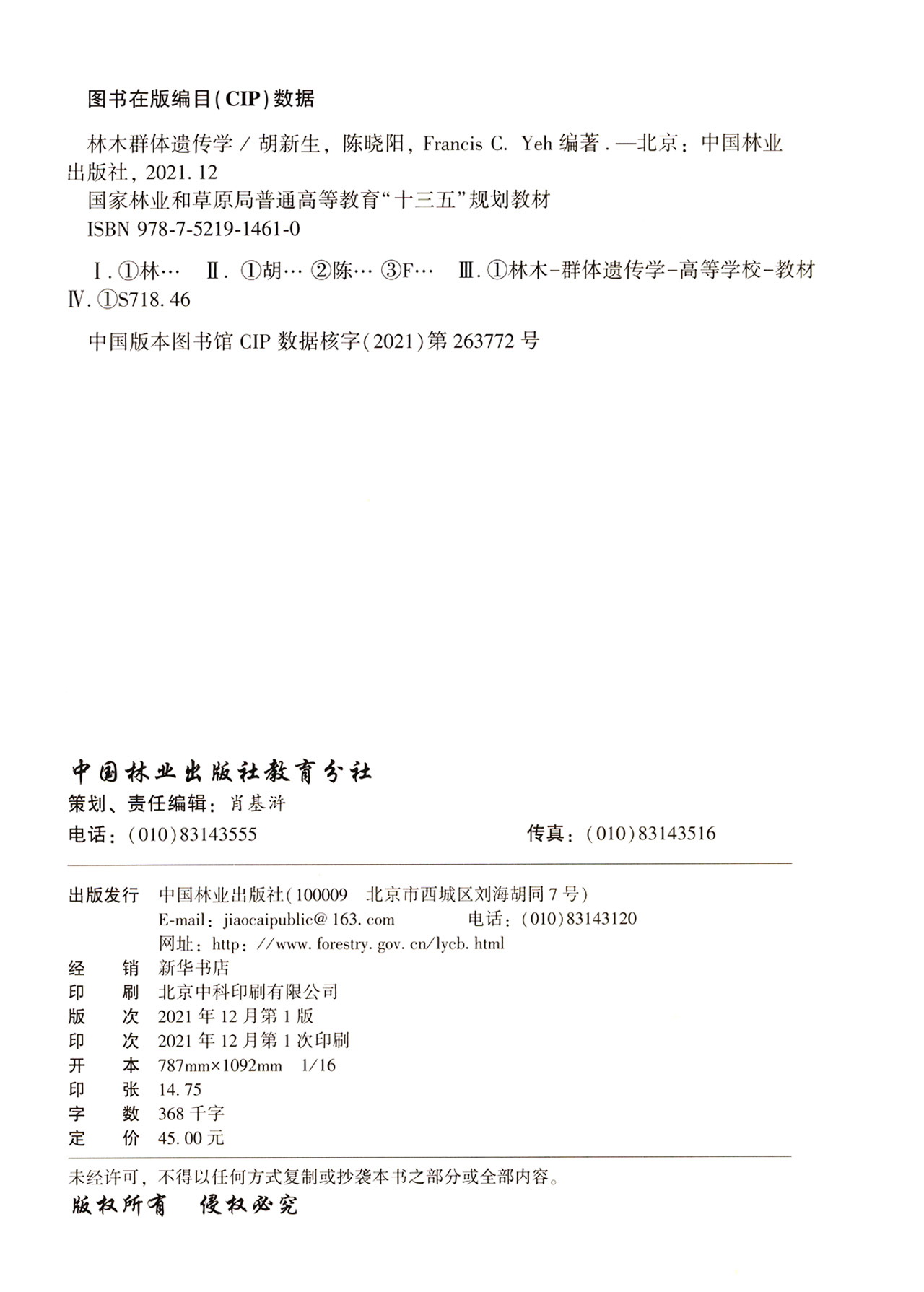林木群体遗传学(国家林业和草原局普通高等教育十三五规划教材) 胡新生//陈晓阳//Francis C.Yeh 1461 中国林业出版社