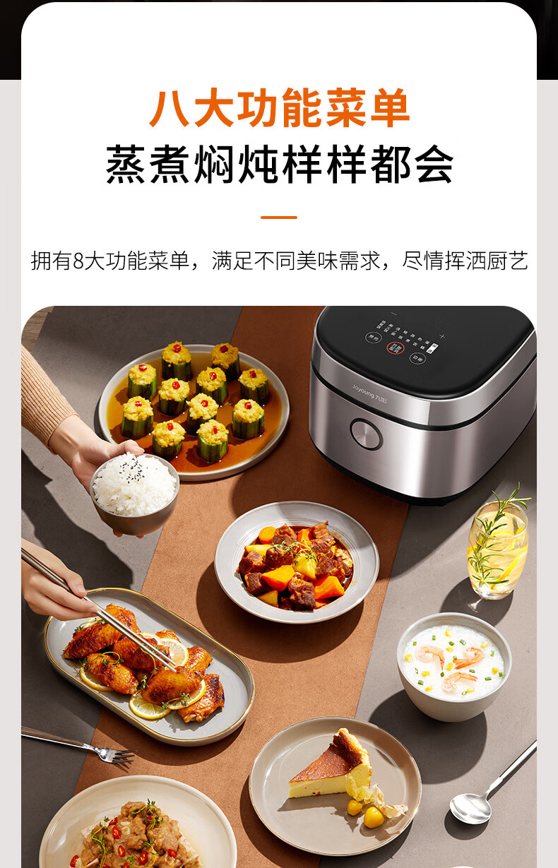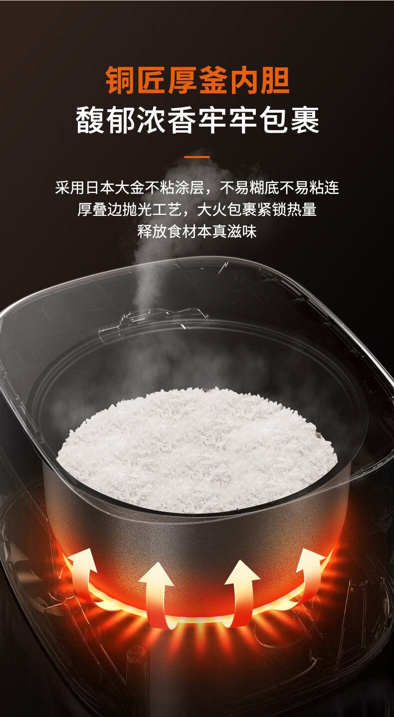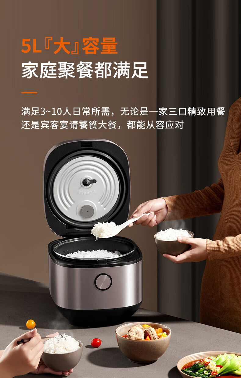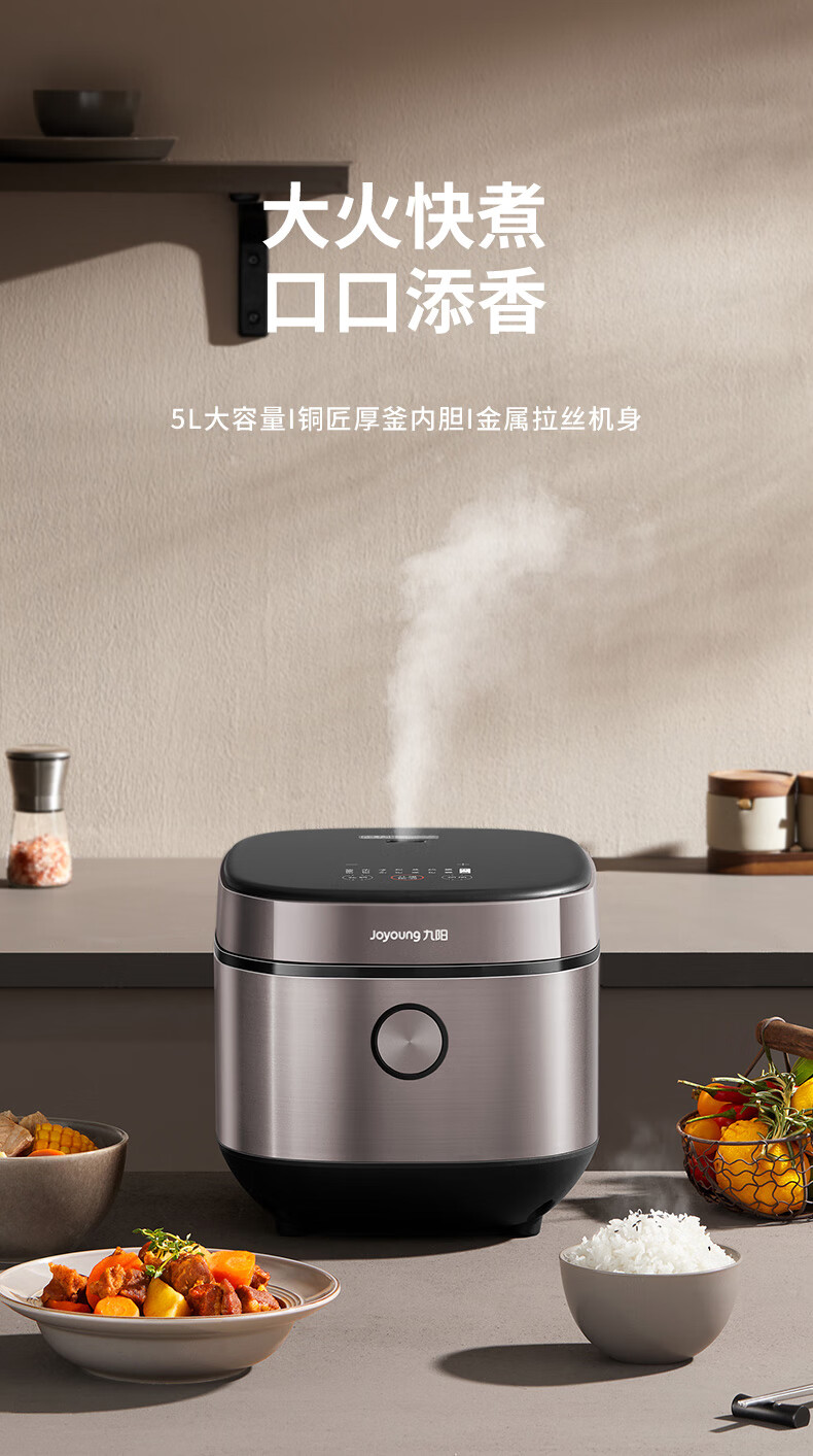 积分免费兑:九阳(Joyoung)5升大容量4~5人电饭煲电饭锅铜匠厚釜内胆大火快煮智能预约多功能5L饭煲F510