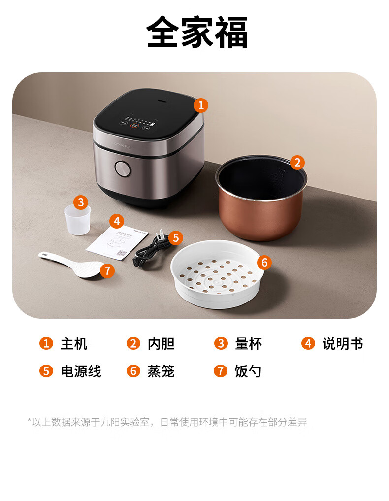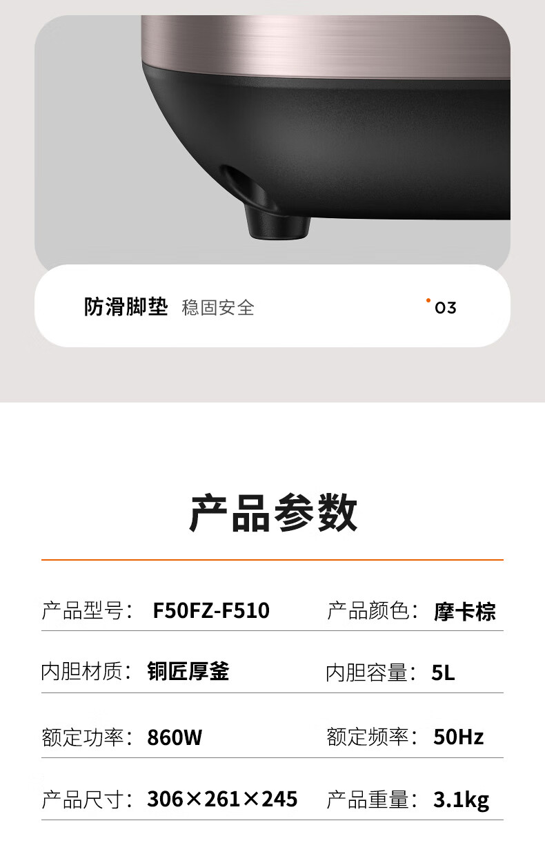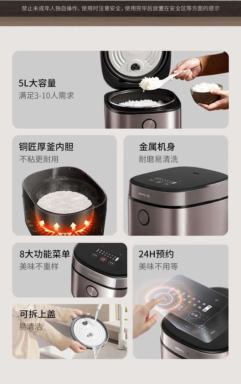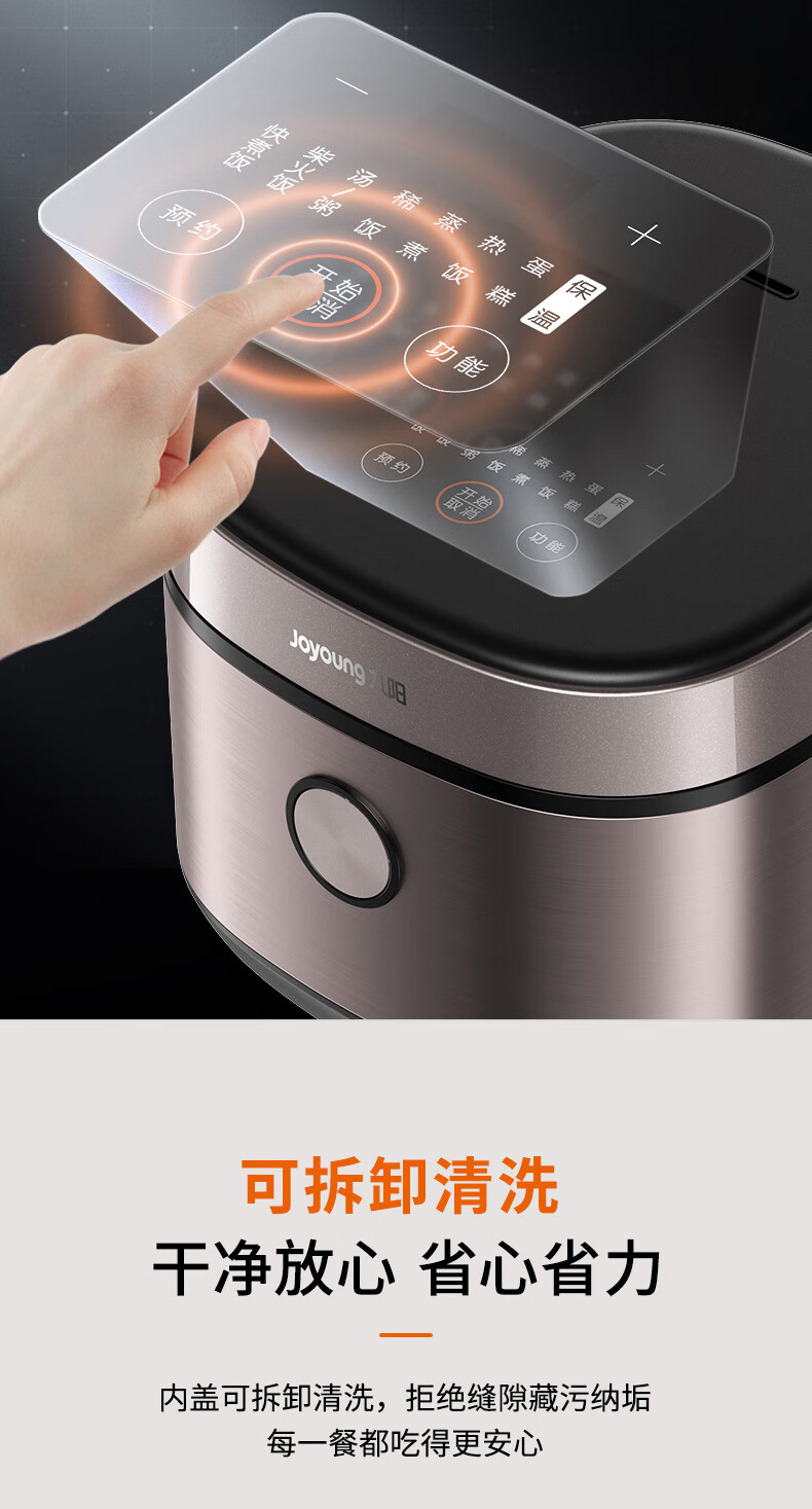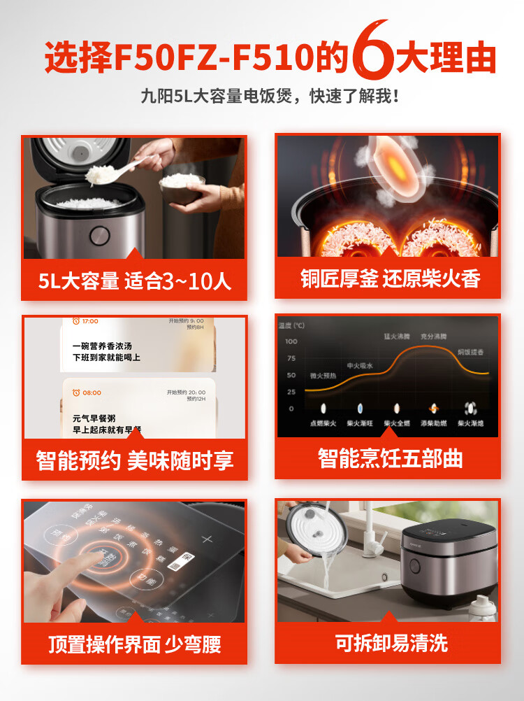 积分免费兑:九阳(Joyoung)5升大容量4~5人电饭煲电饭锅铜匠厚釜内胆大火快煮智能预约多功能5L饭煲F510