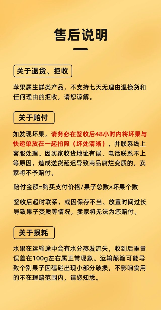 【瑕疵果售后须知】瑕疵果,会有硬伤,品相不太好看,表面有皱巴,斑痕,个头不太均匀,为确保品质,瑕疵果在发货前均经过人工仔细筛选,因本次以特价回馈,故该商品一经售出,无论因何种原因导致的损坏,均不支持售后退换哦~对售后政策介意的朋友请谨慎下单,感谢您的理解与支持!