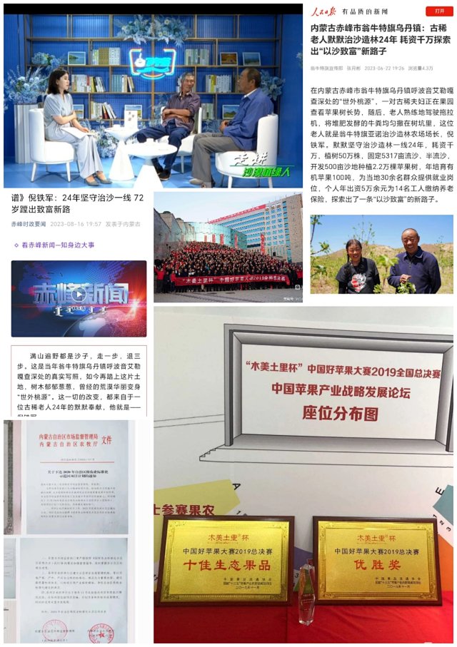 内蒙古沙漠有机种植标准化栽培技术,使得现在沙地有机苹果颜色鲜艳,蜡质丰厚,富含多种维生素、矿物质等,营养更丰富,也更容易储存。这里接天连日的黄沙曾经让人苦不堪言,种上苹果后不但改善了当地恶劣的沙漠环境,也生产出了好吃的优质有机沙漠苹果,可以说是生态和经济效益的双赢。沙地可以种出苹果跟生态条件有关,跟改善沙漠地区环境的英雄也有关系,正是因为倪铁军大哥的努力,沙地才能提高覆盖率,才能种出水果,现在拥有特色的栽培技术、高标准化管理、同时也高质量发展。