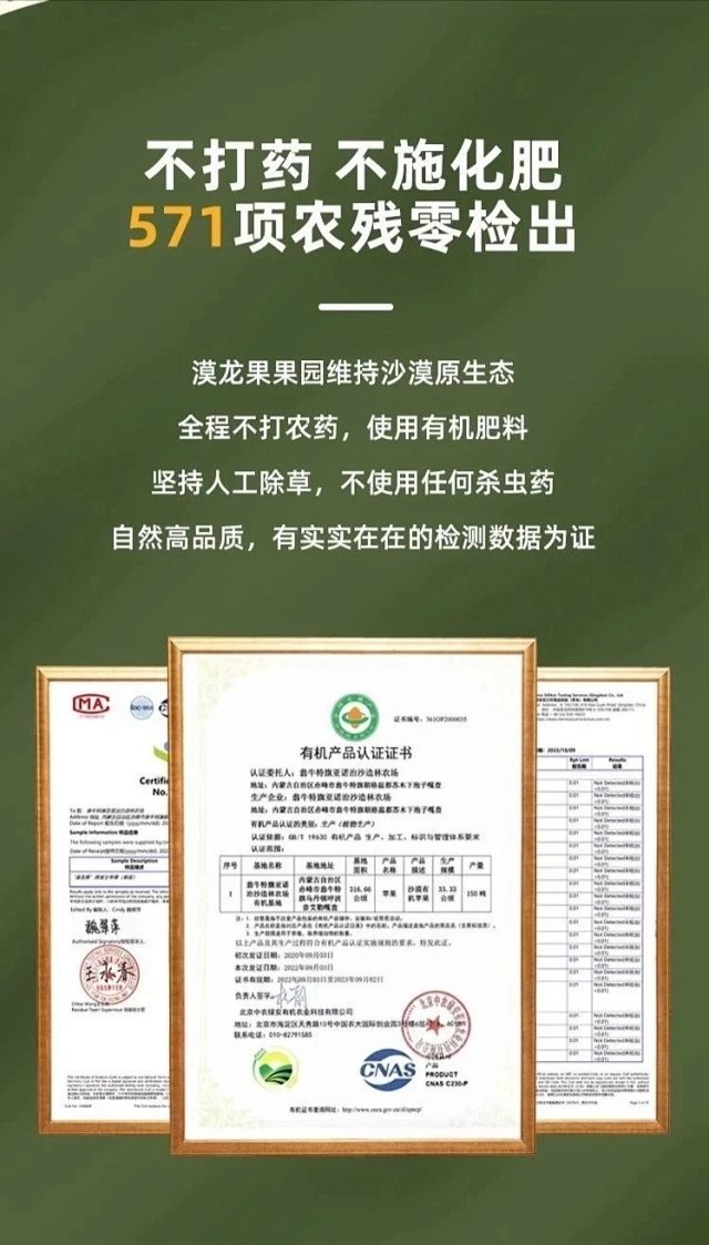 2025年9月亚诺治沙造林农场漠龙果沙漠有机苹果连续五年获得有机认证,农残检测全部零检出