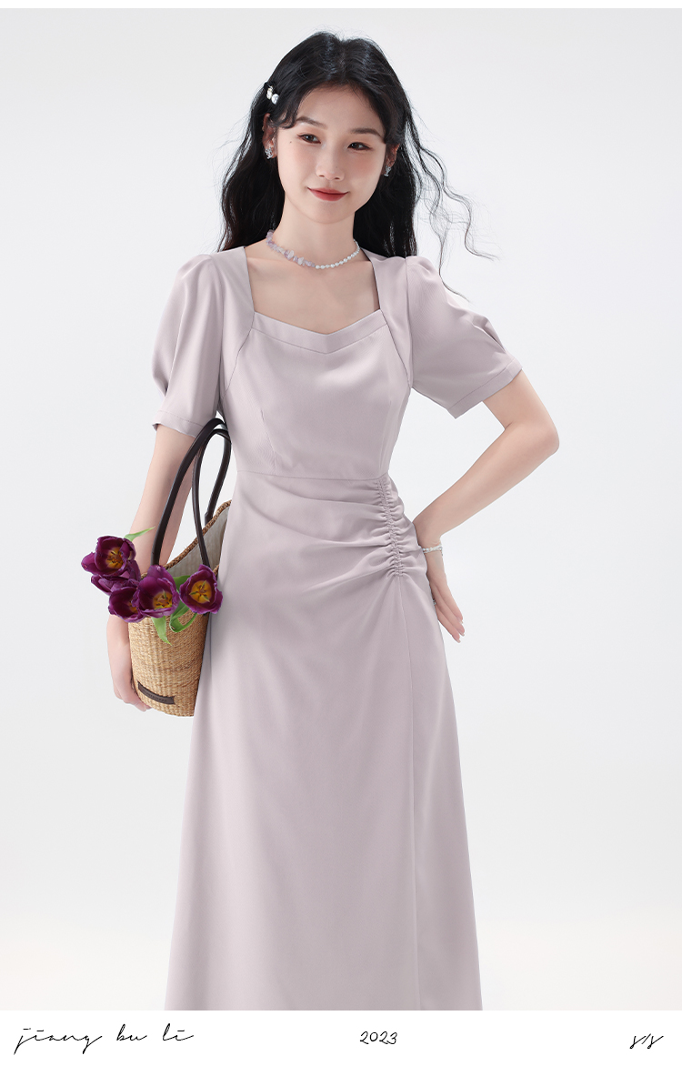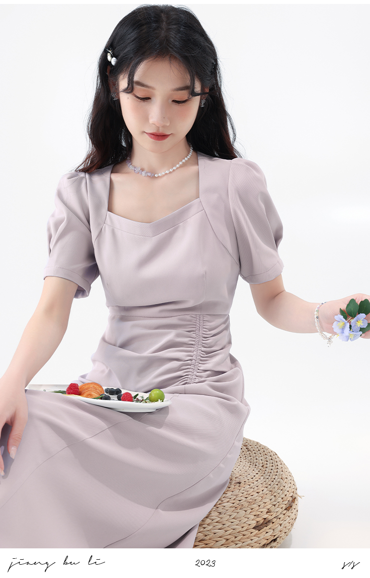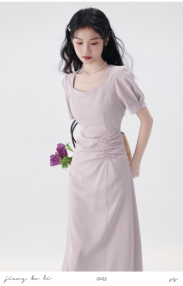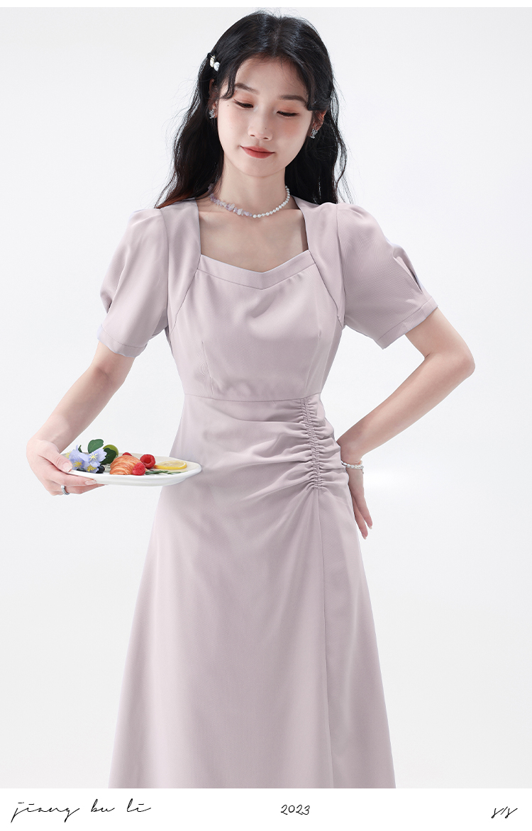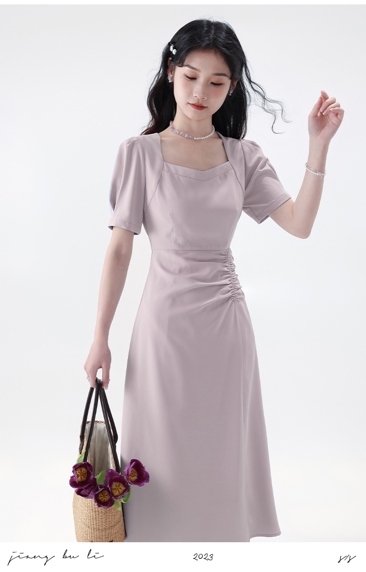 鹿向南【你若成风】法式紫色短袖连衣裙女2025夏新款气质收腰裙子