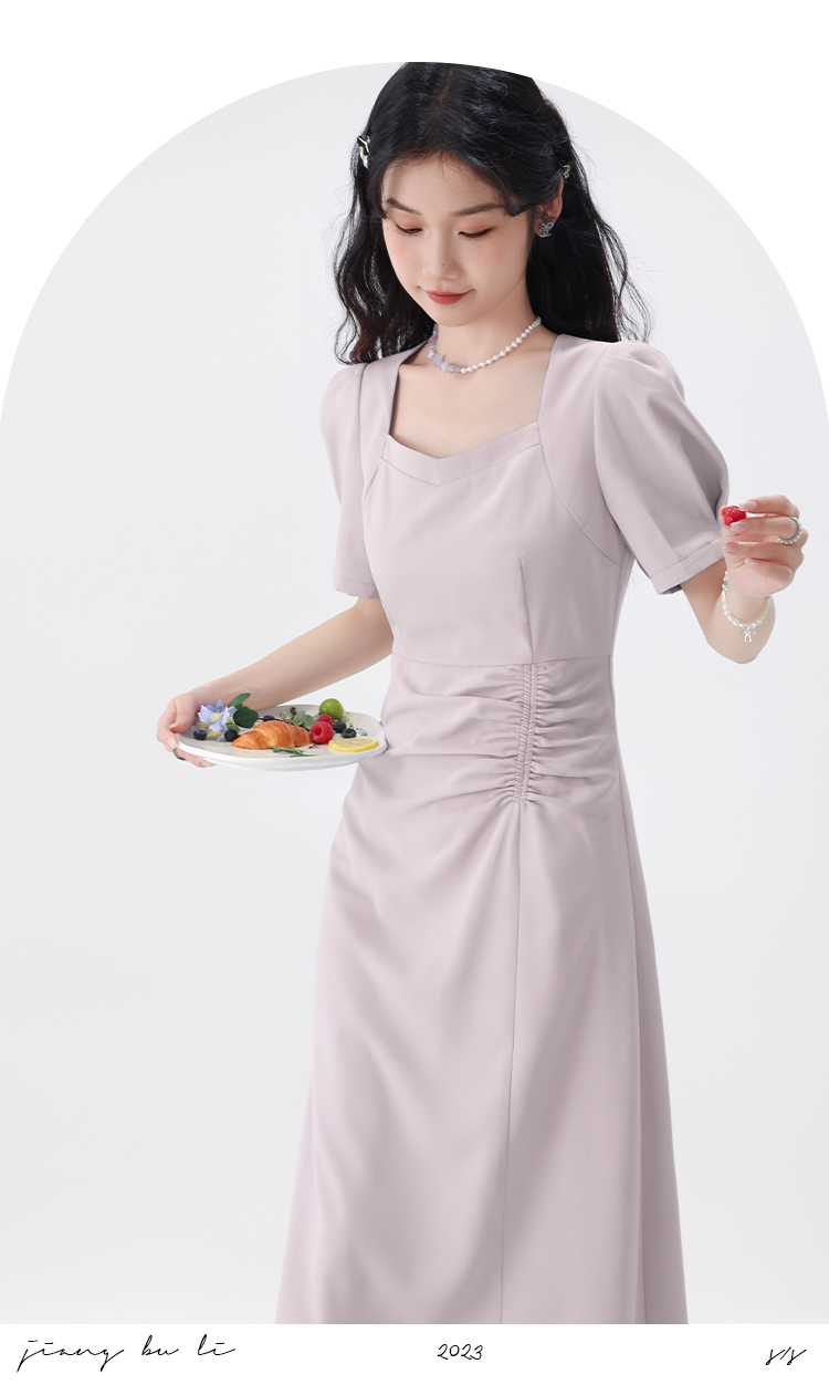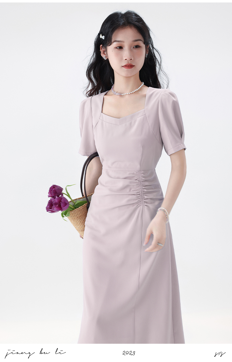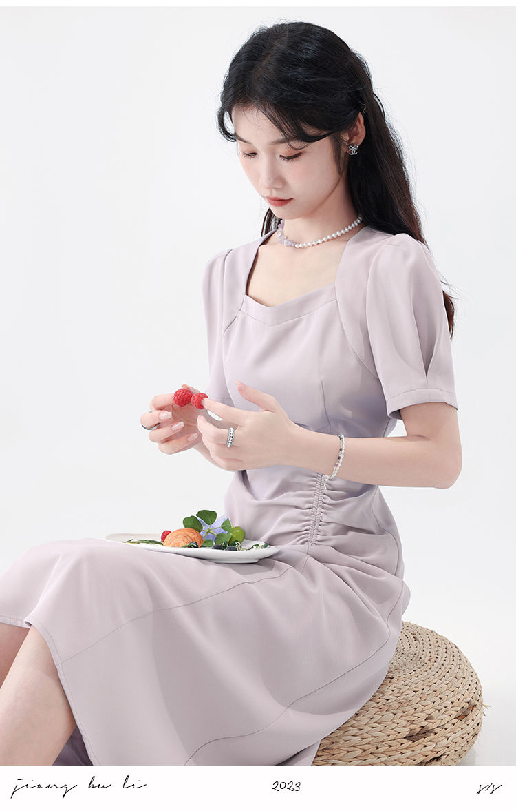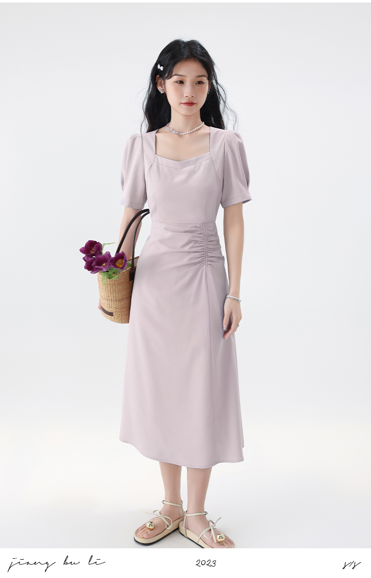 鹿向南【你若成风】法式紫色短袖连衣裙女2025夏新款气质收腰裙子
