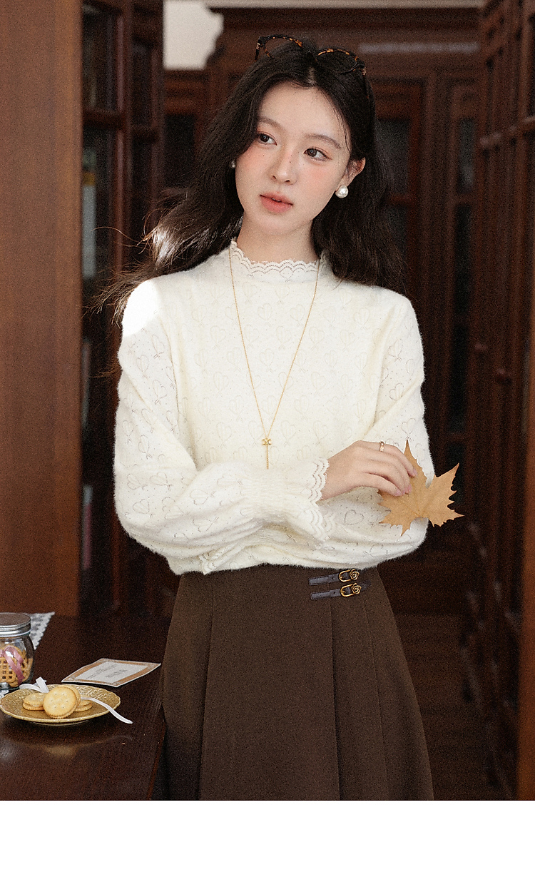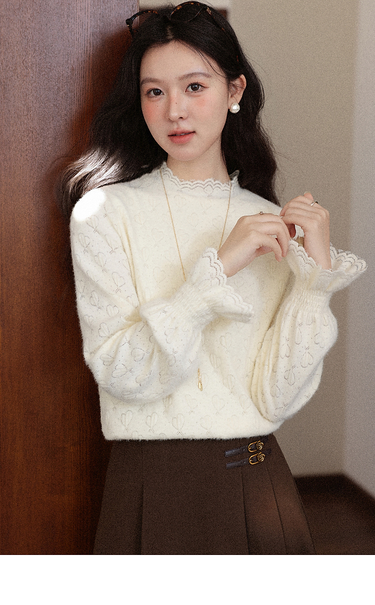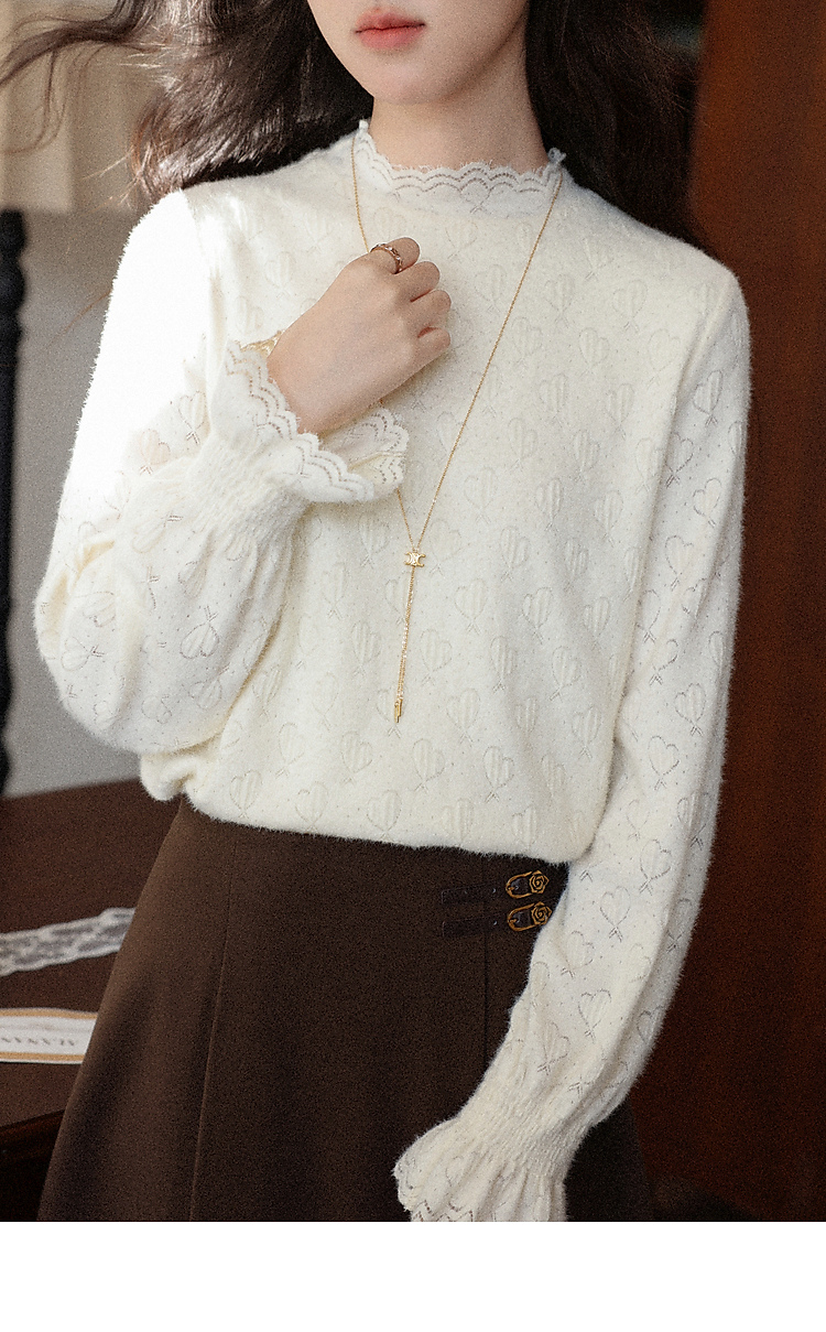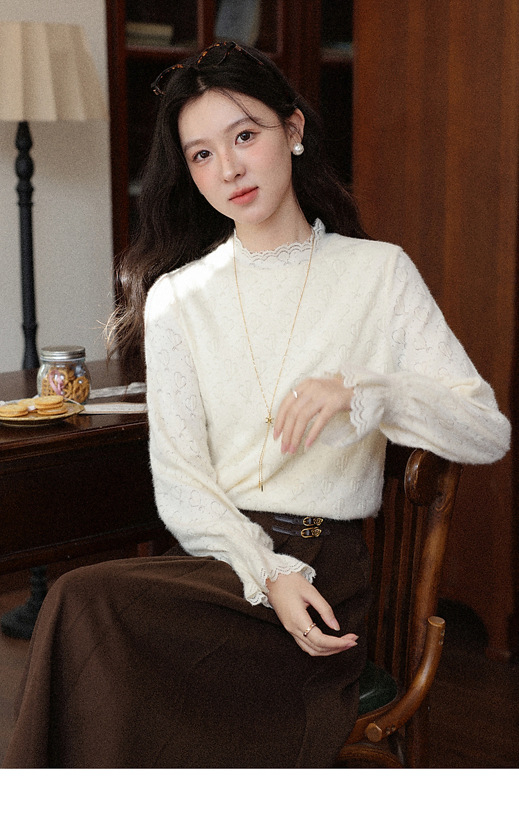 鹿向南「暖芯漫语」杏色半高领蕾丝打底衫女秋冬法式长袖衬衫上衣