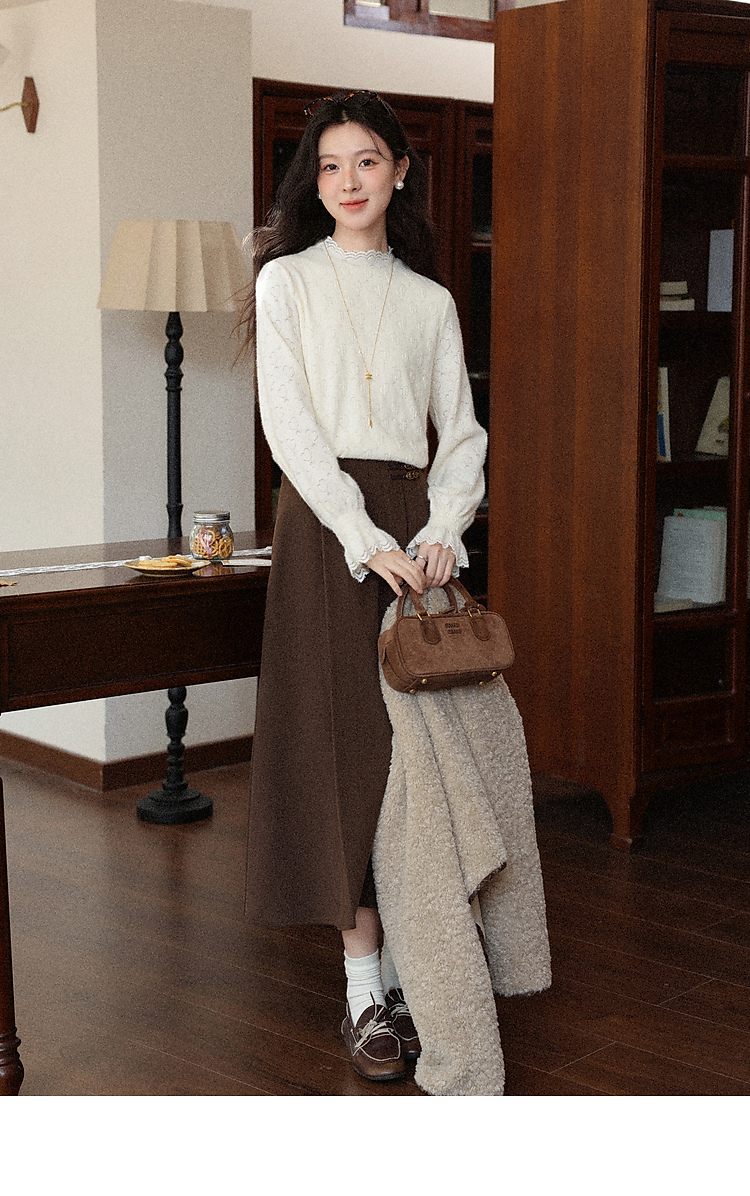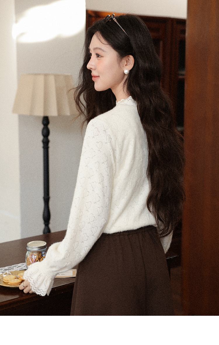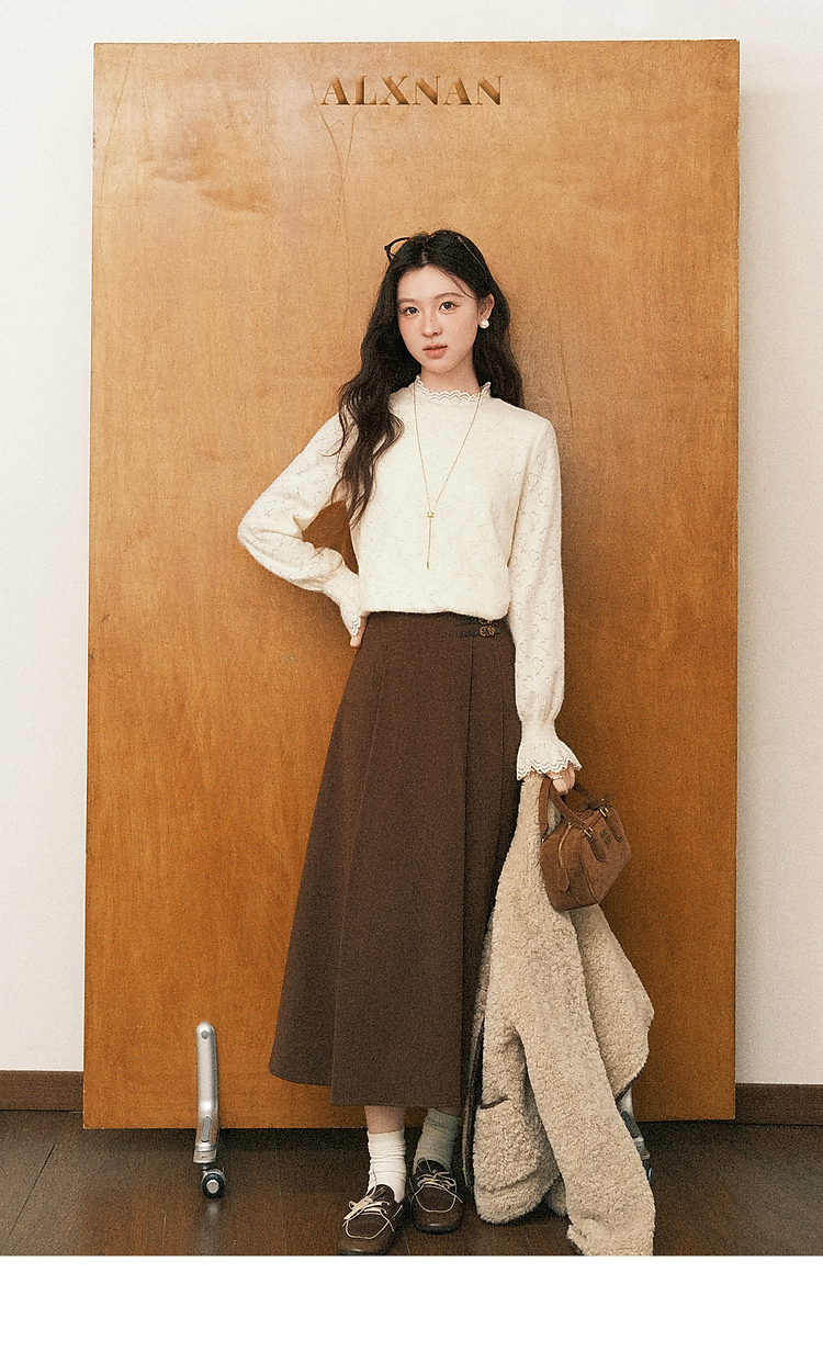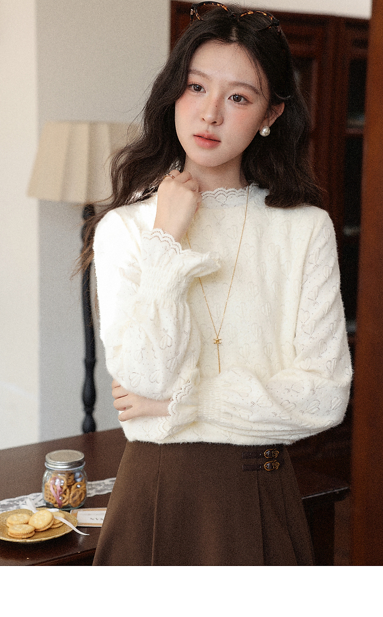 鹿向南「暖芯漫语」杏色半高领蕾丝打底衫女秋冬法式长袖衬衫上衣