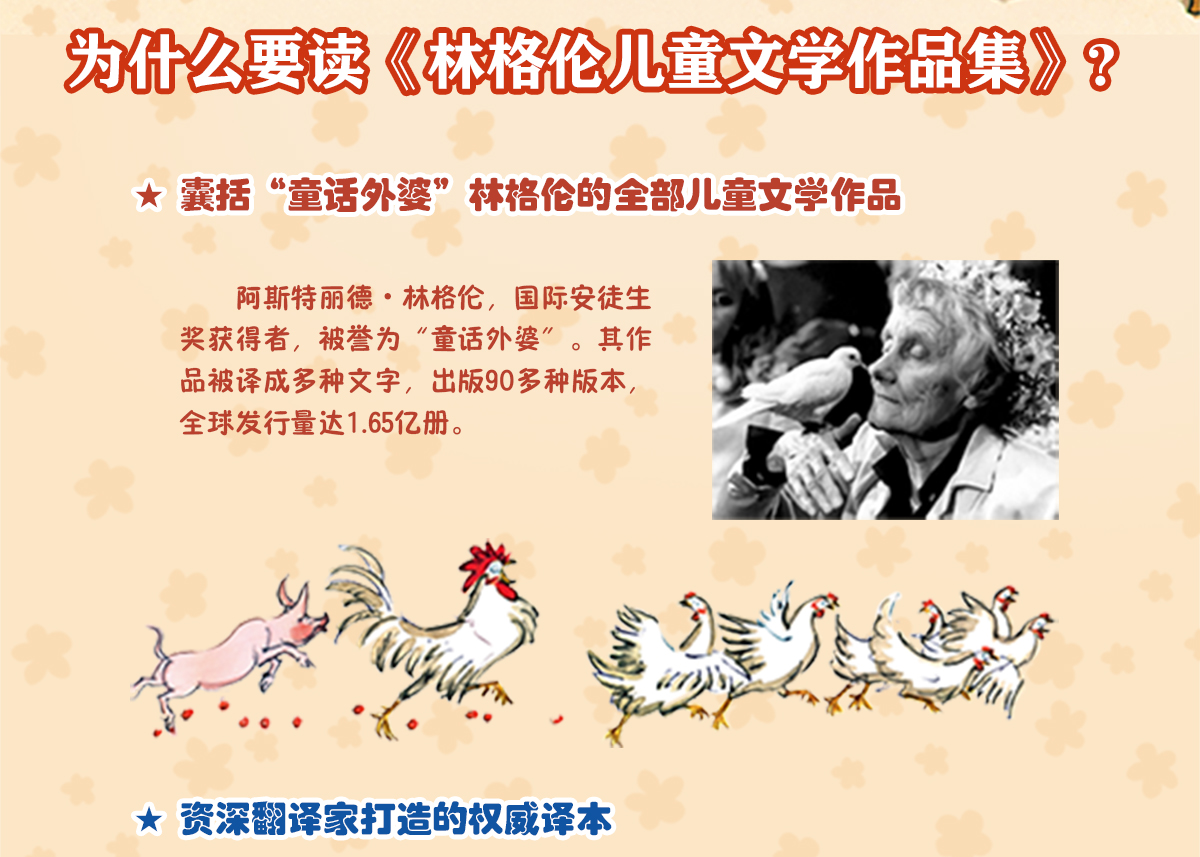阿斯特丽德·林格伦出道不久便获得了国际安徒生奖,在中国被亲切的称为“童话外婆”。林格伦的作品里没有说教,孩子们想说就说,想玩就玩。小读者从林格伦的过作品里获得独立、自由;懂得宽容和理解,解放童心,享受童年。