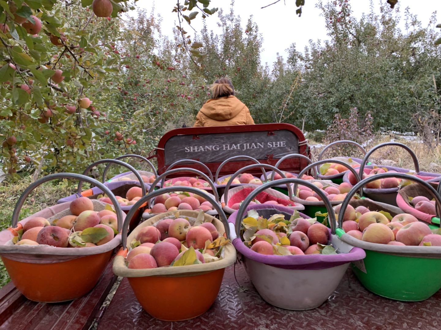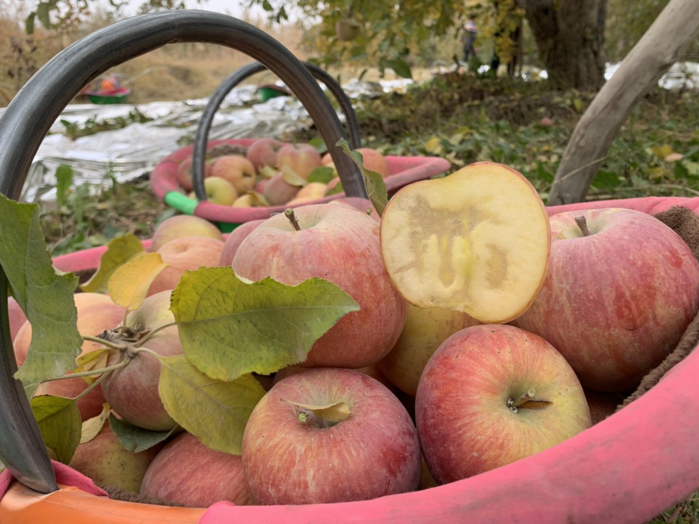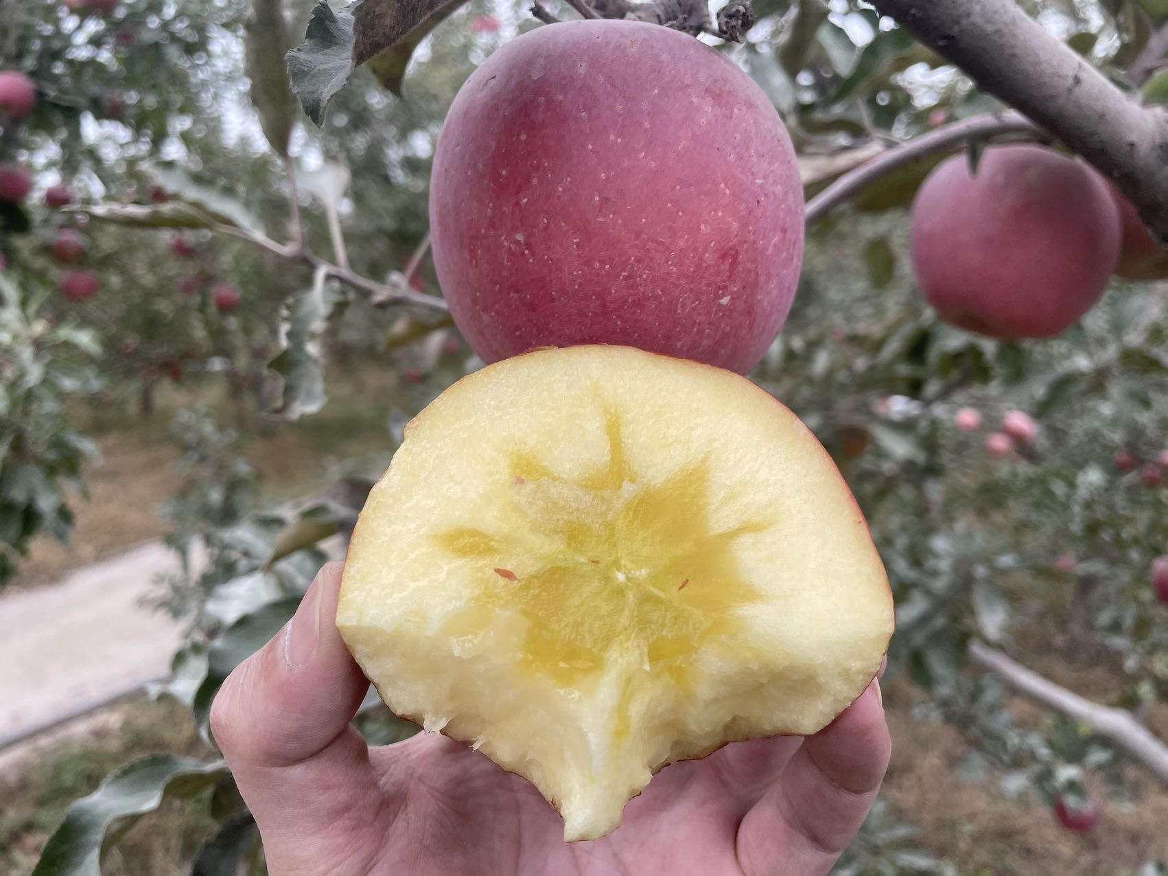 新疆风沙大,苹果表面会积有沙土。阿克苏苹果果形不端正,朝向太阳方向的苹果长得较大突出,颜色更红润,背光的果面部分底色是黄绿色。