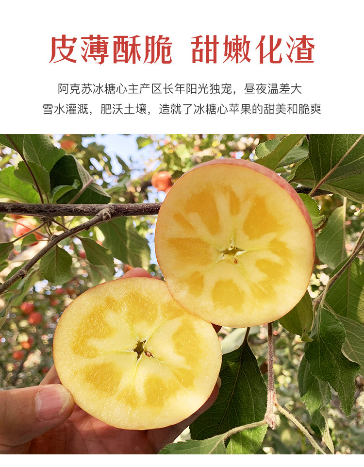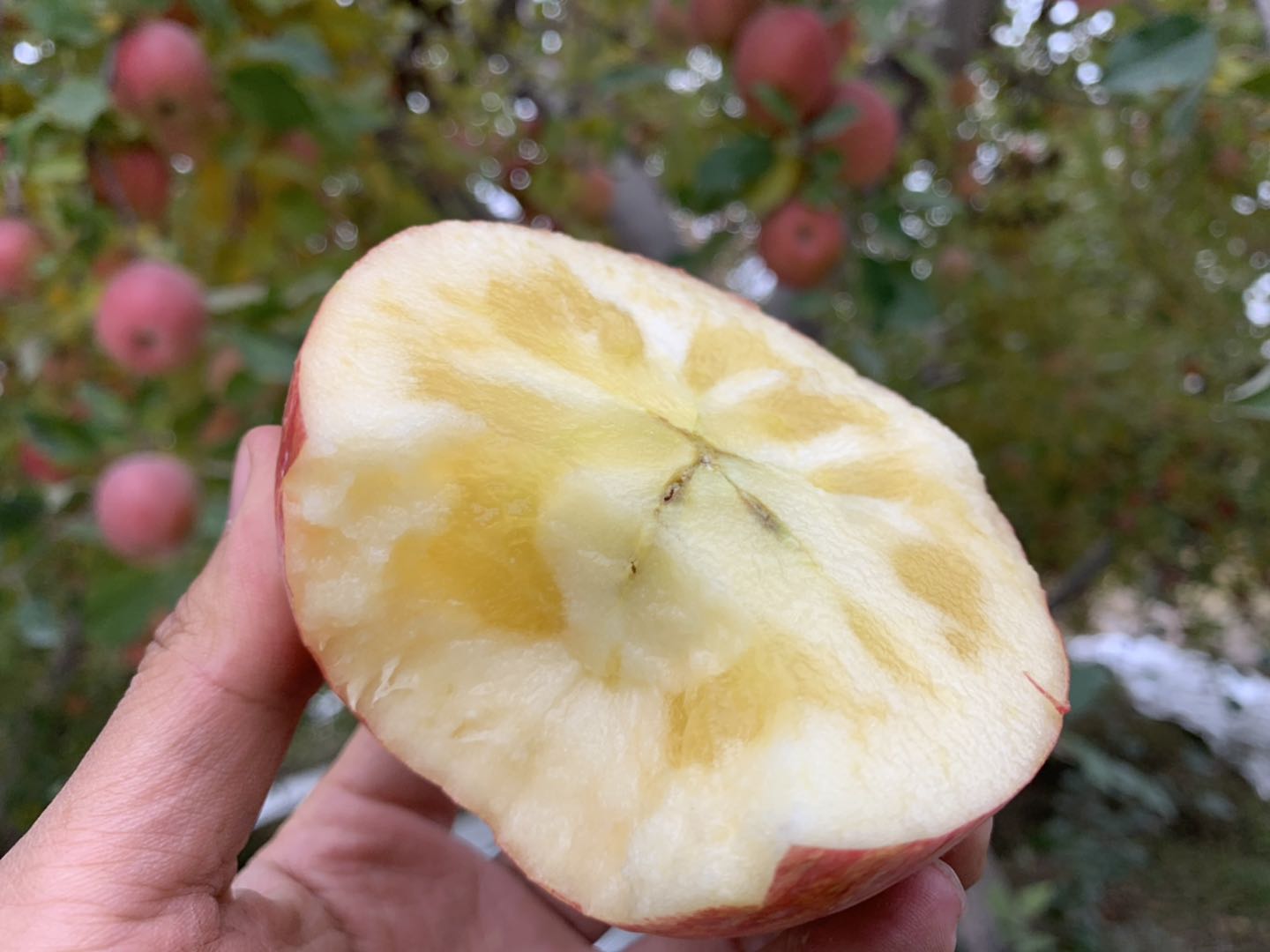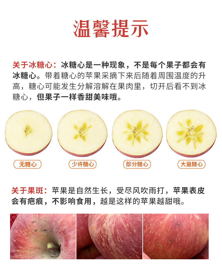 冰糖心是果子在寒冷低温的气候下果糖凝聚形成的一种自然现象,当果子放在常温中,冰糖心会随温度升高逐渐消失或变浅。