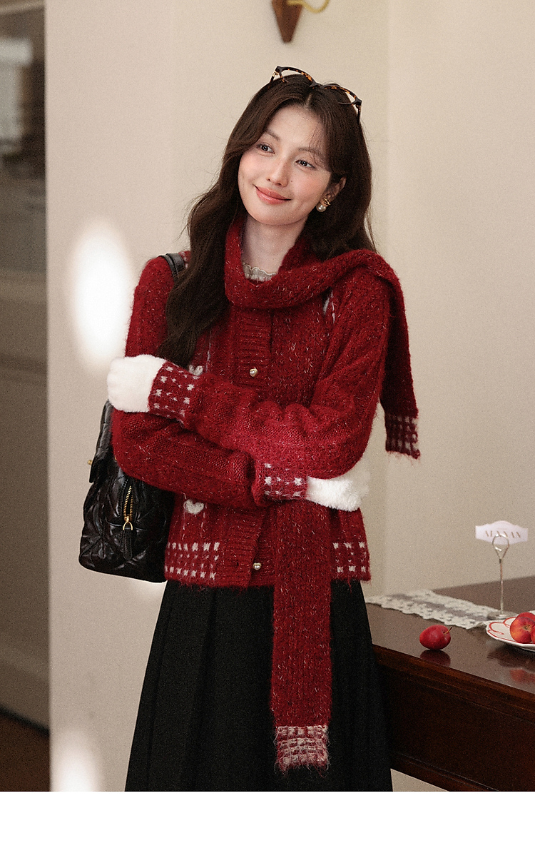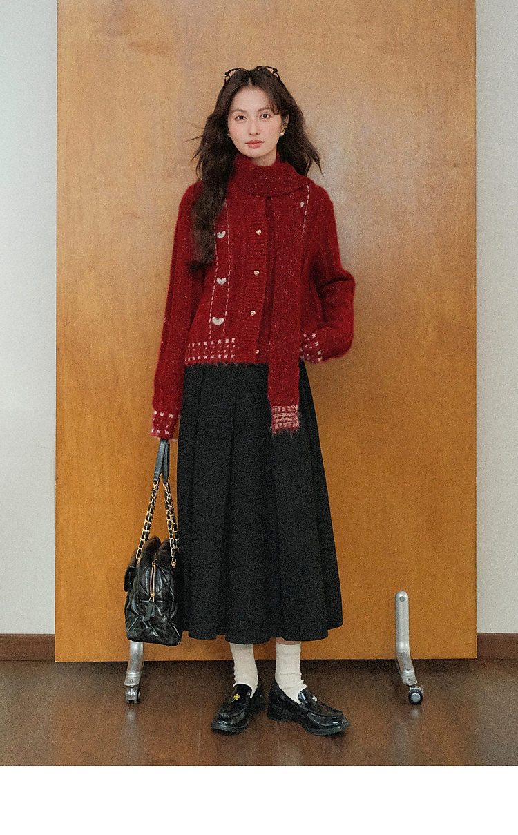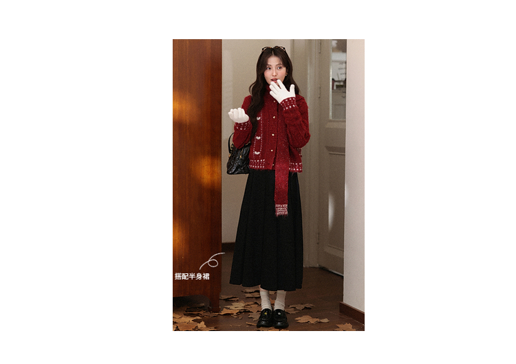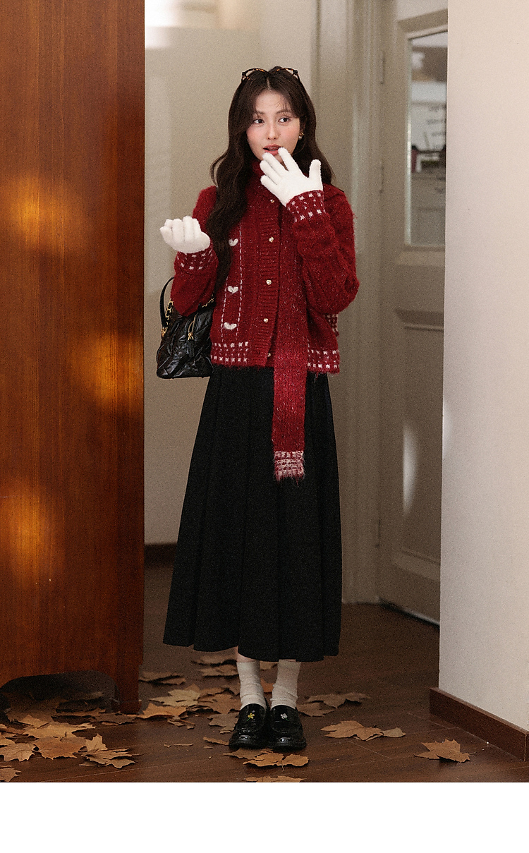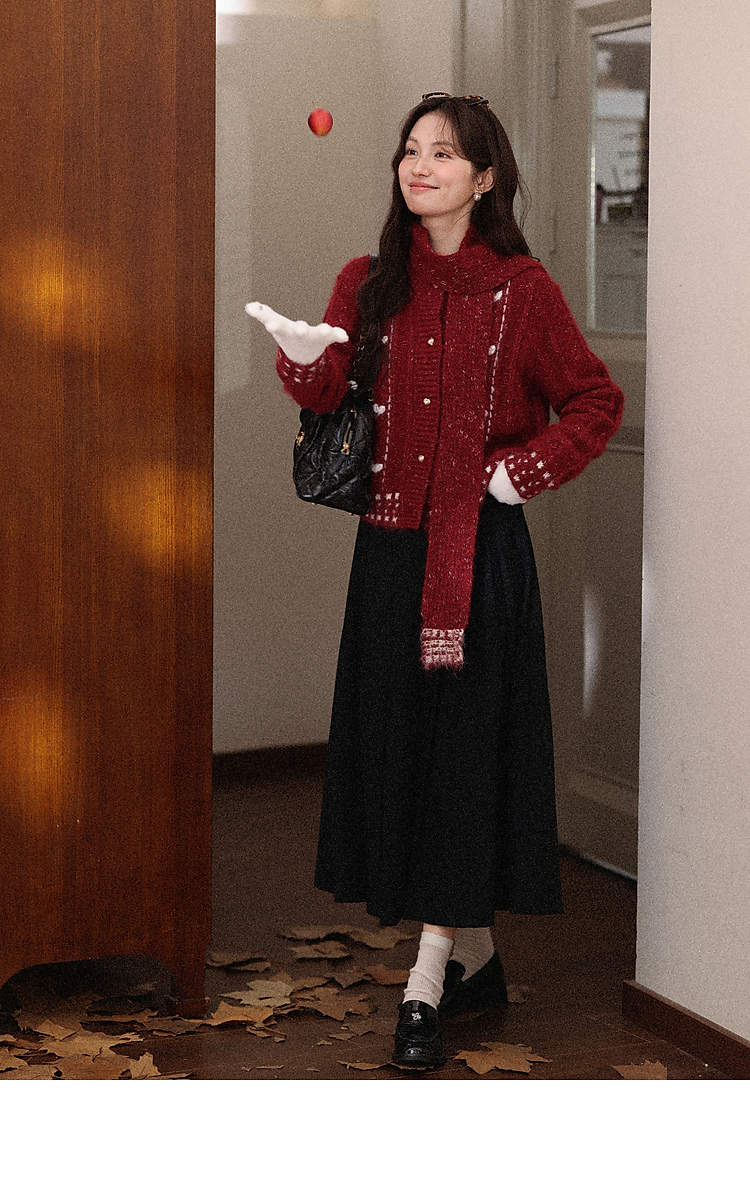 鹿向南「相思红豆」气质复古红色毛衣女秋季时尚宽松显瘦开衫外套