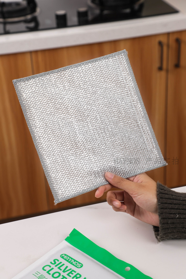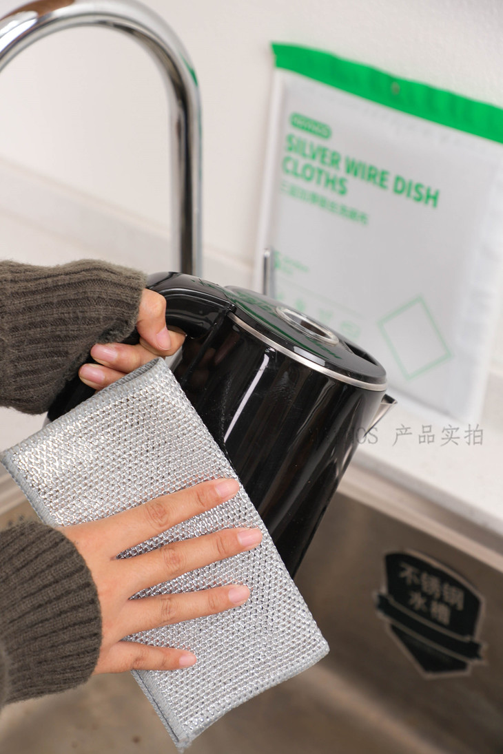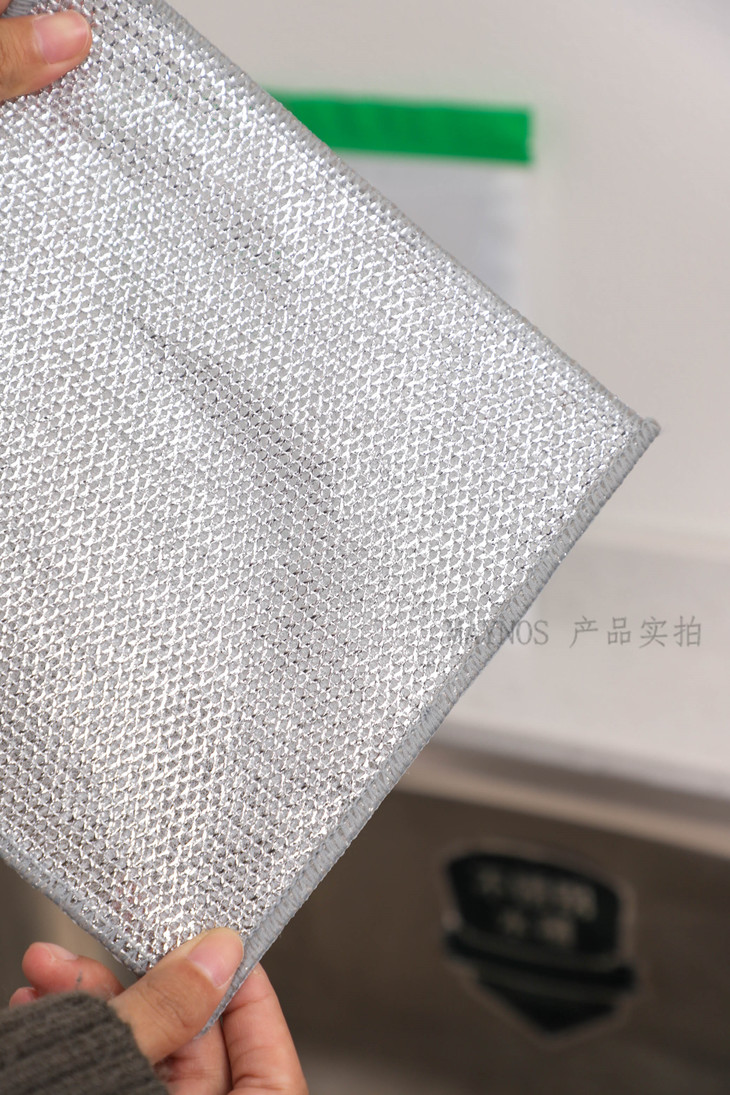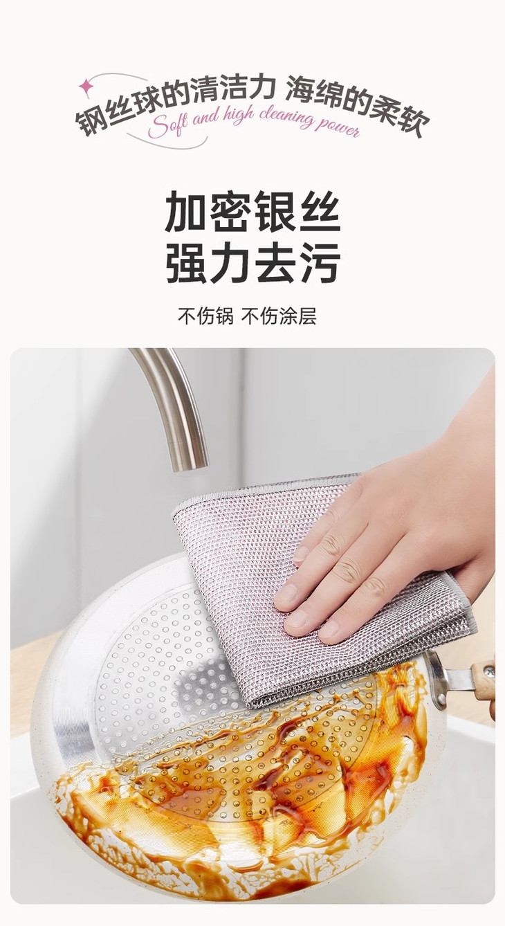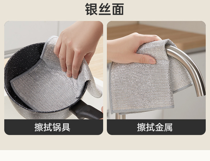 双面双效 🔺一面银丝可清洁污垢 用于擦拭锅具、灶台等 🔺一面绒毛可擦拭水渍 洗碗、擦拭桌面等 既是抹布也是钢丝球 干湿两用方便高效‼️