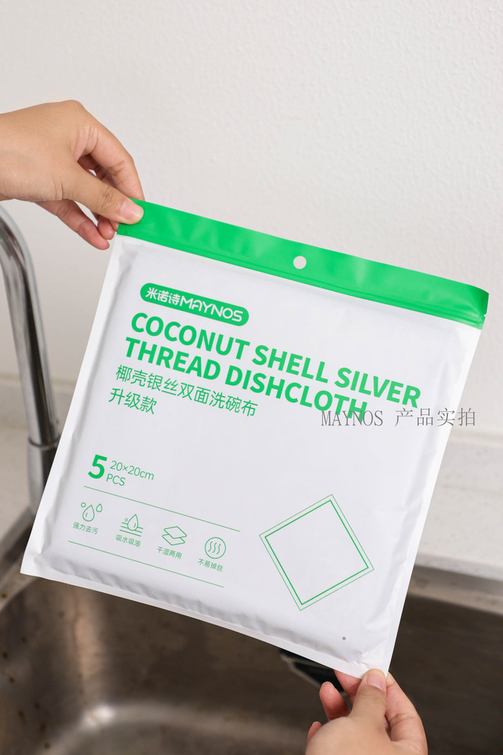 传统抹布不卫生❌ 厨房湿巾不环保❌ 钢丝球容易藏污纳垢❌ [MAYNOS 椰壳银丝双面洗碗布] 不仅不伤锅不留痕迹 而且能够轻轻松松的擦干净 还能反复使用!