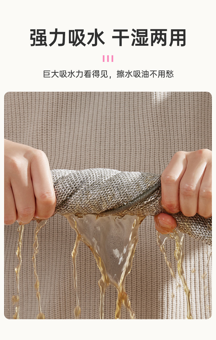之所以说它是不锈钢污渍克星 是因为个金属丝表面摩擦张力很足 本身金属丝附带清洁属性 但是比普通抹布多了柔软的摩擦力 所谓是”柔软摩擦,深度清洁”的效果👍
