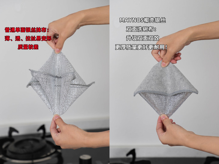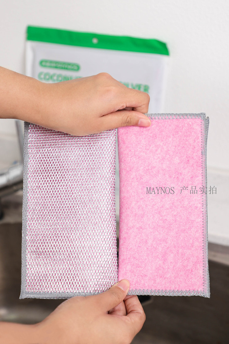 然而MAYNOS这款椰壳银丝双面洗碗布 妥妥清洁黑科技 不锈钢污渍的克星! 🔺不会刮花锅具不会掉渣 🔺丝质设计,网眼很多,可以揉出丰富泡沫 🔺双层双面加厚设计,吸水吸油一块搞定 🔺柔软可折叠,速干不发霉 🔺可水洗反复使用