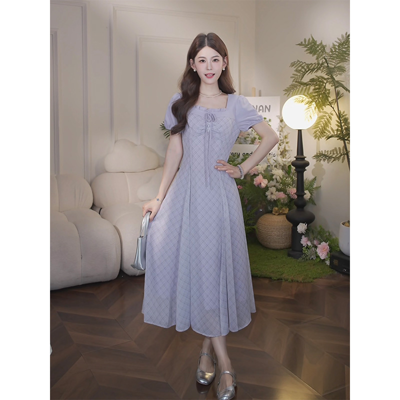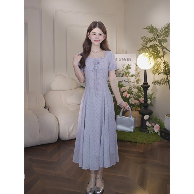 【65折秒杀】鹿向南「紫梦轻舞」法式方领连衣裙收腰显瘦夏季新款A字长裙子女DYL661857