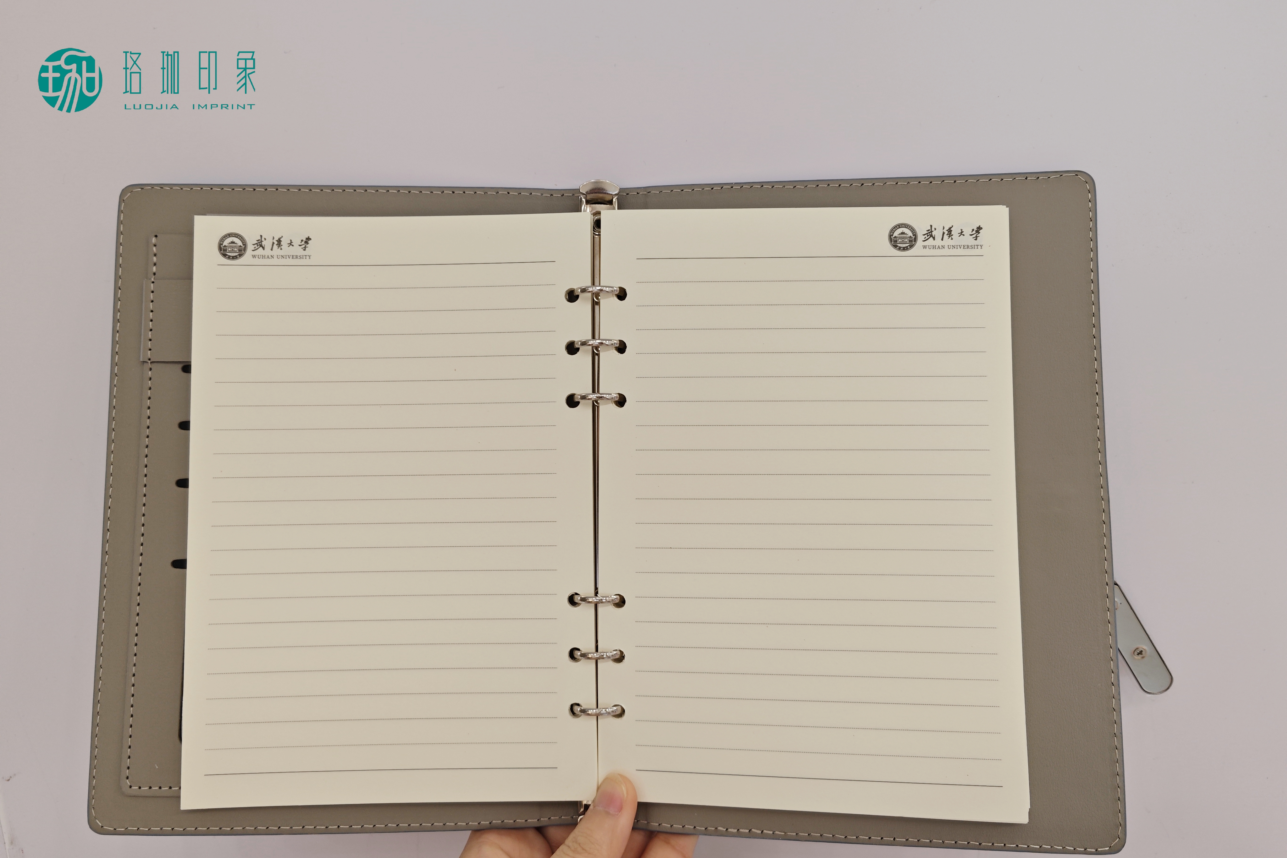 以武汉大学的精神底蕴为灵感,这款活页笔记本选用PU皮封面与双胶纸内页,推出珞珈绿与浅蓝两款配色,将百年学府的厚重与灵动融入书写日常,记录每一份思考与感动。