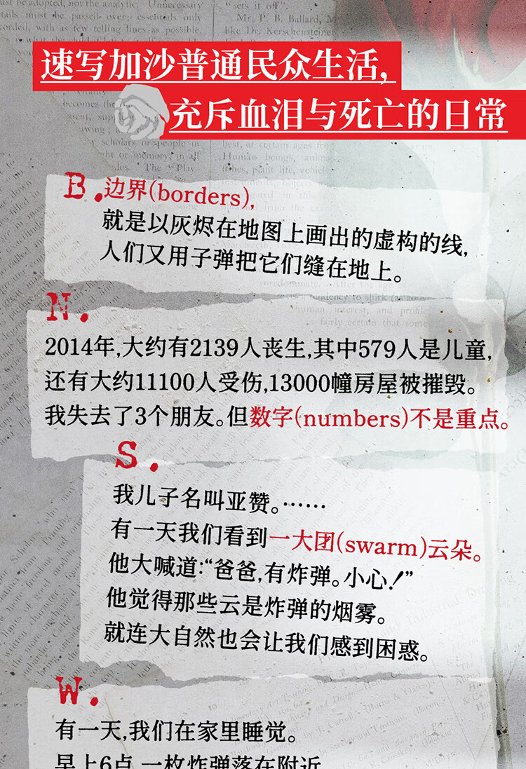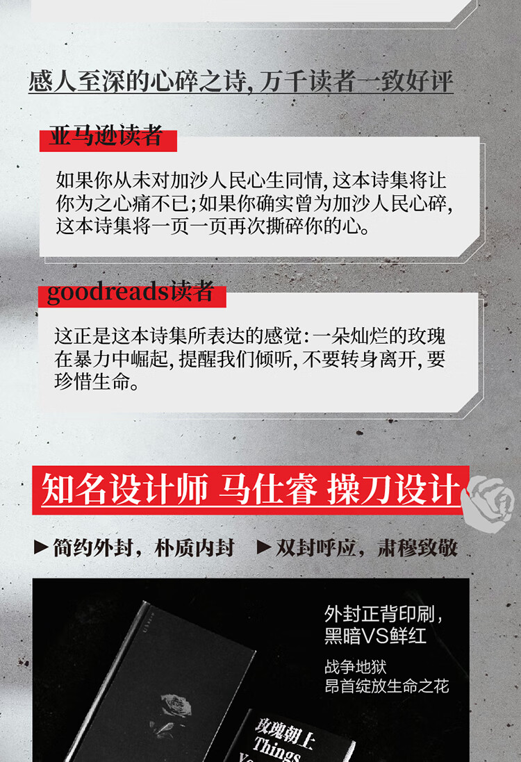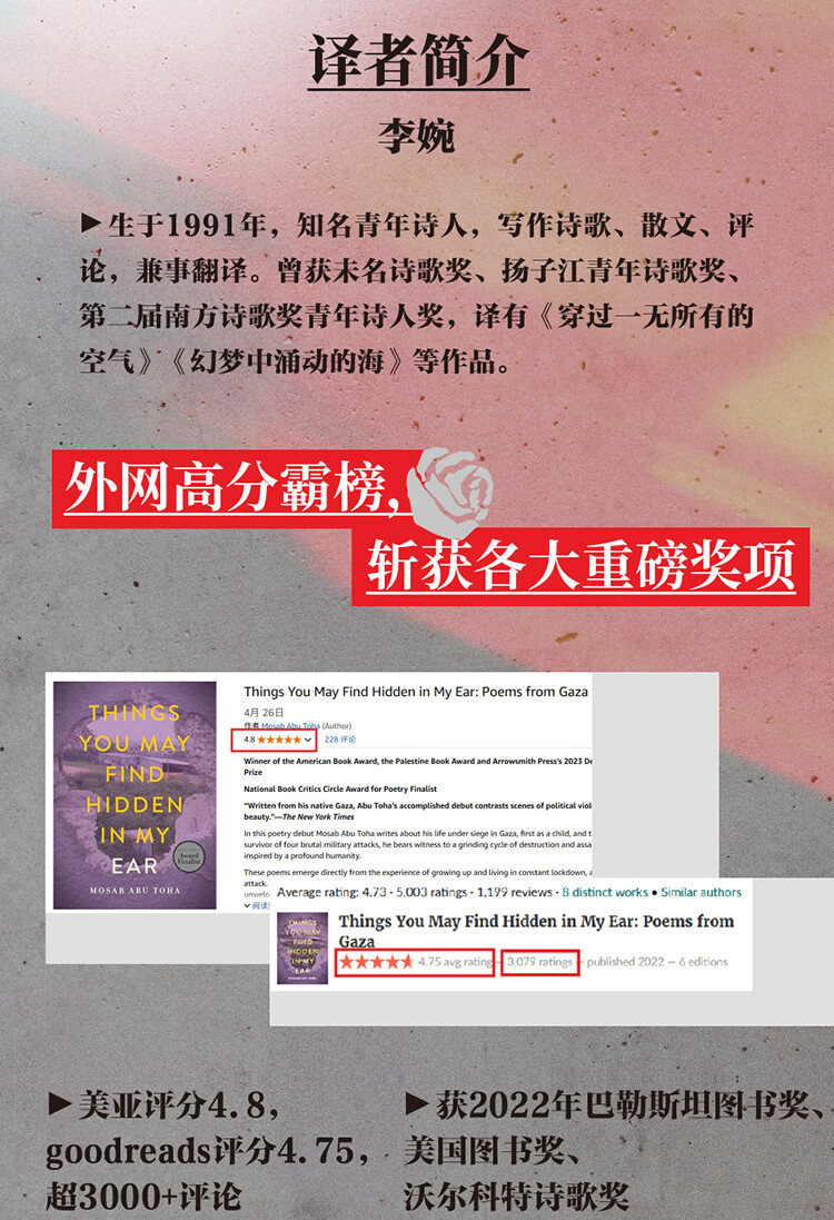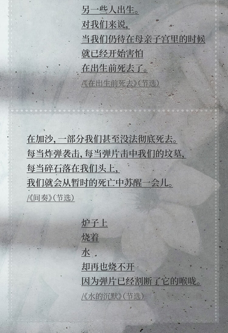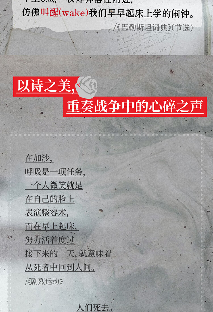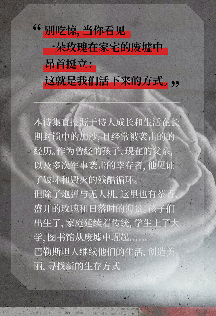 “别吃惊,当你看见一朵玫瑰在家宅的废墟中昂首挺立:这就是我们活下来的方式。”本诗集直接源于诗人成长和生活在长期封锁中的加沙,且经常被袭击的的经历。作为曾经的孩子、现在的父亲,以及多次军事袭击的幸存者,他见证了破坏和毁灭的残酷循环。但除了炮弹与无人机,这里也有茶香、盛开的玫瑰和日落时的海景。孩子们出生了,家庭延续着传统,学生上了大学,图书馆从废墟中崛起……巴勒斯坦人继续他们的生活,创造美丽,寻找新的生存方式。诗人在本书开头以《巴勒斯坦词典》速写了巴勒斯坦的民众生活,展现了巴勒斯坦人民的集体记忆,并在《作者访谈》中讨论了诗人自己在加沙的经历、他的家庭起源以及他如何走上了诗歌创作的道路。与作者年纪相仿的青年诗人、译者李琬为本书倾情写作了译后记,更充分地介绍和阐释了本书的意义。