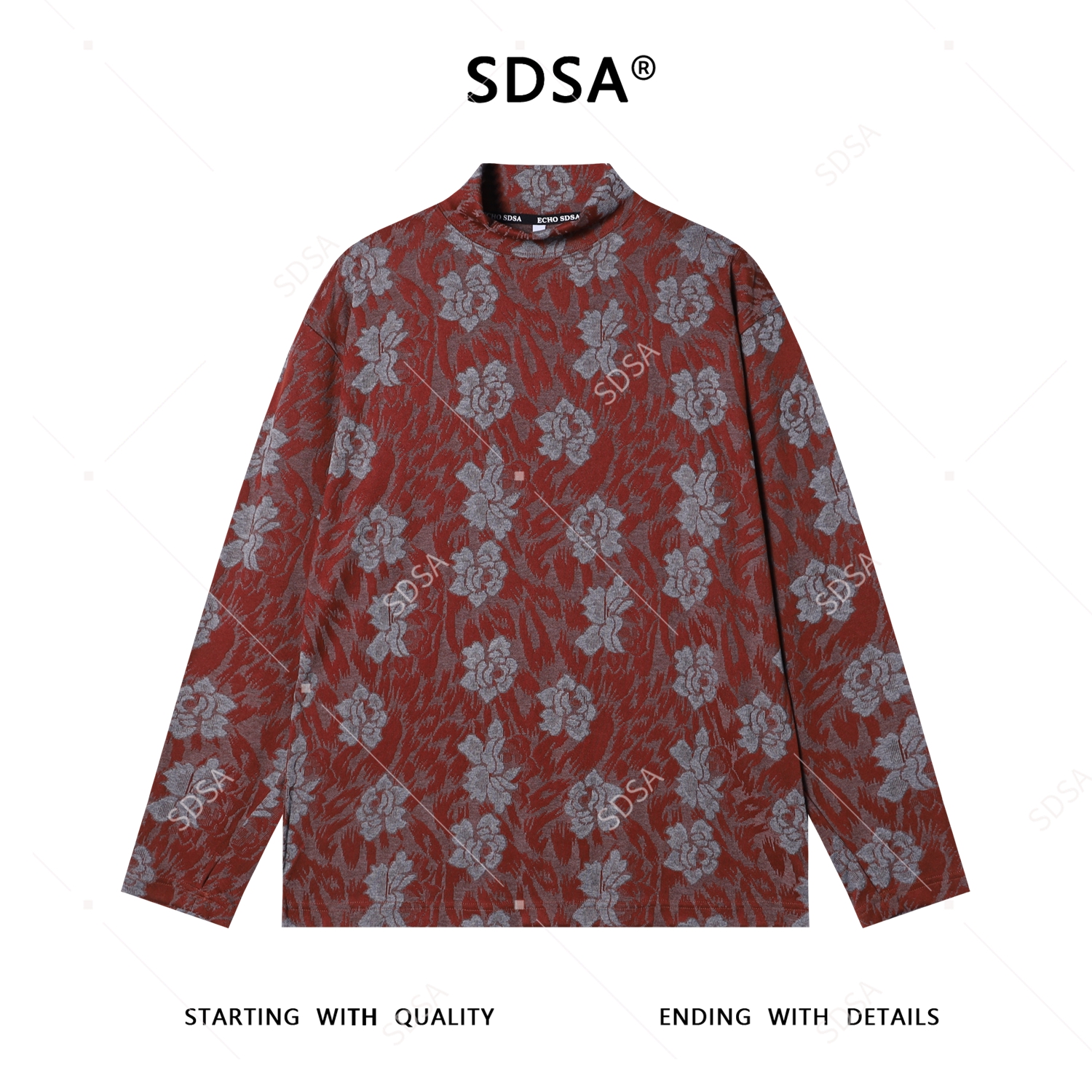 T4856SDSA秋冬新款痞帅男装简约撞色满印花朵半高领长袖T恤百搭复古