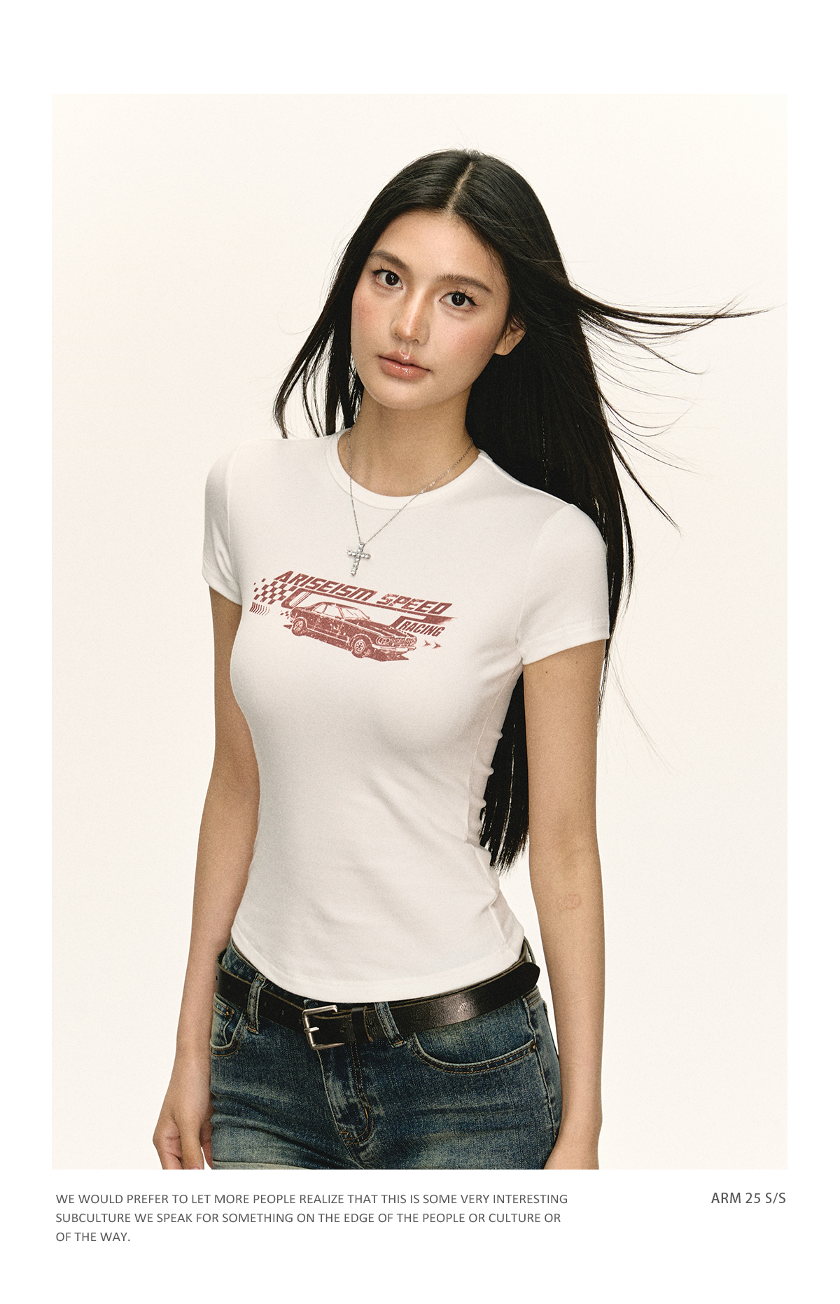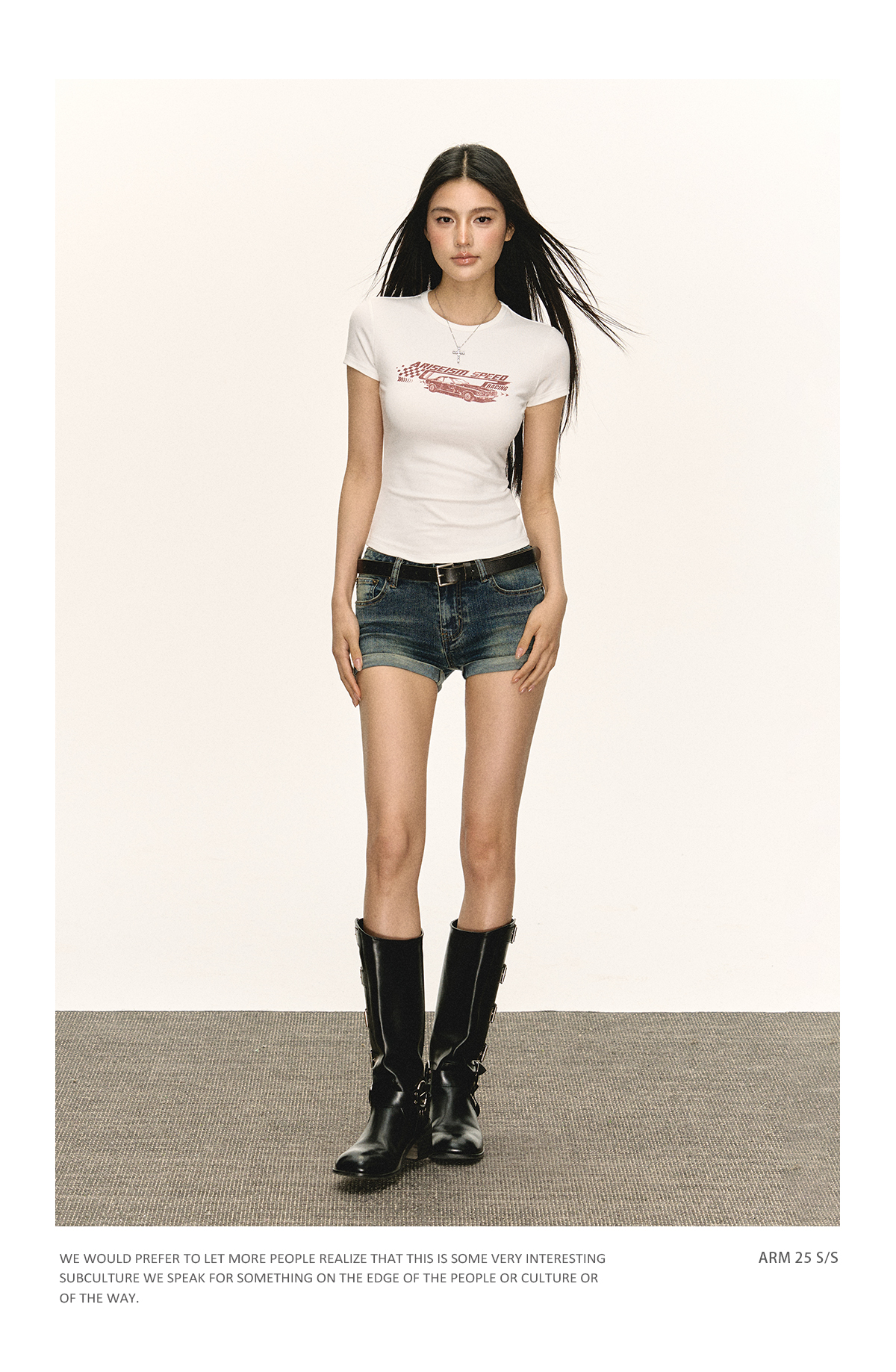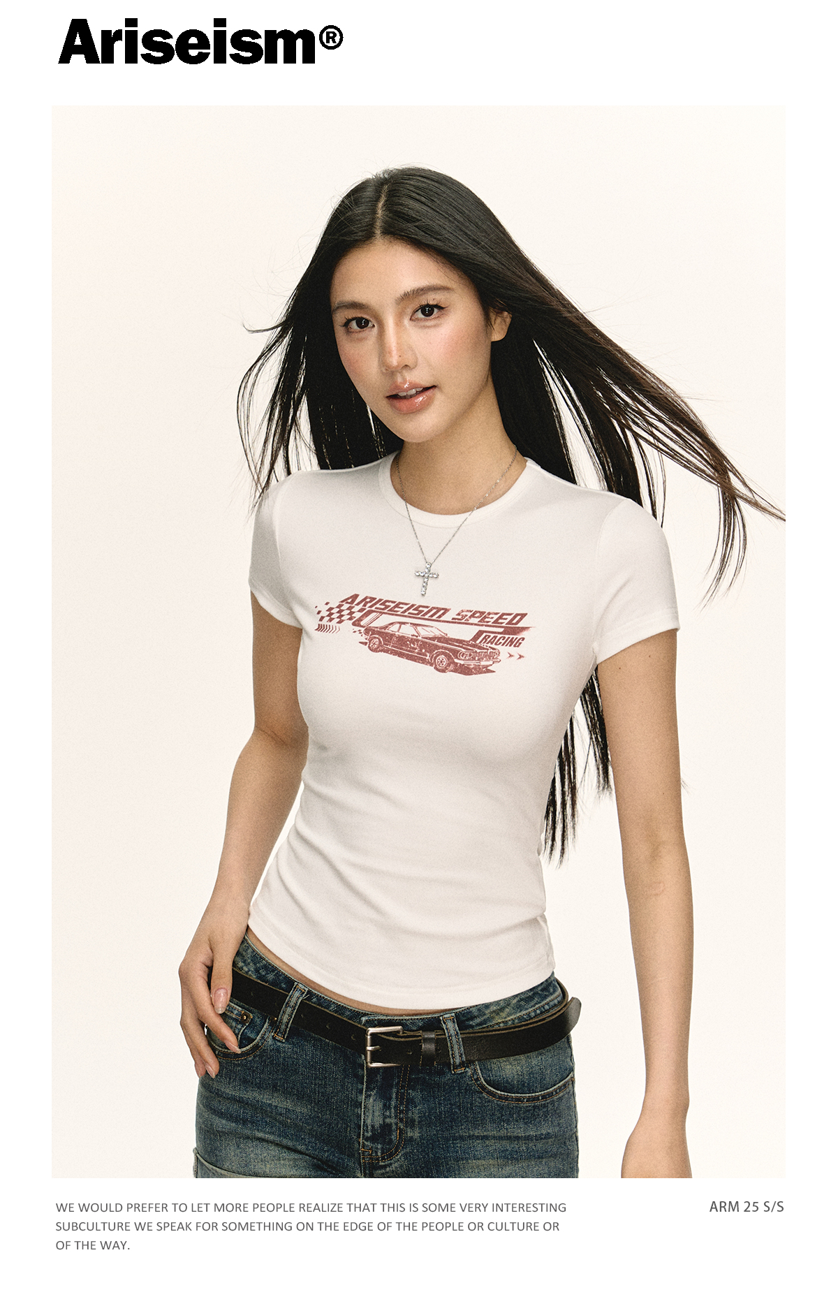 Ariseism 美式复古辣妹红色正肩短袖T恤女2025夏季新款修身上衣