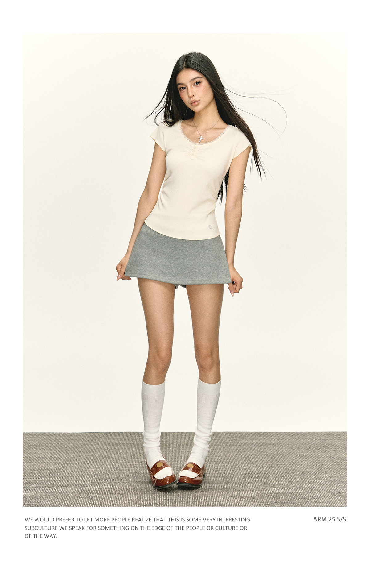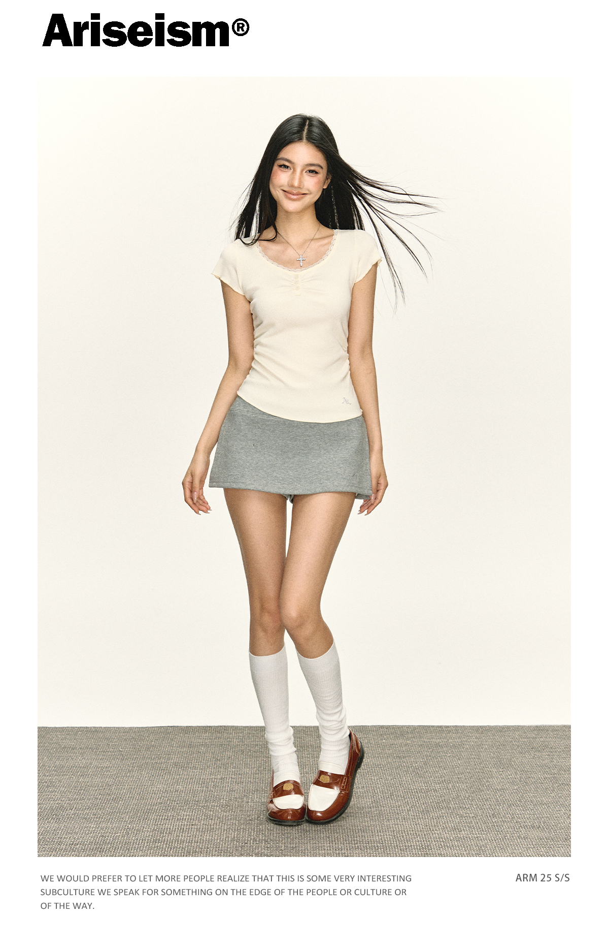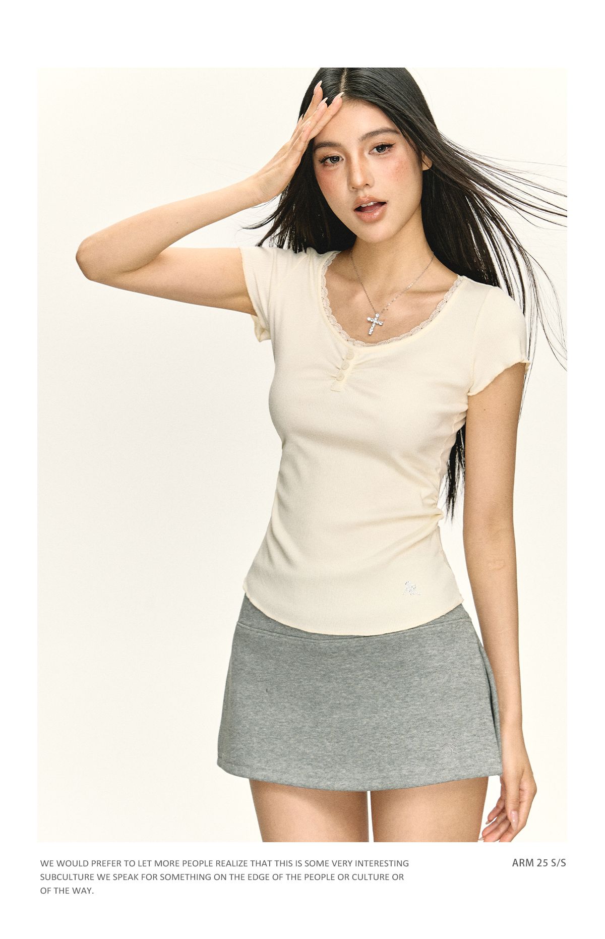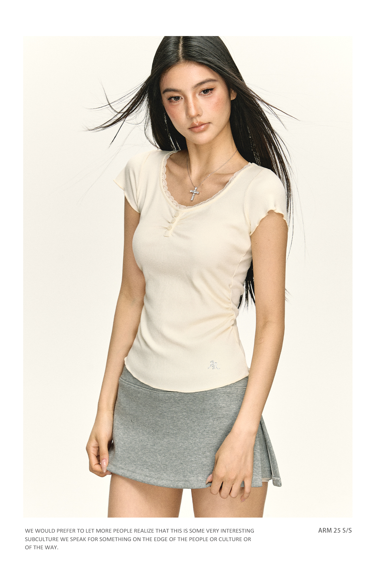 Ariseism 美式复古设计感奶黄色蕾丝边边短袖t恤女夏季新款