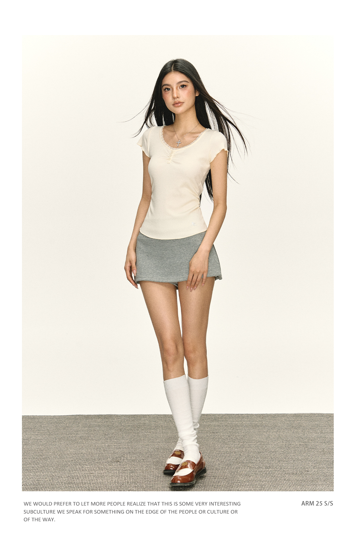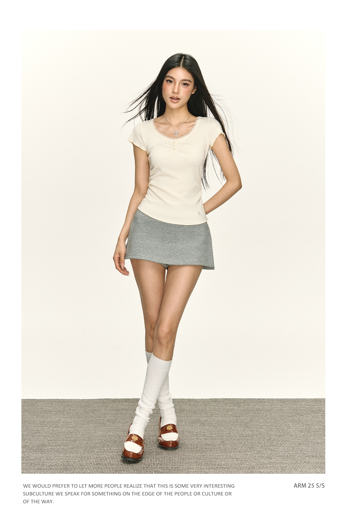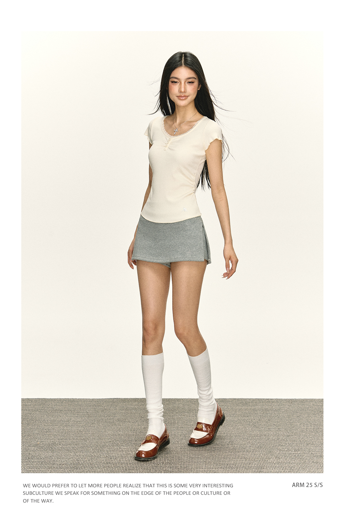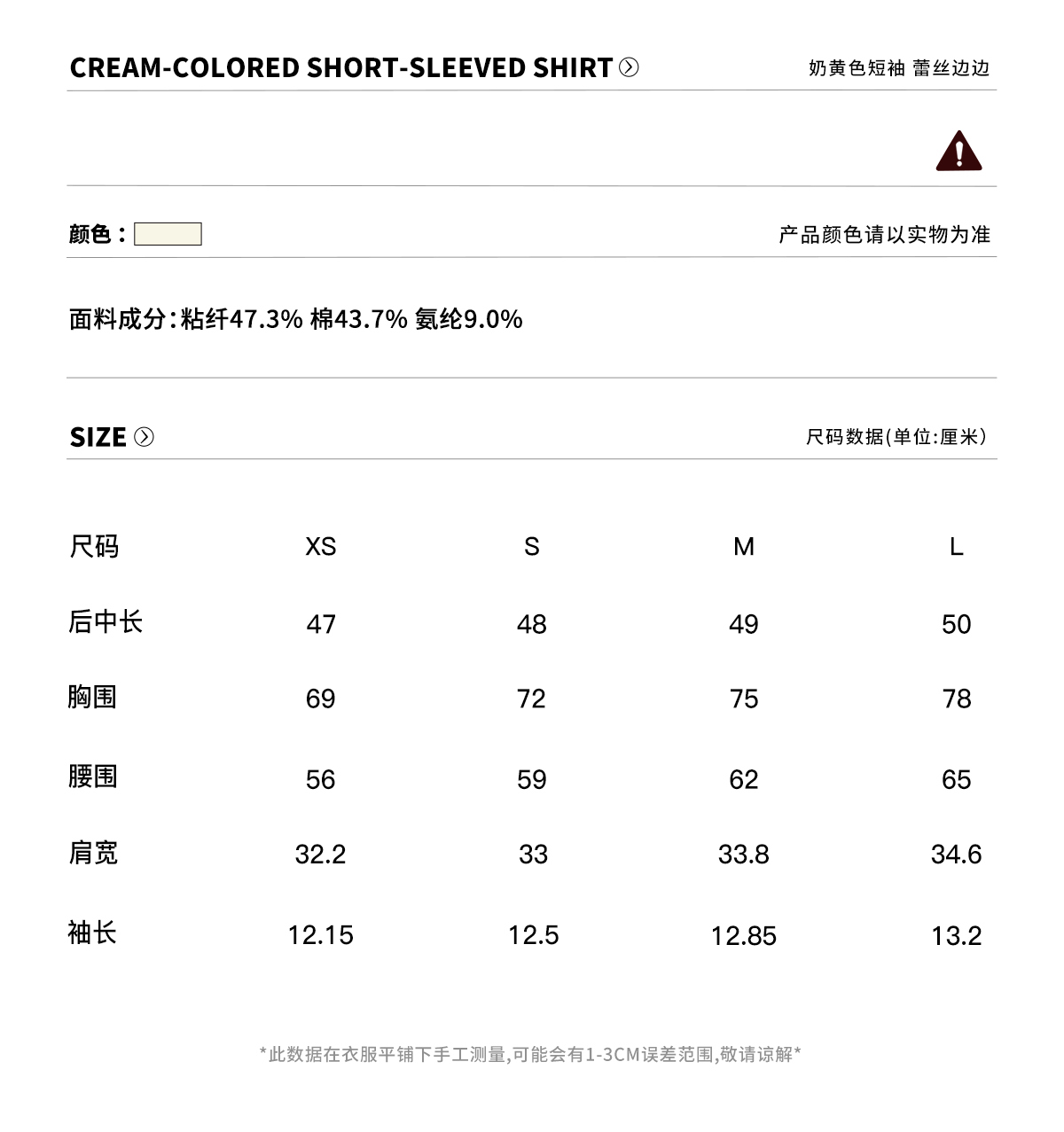 Ariseism 美式复古设计感奶黄色蕾丝边边短袖t恤女夏季新款